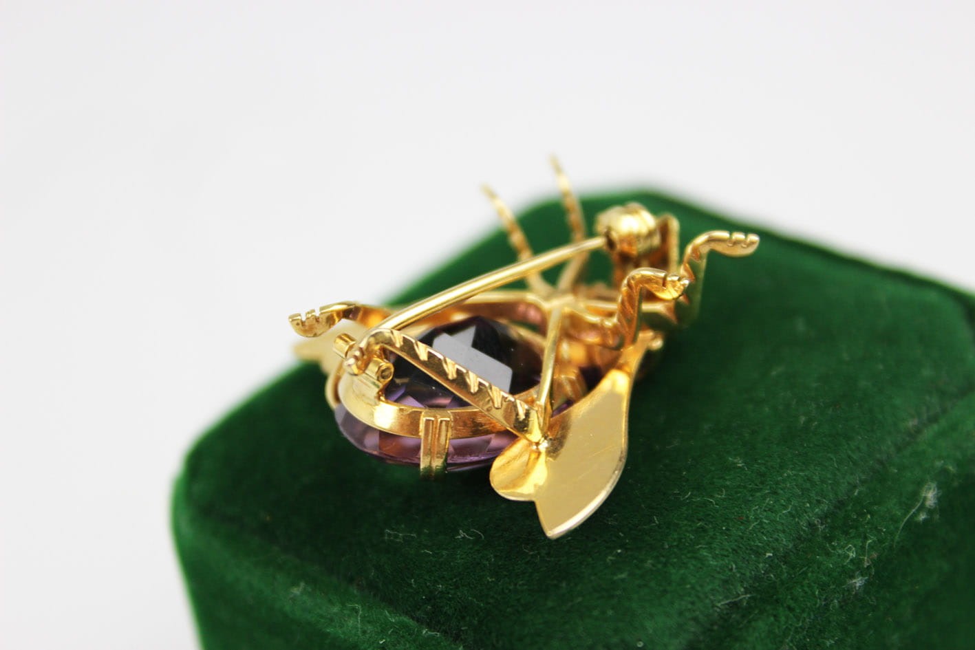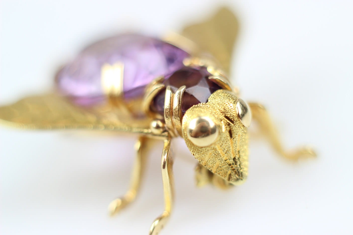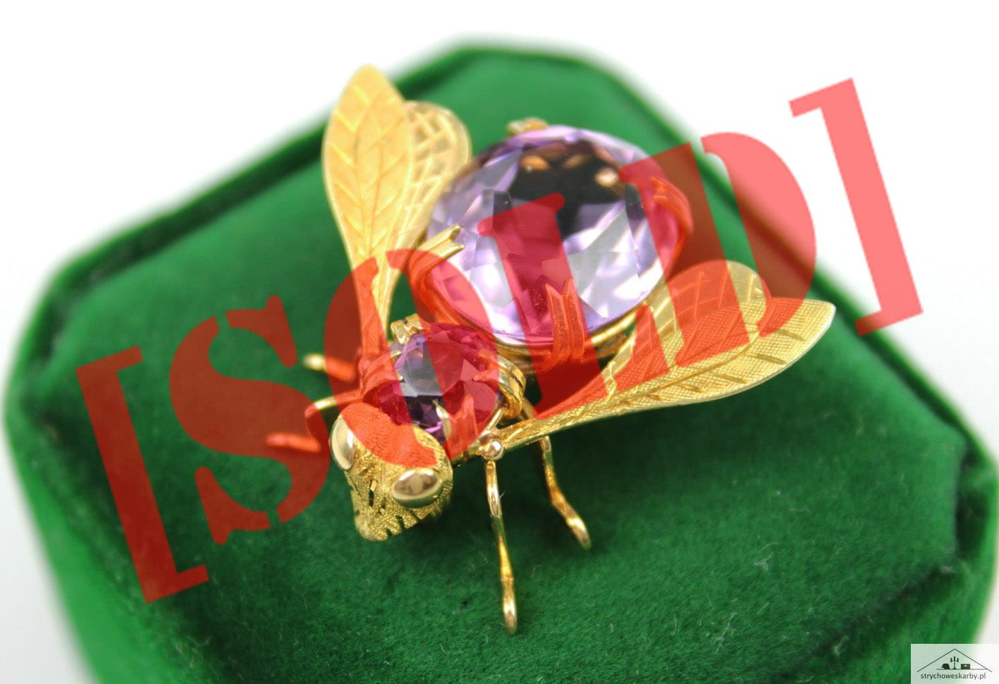 Unikalna broszka z lat 50/60 tych XX wieku w formie muchy będąca powtórką wyrobów wiktoriańskich. Broszka wykonana w wysokogatunkowym złocie próby 750, sygnowana na spodzie skrzydła puncą 18k i kameryzowana naturalnym ametystami w szlifie fasetowym. Broszka w idealnym stanie zachowania. Zapięcie z dodatkowym zabezpieczeniem uniemożliwiającym przypadkowe odpięcie i zgubienie. Wymiary: