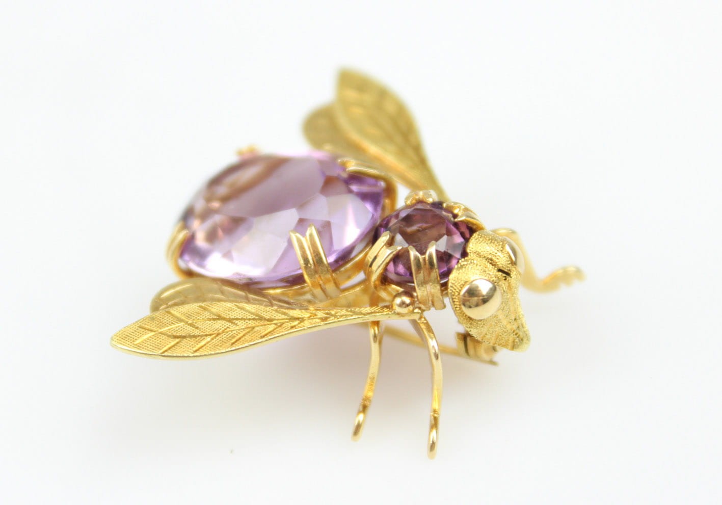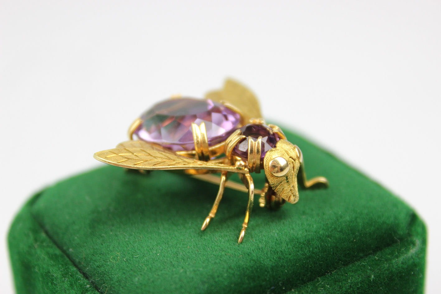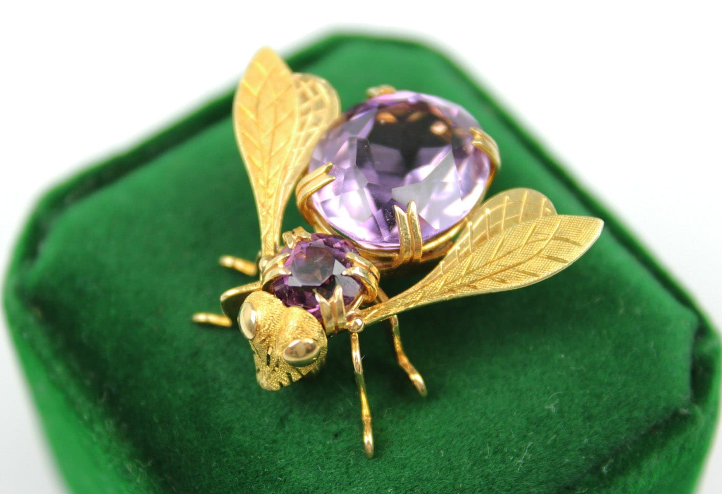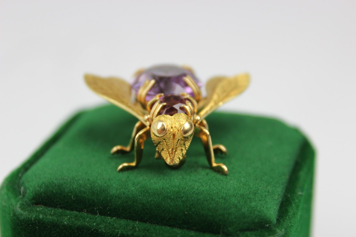 Unikalna broszka z lat 50/60 tych XX wieku w formie muchy będąca powtórką wyrobów wiktoriańskich. Broszka wykonana w wysokogatunkowym złocie próby 750, sygnowana na spodzie skrzydła puncą 18k i kameryzowana naturalnym ametystami w szlifie fasetowym. Broszka w idealnym stanie zachowania. Zapięcie z dodatkowym zabezpieczeniem uniemożliwiającym przypadkowe odpięcie i zgubienie. Wymiary: