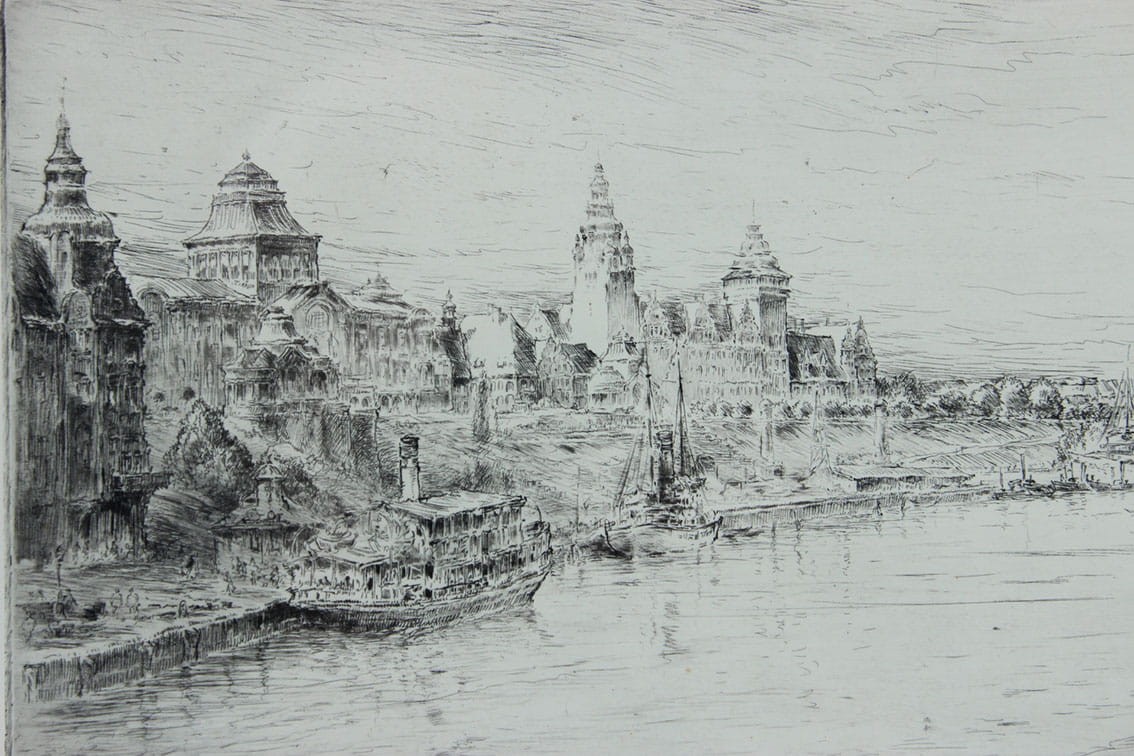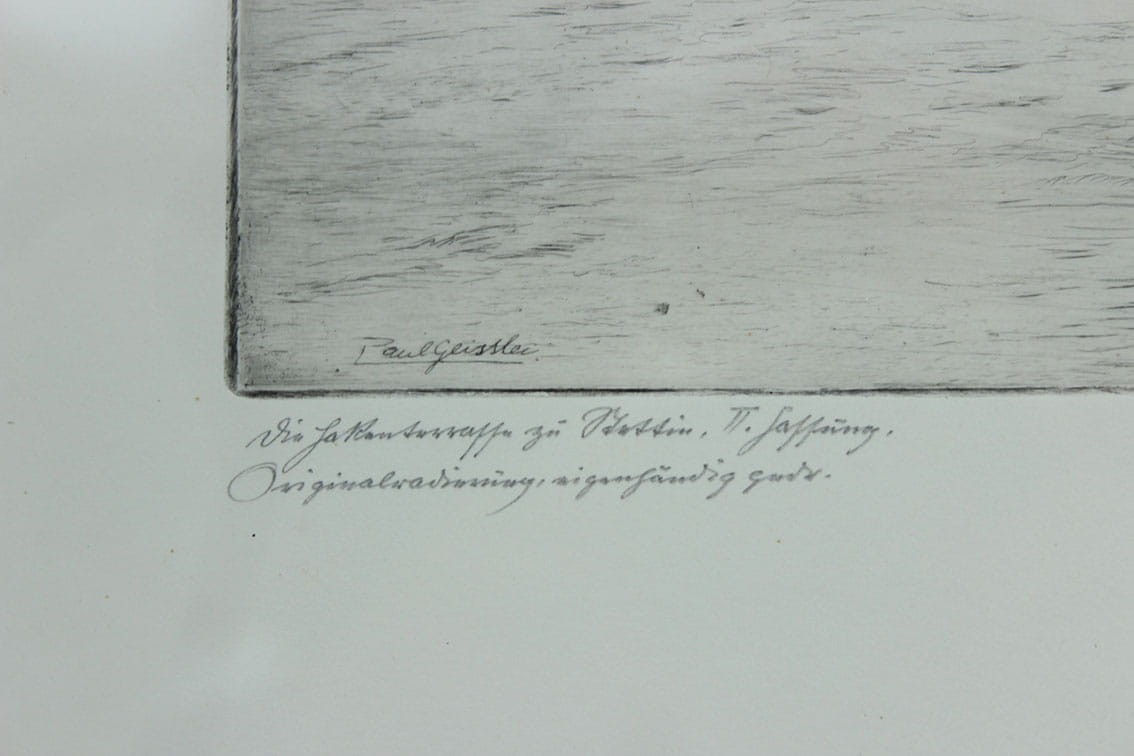Przepiękna akwaforta przedstawiająca widok na Odrę oraz Wały Chrobrego w Szczecinie wykonana przez profesora Paula Geisslera. Praca podpisana przez artystę ołówkiem w prawym dolnym rogu. Całość za szkłem w drewnianej ramie. Wymiary: