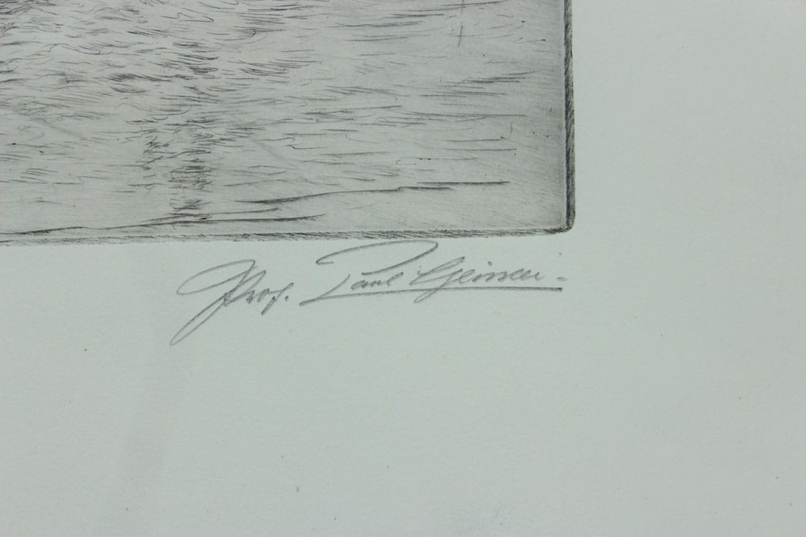 Paul Geissler (1881 - 1965): Grafik i malarz Paul Geissler urodził się w Erfurcie w Niemczech. Studiował w Akademii Sztuk i Rzemiosła w Erfurcie, a następnie w Akademii Sztuki w Weimarze pod kierunkiem Maxa Thedy. Jego wczesne zainteresowanie malarstwem ustąpiło miejsca akwaforcie, medium, z którego jest najbardziej znany. W latach dwudziestych i trzydziestych XX wieku Geissler dużo podróżował po Europie i Stanach Zjednoczonych, tworząc obszerną grafikę przedstawiającą główne punkty orientacyjne dużych miast, w tym Nowego Jorku. Zmarł w Garmisch.