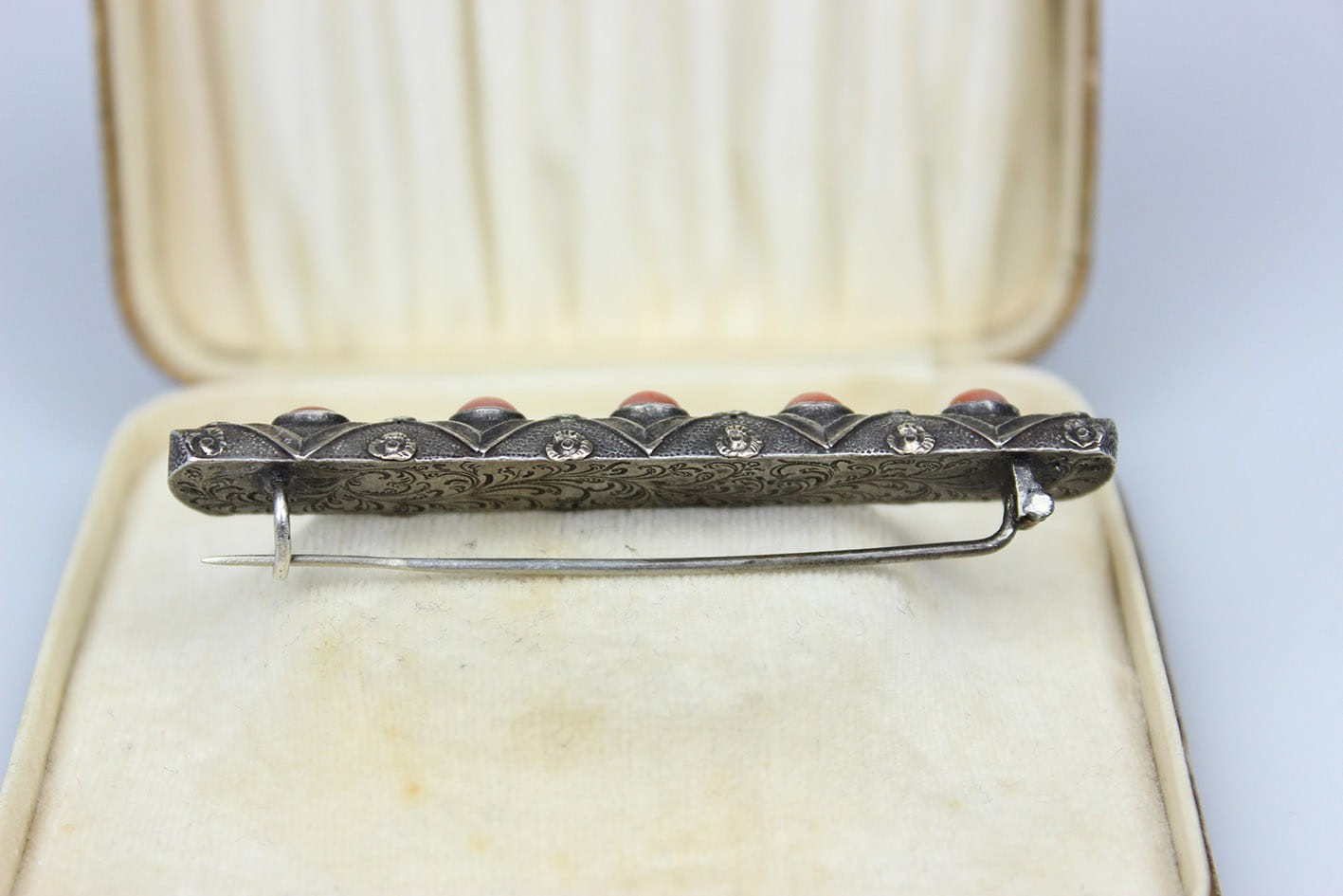Oryginalna, bogato zdobiona broszka z przełomu XIX i XX wieku. Wyrób francuski wykonany w srebrze próby 800, ozdobiony pięcioma pastylkami korala szlachetnego w szlifie kaboszonowym. Rewers grawerowany. Zapięcie typu " C". Wymiary: