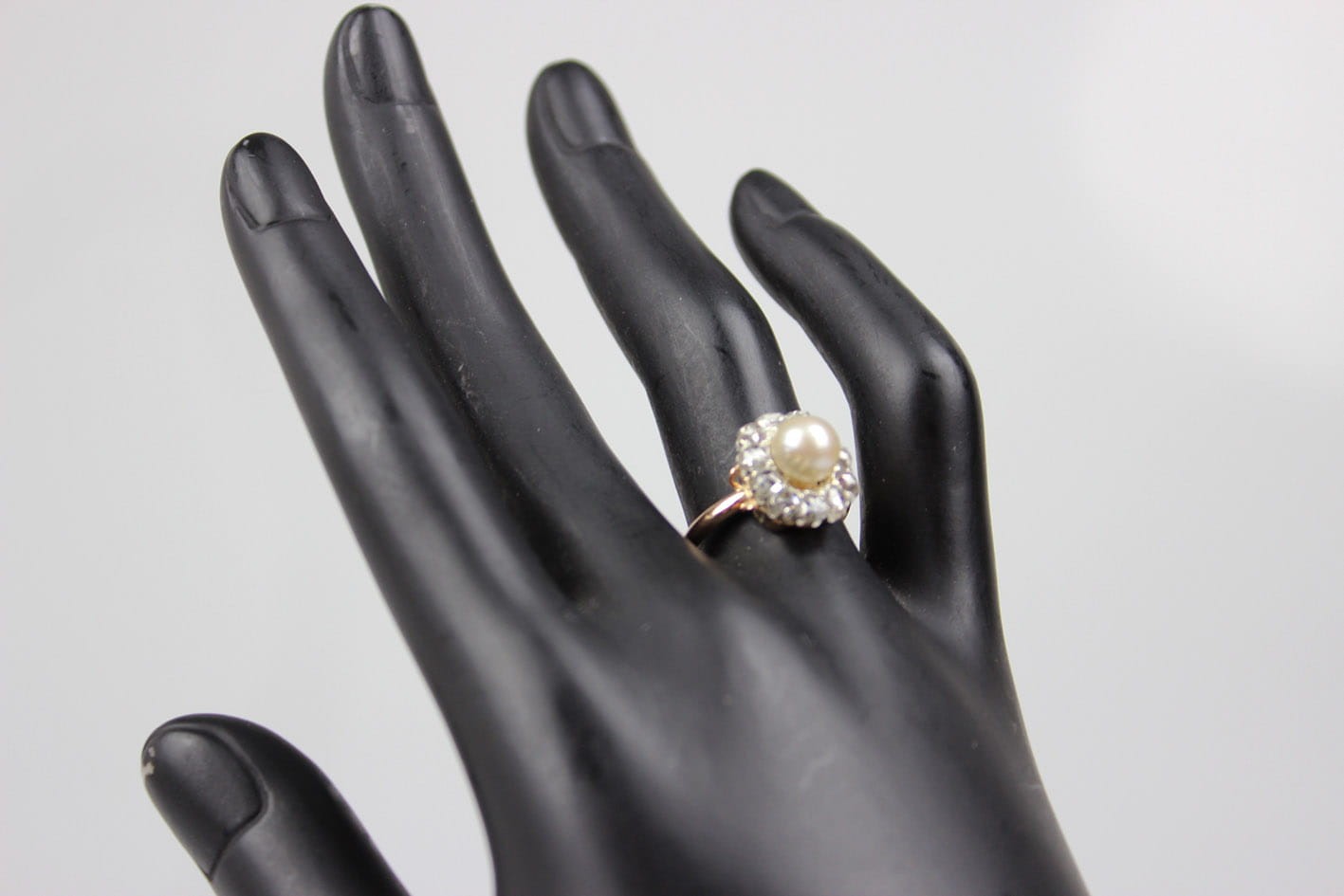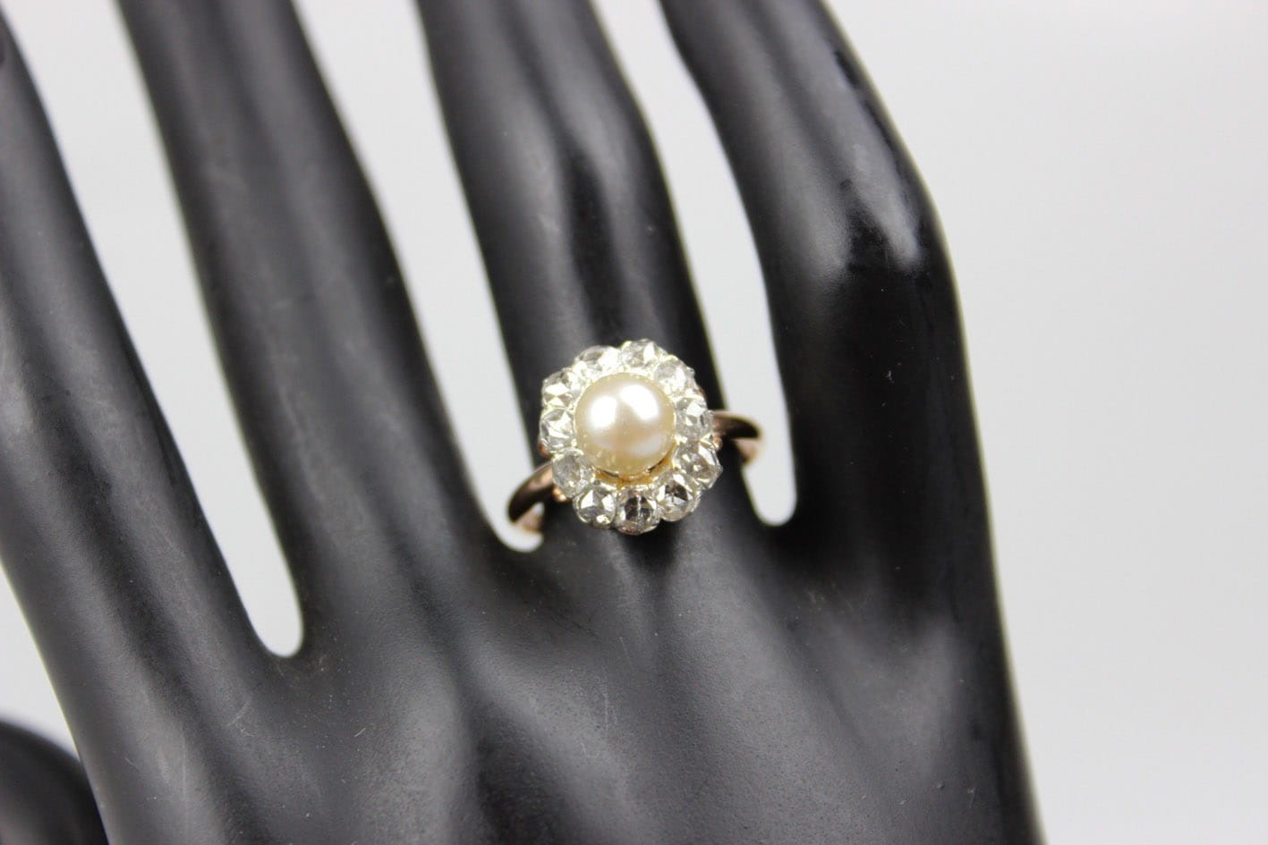 Zachwycający pierścionek z diamentami pochodzący z przełomu XIX i XX wieku. Konstrukcja w złocie 585 oraz srebrze pr.900 ( brak punc- badanie laboratoryjne wykonane przez eksperta). Główka ładnie wyeksponowana poza obrys palca, kameryzowana jedenastoma diamentami o kształcie zbliżonym do okrągłego w szlifie rozetowym. Masa łączna kamieni to ok. 0,75 karata. Dodatkowo centralną część główki zdobi słonowodna, hodowana perła o formie kulistej i barwie kremowo- białej. Pierścionek w bardzo dobrym stanie zachowania. Wymiary: