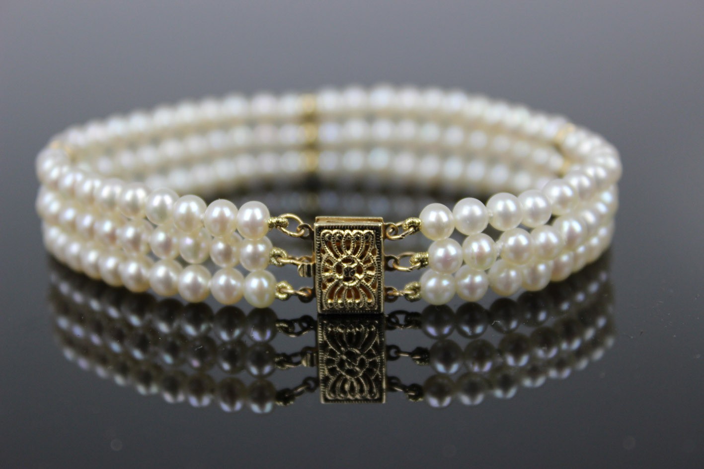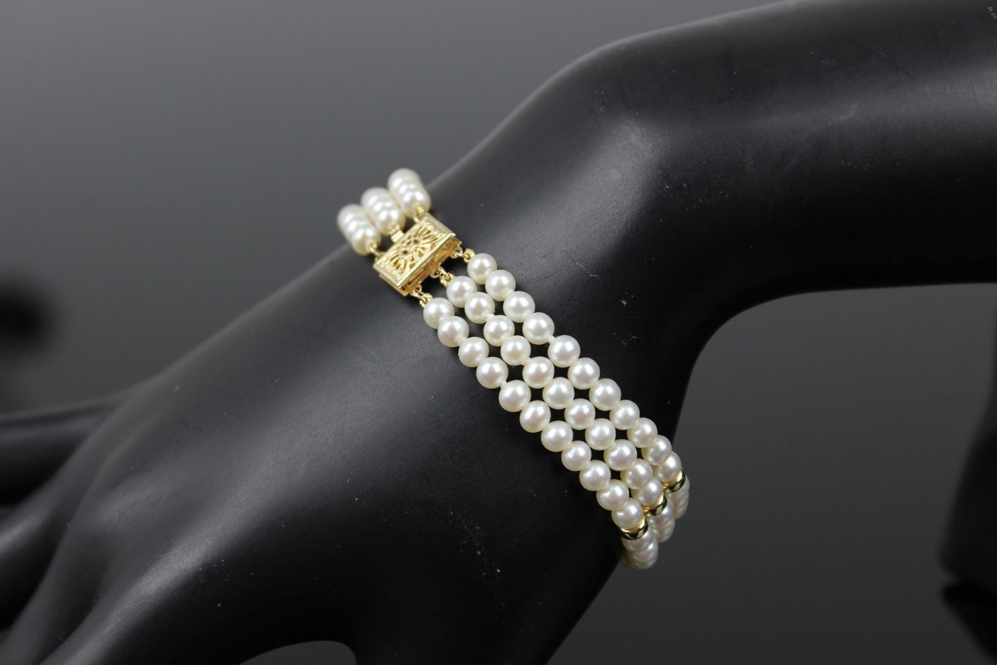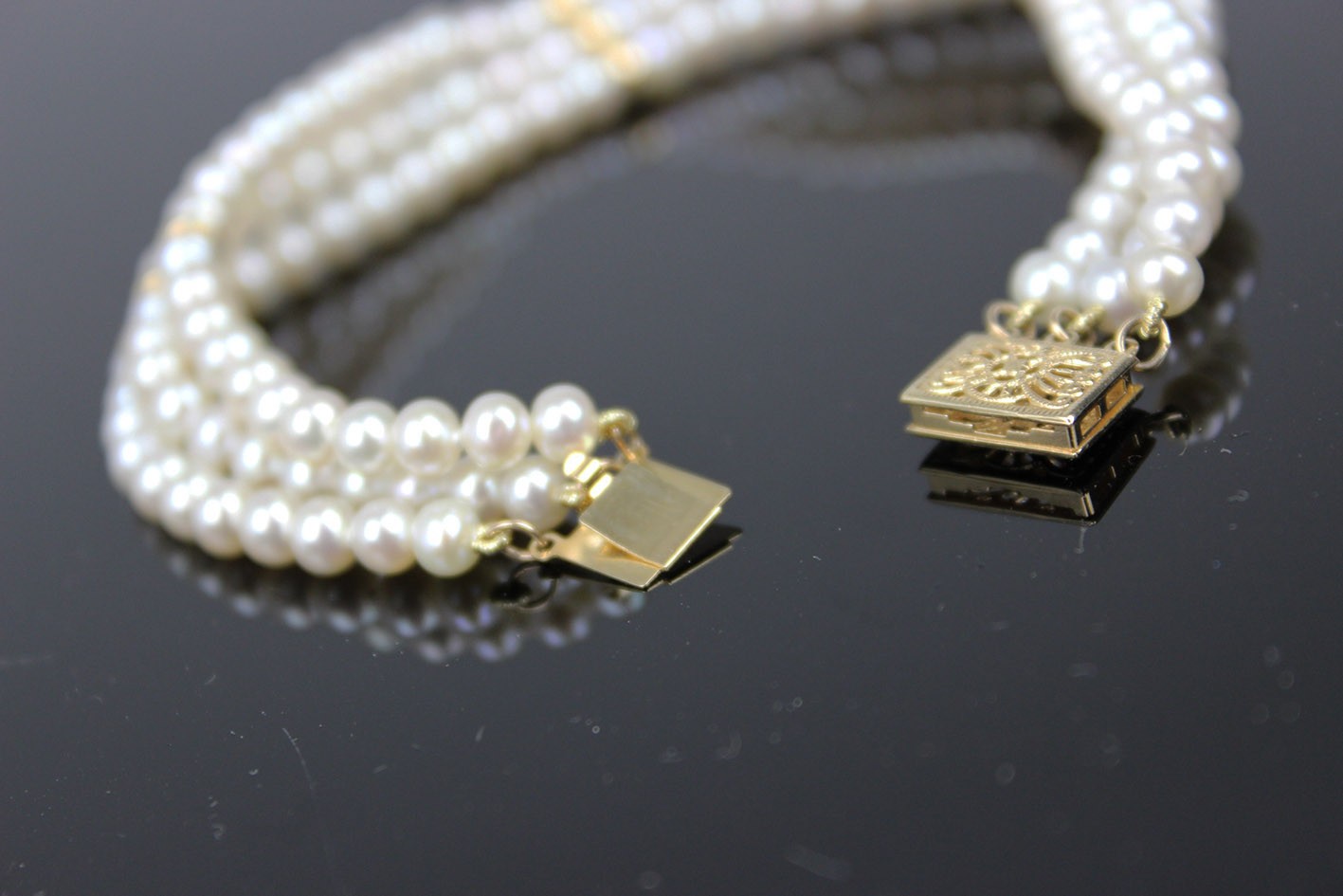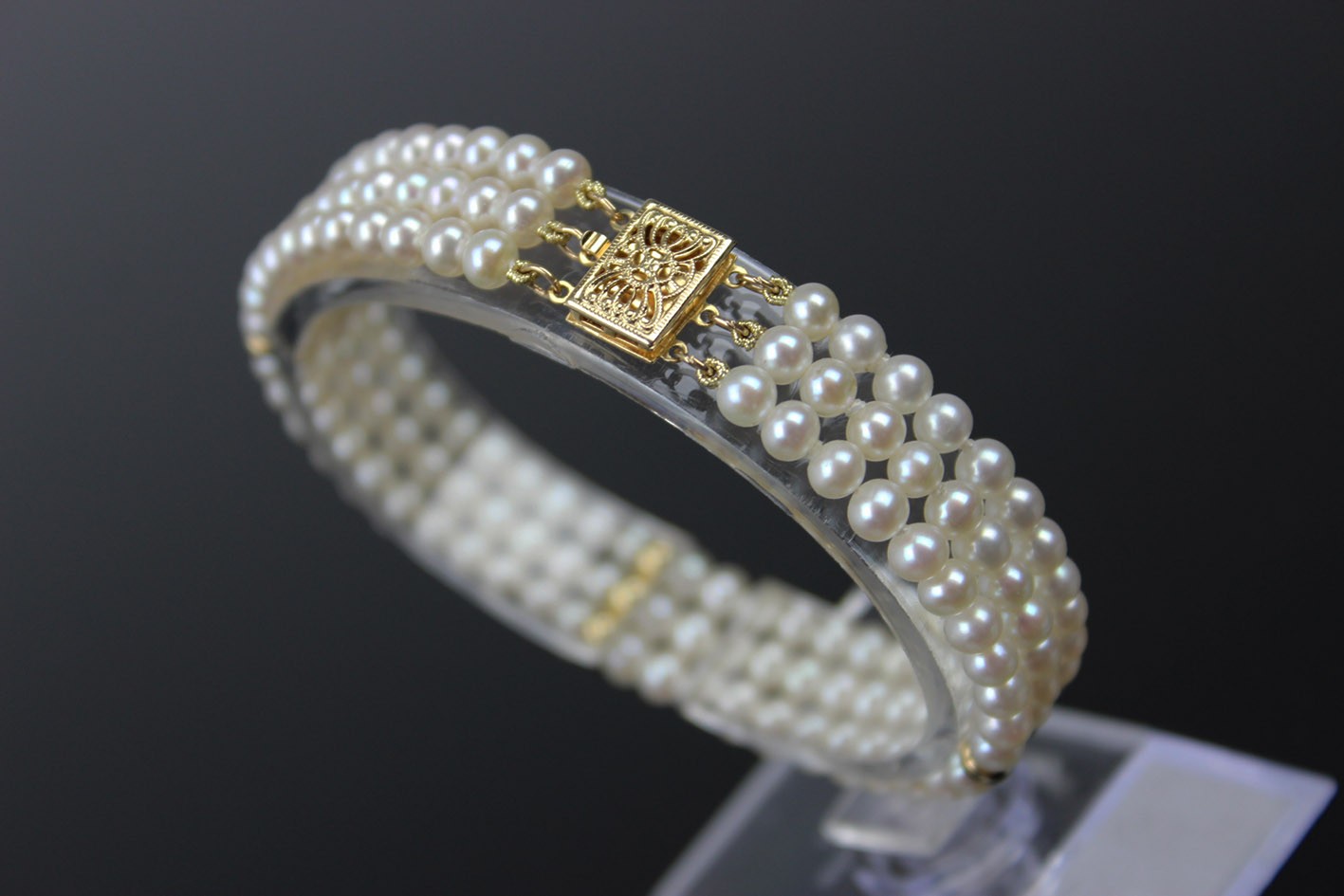 Bogata bransoletka z lat 30 tych XX wieku, wykonana z trzech sznurów pereł ze złotym zapięciem. Główny element bransoletki stanowią 132 perły hodowane, słodkowodne o kulistej, spłaszczonej formie, dobrym połysku i srebrzysto kremowej barwie. Zapięcie szufladkowe o ażurowej formie wykonane ze złota próby 585 ( 14 karatów). Stan zachowania bardzo dobry. Wymiary: