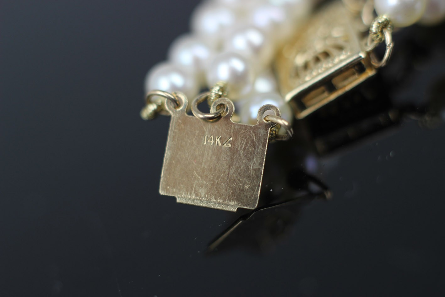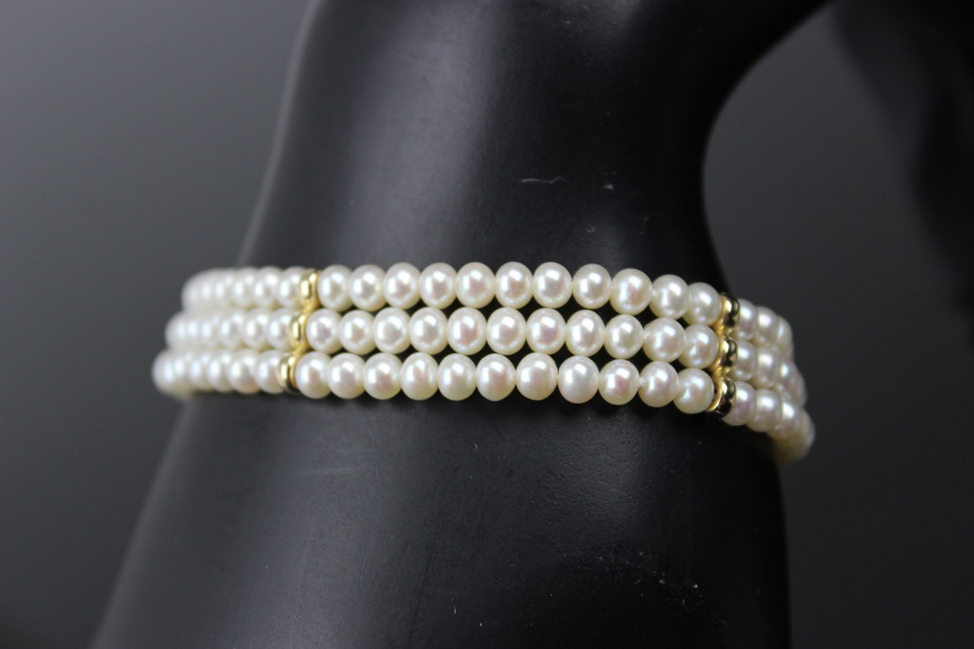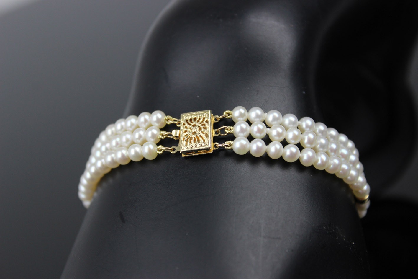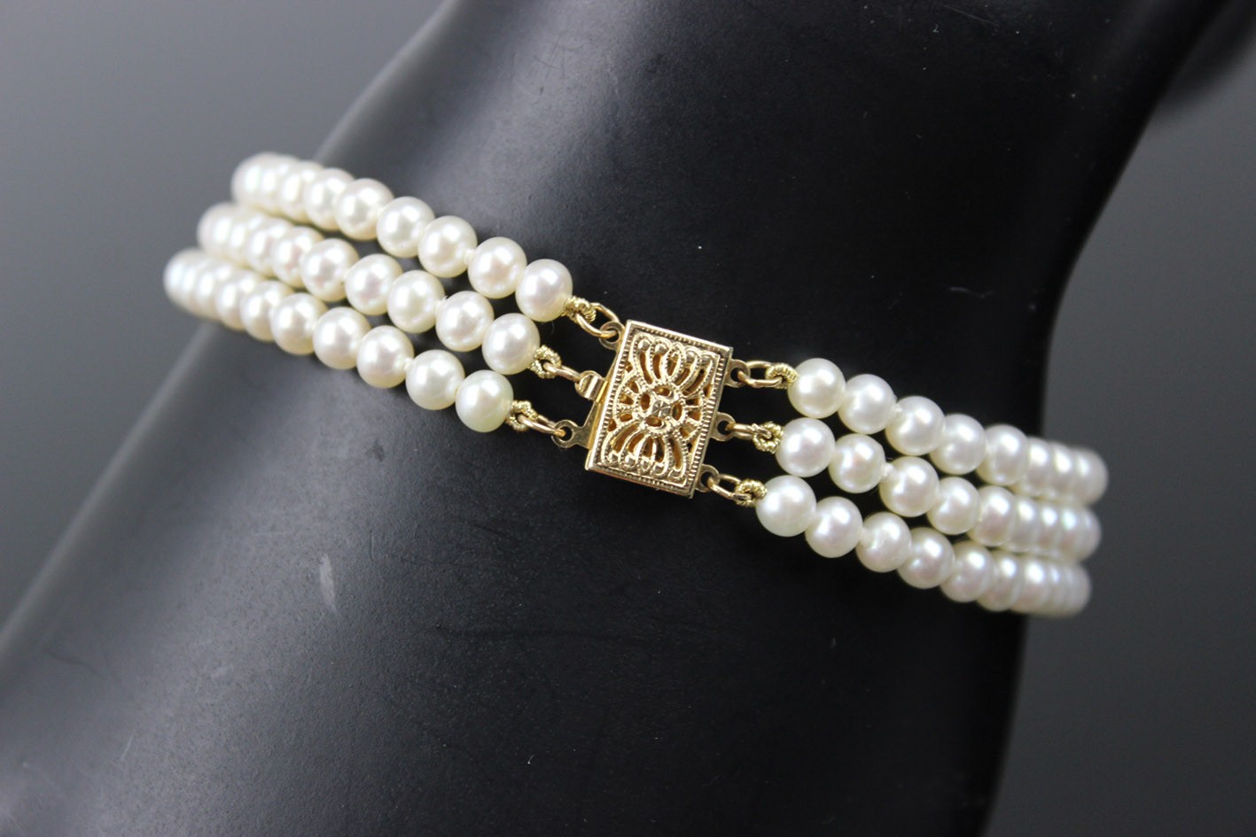 Bogata bransoletka z lat 30 tych XX wieku, wykonana z trzech sznurów pereł ze złotym zapięciem. Główny element bransoletki stanowią 132 perły hodowane, słodkowodne o kulistej, spłaszczonej formie, dobrym połysku i srebrzysto kremowej barwie. Zapięcie szufladkowe o ażurowej formie wykonane ze złota próby 585 ( 14 karatów). Stan zachowania bardzo dobry. Wymiary: