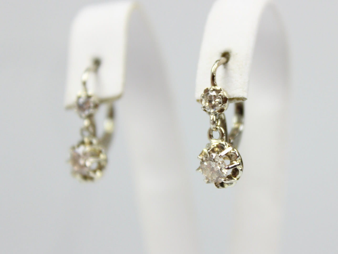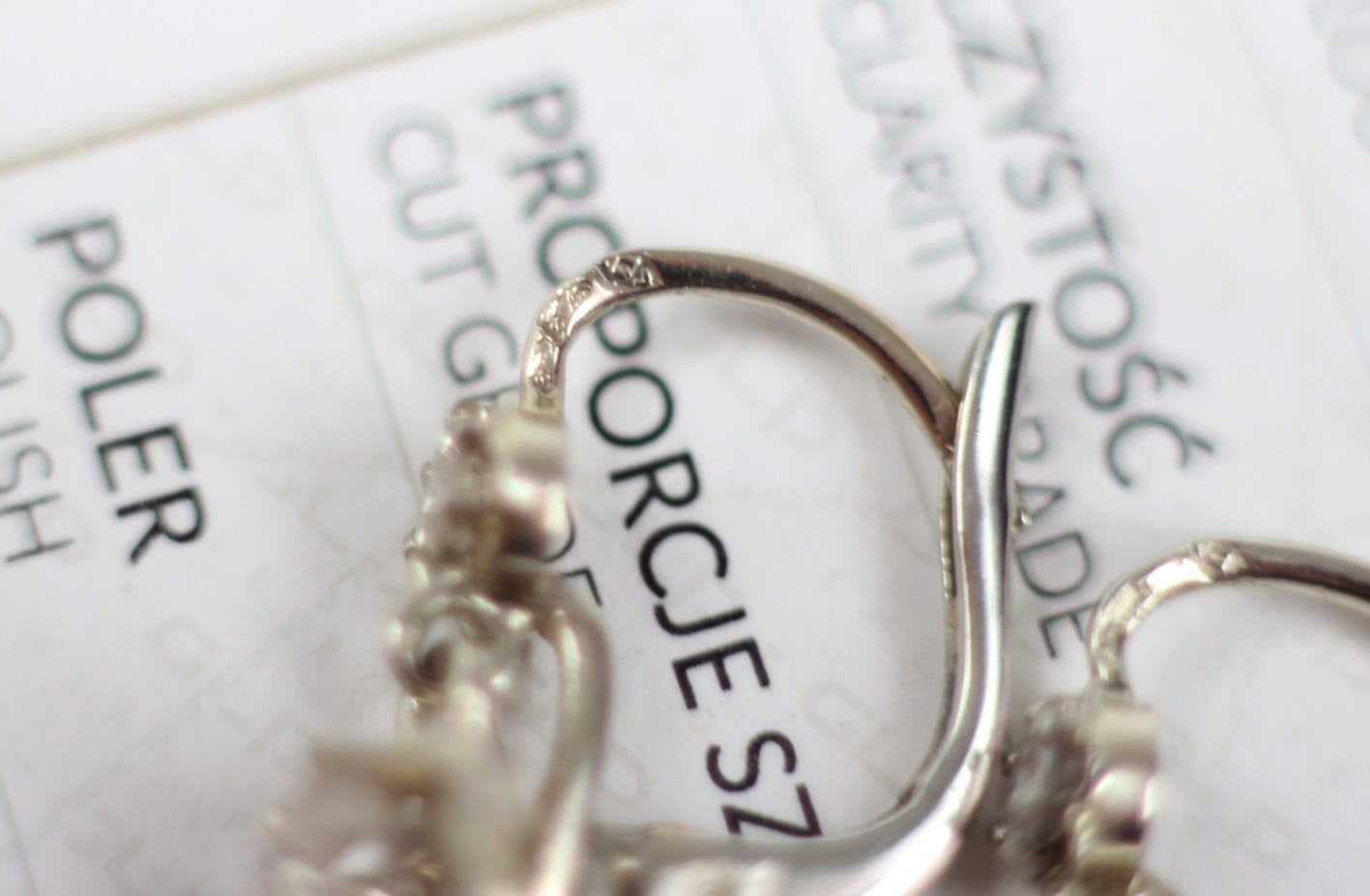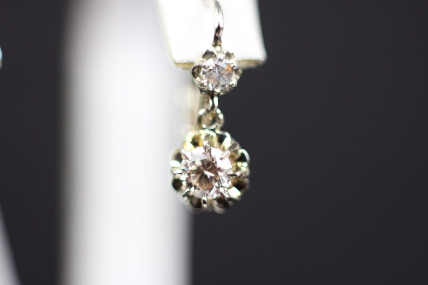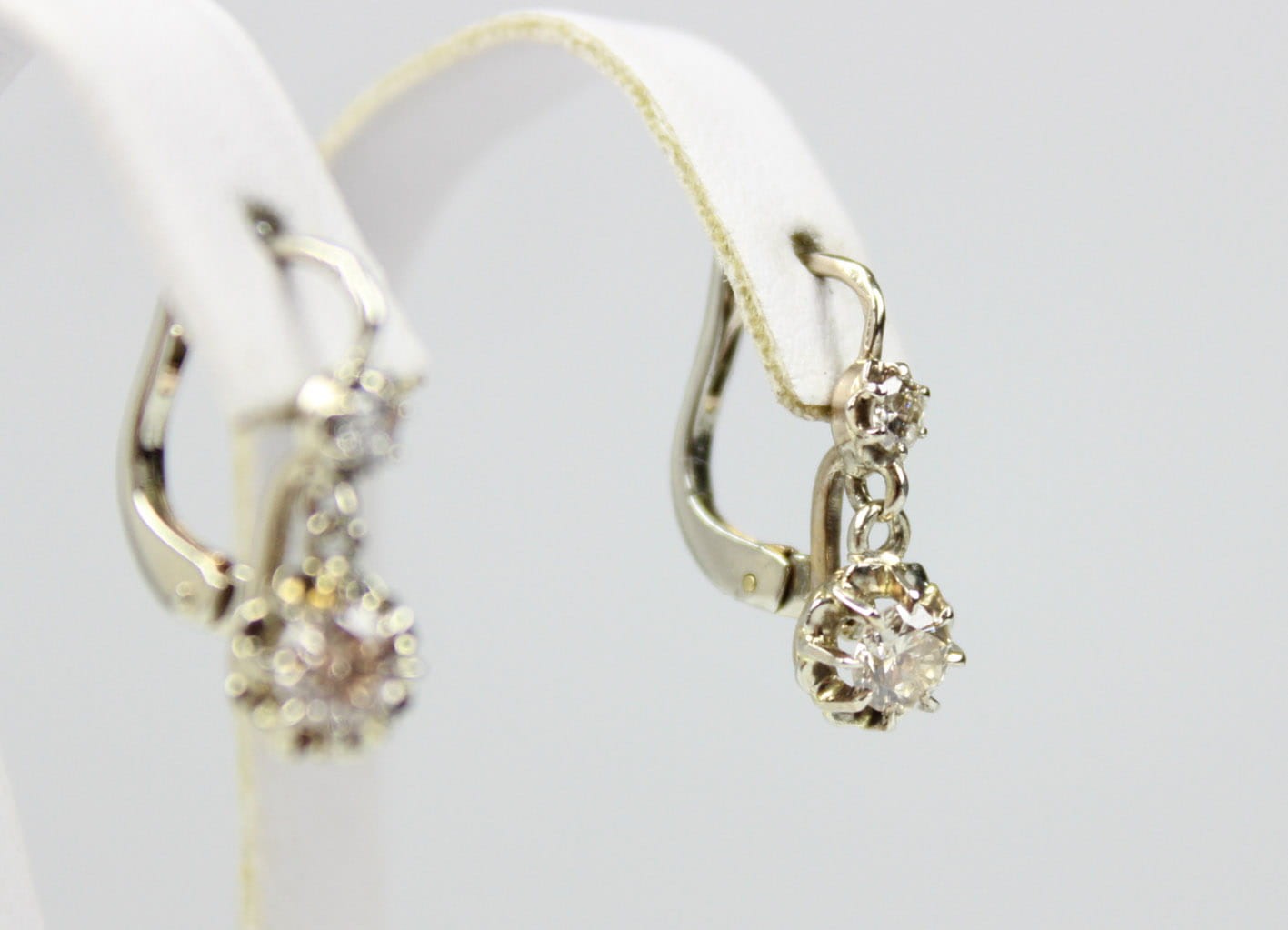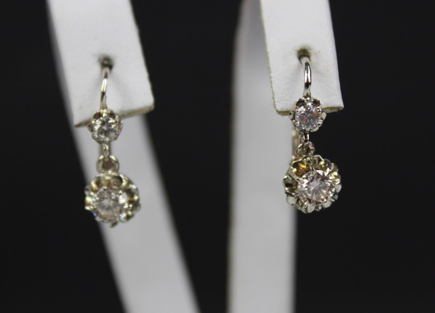 Przepiękne francuskie kolczyki pochodzące z początku lat 20-tych XX wieku. Kolczyki wykonane w białym złocie próby 750. Wyrób kameryzowany dwoma diamentami o okrągłym kształcie w szlifie brylantowym o łącznej masie 0,46 ct w barwie K-L i czystości SI. Ponadto kolczyki zdobią dwa mniejsze diamenty o okrągłym kształcie w szlifie brylantowym o masie łącznej ok. 0,14ct , barwie H-J czystości SI1. Zapięcia typu bigiel angielski. Stan zachowania bardzo dobry, sprężyny sprawne i mocne. W komplecie certyfikat renomowanego rzeczoznawcy diamentów. Wymiary :