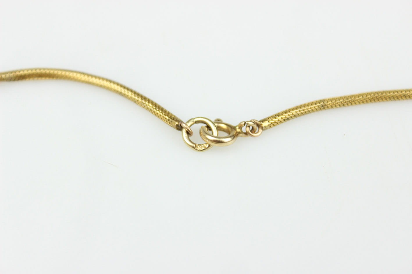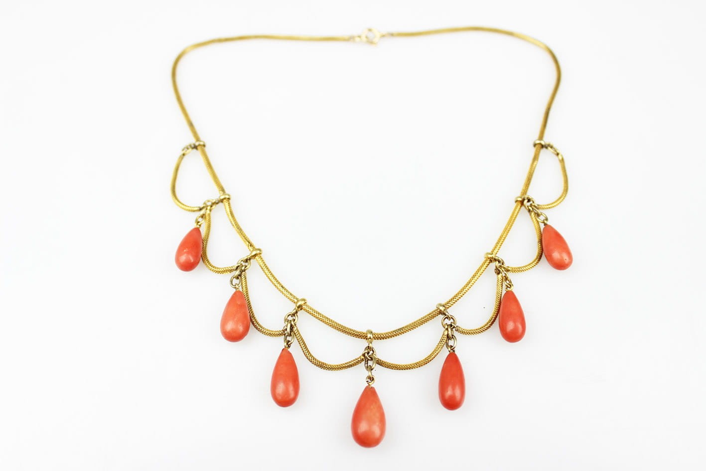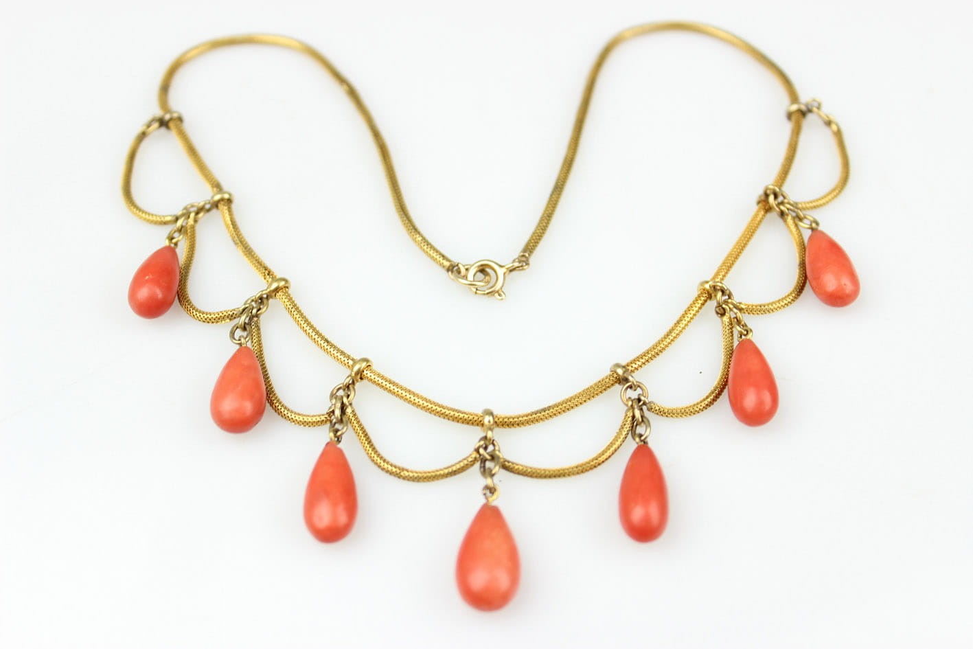 Wyjątkowy naszyjnik z lat 20-tych XX wieku wykonany najprawdopodobniej na terenie Austrii. Łańcuch o ciekawym i niepowtarzalnym splocie w formie okrągłej linki zdobiony girlandami oraz pokaźnymi soplami z naturalnego korala szlachetnego. Całość wykonana w złocie 14 karatowym. Zapięcie sygnowane puncą 585. Stan zachowania bardzo dobry z delikatnymi wgięciami na lince. Wymiary:
