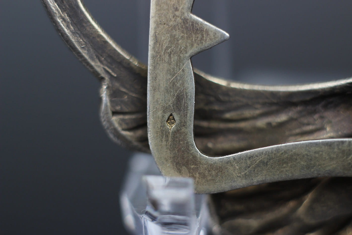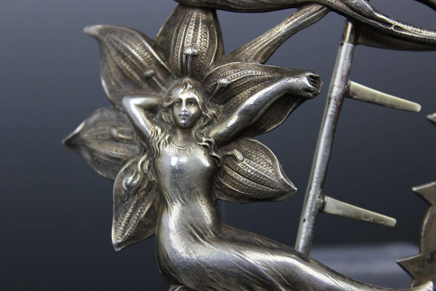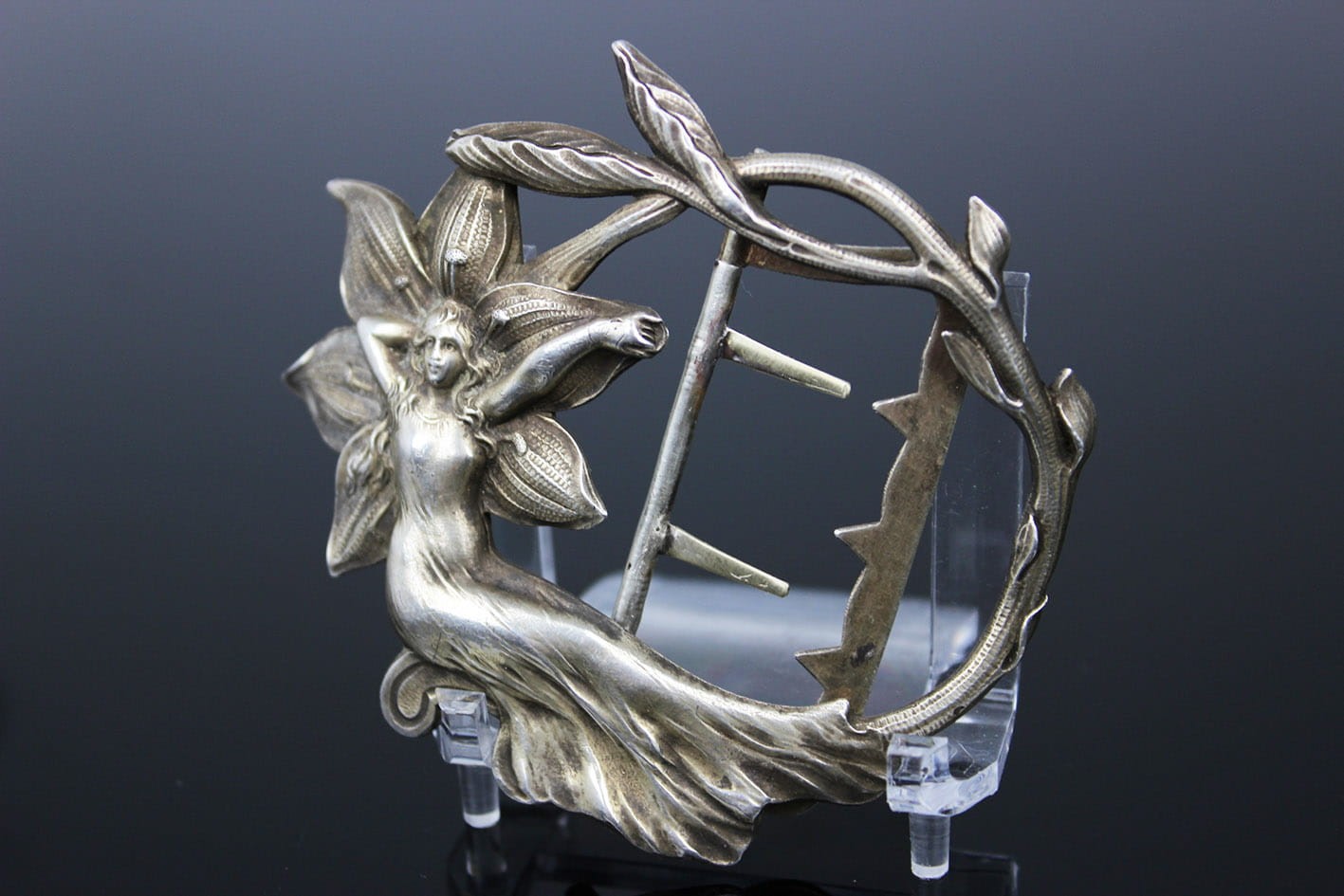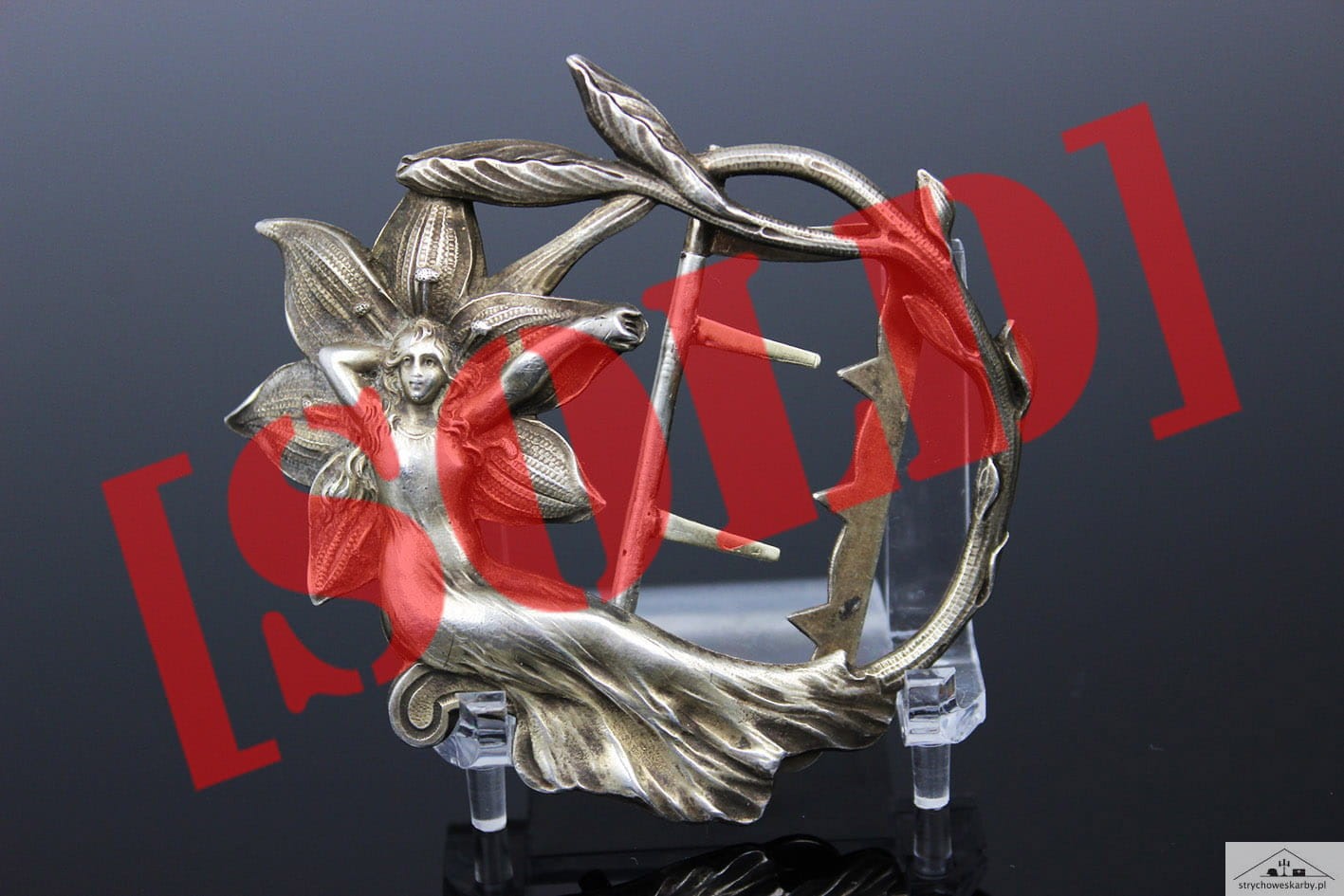 Potężna i niezwykle okazała klamra damska z początku XX wieku, stanowiąca wyjątkowy przykład kunsztu francuskiej secesji. Owalna forma została zwieńczona pełnoplastyczną postacią kobiecą subtelnie opartą o stylizowany kwiat, co tworzy dynamiczną, a zarazem harmonijną kompozycję charakterystyczną dla nurtu Art Nouveau. Wyrób został wykonany ze srebra próby 800, co potwierdza wybita francuska punca umieszczona na odwrocie. Bogate opracowanie detalu i finezyjna linia rzeźbiarska nadają klamrze wyjątkowy charakter i artystyczną wartość.
