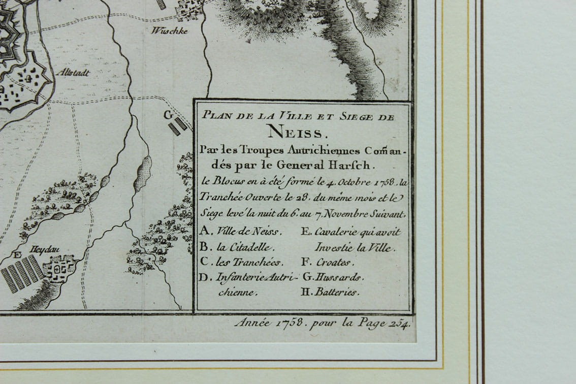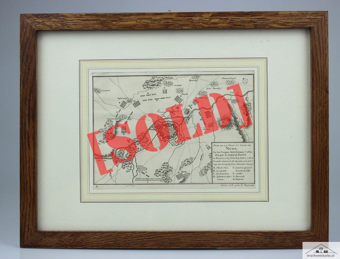 "Plan de la Ville et siege de Neiss" to autentyczny Plan twierdzy Nysa podczas najazdu przez wojska austriackie w 1758r pochodzący z dzieła "Theatre de la gyerre presente en Allemagne" z 1759r.. Miedzoryt 14,5 x 19,8 cm. W centralnej części ślad złożeń książkowych. Całość w passe partout, za szkłem w drewnianej ramie. Wymiary ramy 37,8 cm x 29 cm