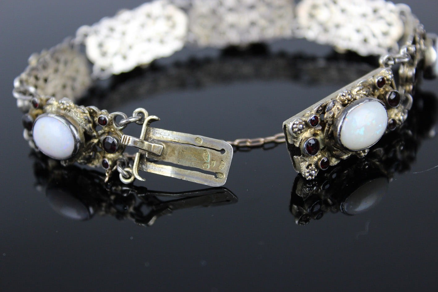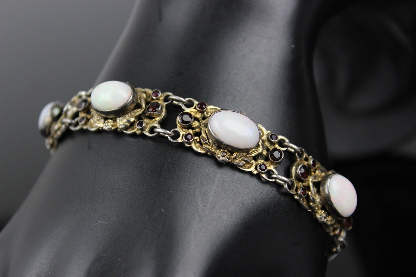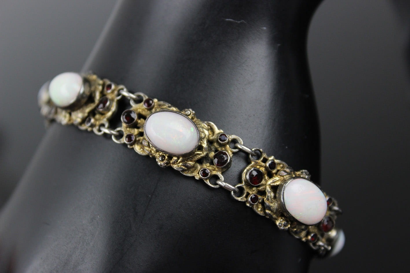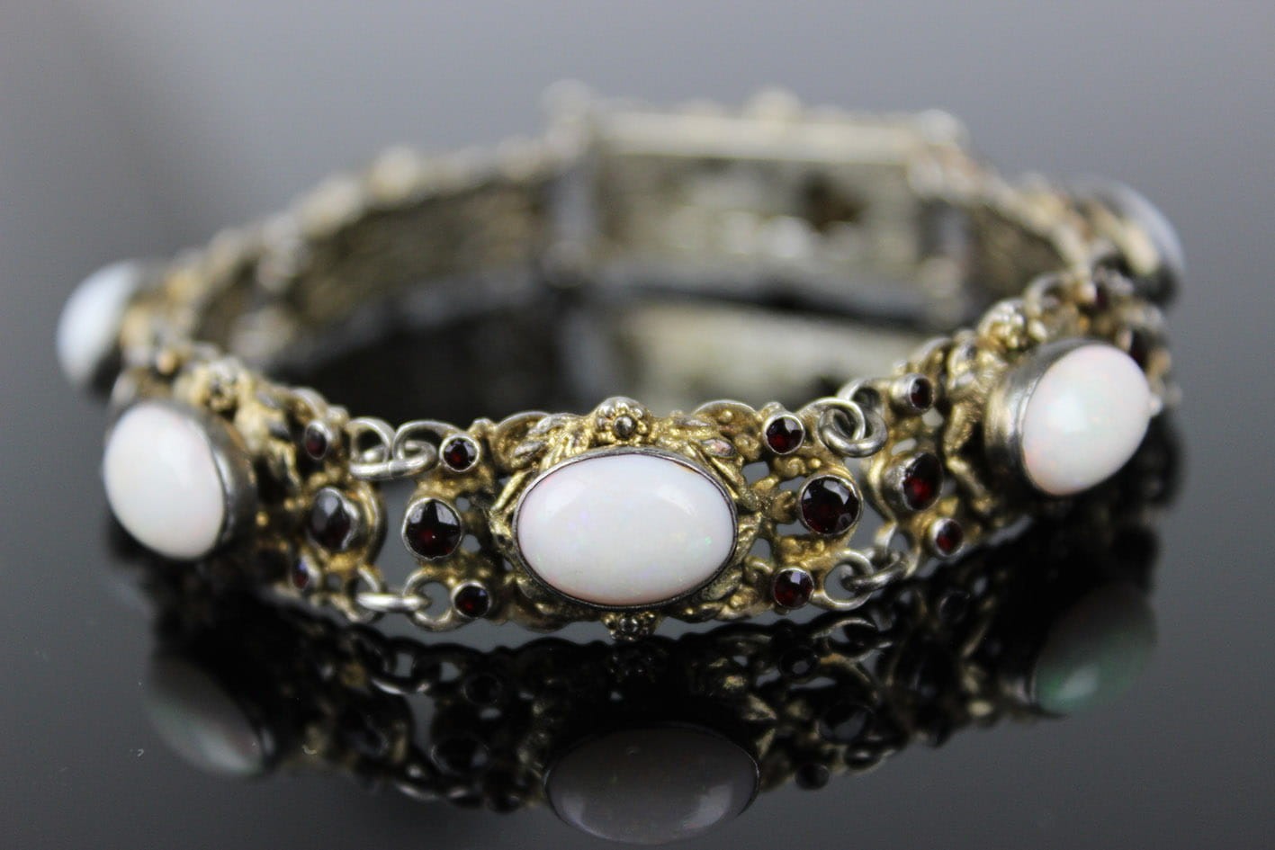 Niepowtarzalna, zabytkowa bransoletka wykonana w latach 1867–1872 na terenie monarchii Austro-Węgierskiej w mieście Pest. Jest to przykład klasycznego jubilerstwa z epoki, o wyjątkowej wartości kolekcjonerskiej. Konstrukcja ażurowa, bogato dekorowana, charakterystyczna dla biżuterii austro-węgierskiej drugiej połowy XIX wieku. Wykonana ze złoconego srebra próby 800 co potwierdza ostemplowanie na języku szuflady. Bransoletka została starannie wykończona z licznymi detalami florystycznymi i ornamentalnymi. Część zewnętrzna kameryzowana siedmioma mlecznymi opalami w szlifie kaboszonowym o łącznej masie około 10 karatów, które pięknie rozpraszają światło oraz głęboko rubinowymi fasetowanymi szkłami dodającymi kompozycji szlachetności i kontrastu. Bransoletka została wyposażona w zapięcie szufladkowe z dodatkowym zabezpieczeniem w postaci łańcuszka. Stan zachowania bardzo dobry, z naturalną, szlachetną patyną, podkreślającą autentyczność i wiek przedmiotu.