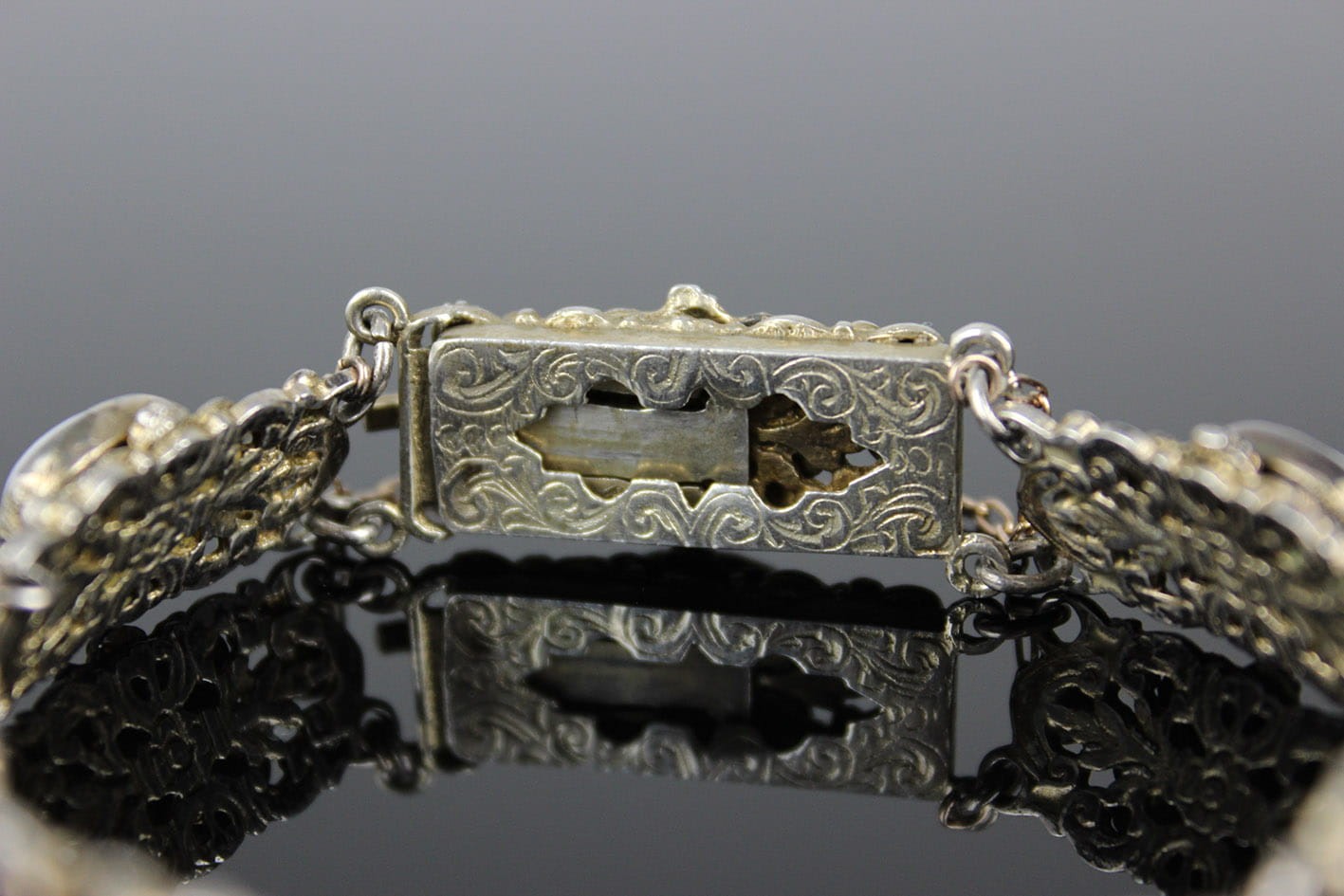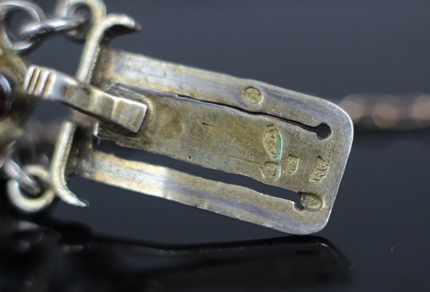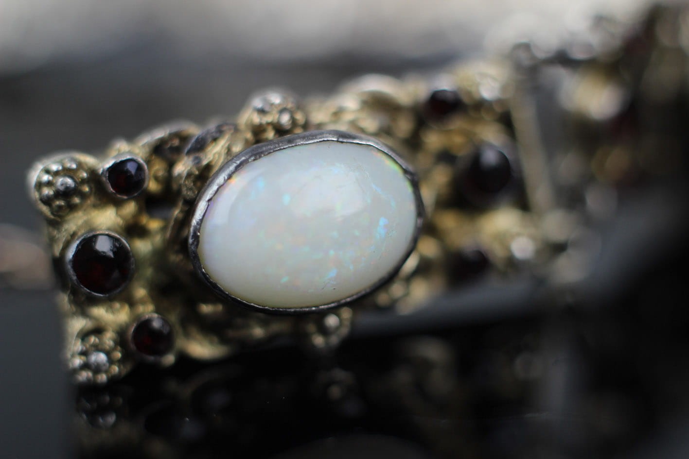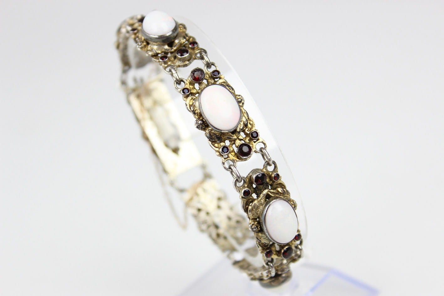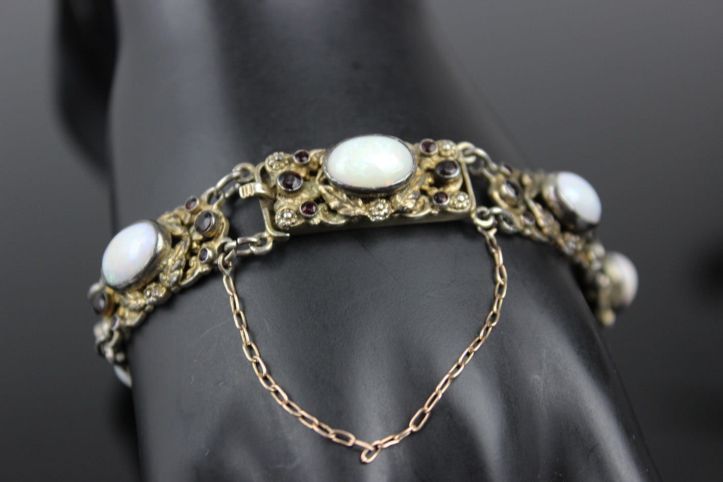 Niepowtarzalna, zabytkowa bransoletka wykonana w latach 1867–1872 na terenie monarchii Austro-Węgierskiej w mieście Pest. Jest to przykład klasycznego jubilerstwa z epoki, o wyjątkowej wartości kolekcjonerskiej. Konstrukcja ażurowa, bogato dekorowana, charakterystyczna dla biżuterii austro-węgierskiej drugiej połowy XIX wieku. Wykonana ze złoconego srebra próby 800 co potwierdza ostemplowanie na języku szuflady. Bransoletka została starannie wykończona z licznymi detalami florystycznymi i ornamentalnymi. Część zewnętrzna kameryzowana siedmioma mlecznymi opalami w szlifie kaboszonowym o łącznej masie około 10 karatów, które pięknie rozpraszają światło oraz głęboko rubinowymi fasetowanymi szkłami dodającymi kompozycji szlachetności i kontrastu. Bransoletka została wyposażona w zapięcie szufladkowe z dodatkowym zabezpieczeniem w postaci łańcuszka. Stan zachowania bardzo dobry, z naturalną, szlachetną patyną, podkreślającą autentyczność i wiek przedmiotu.