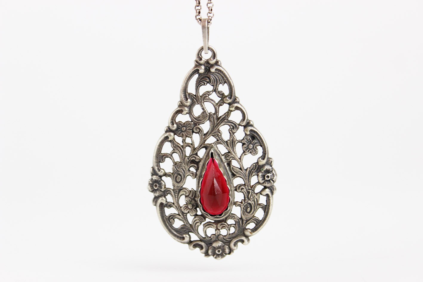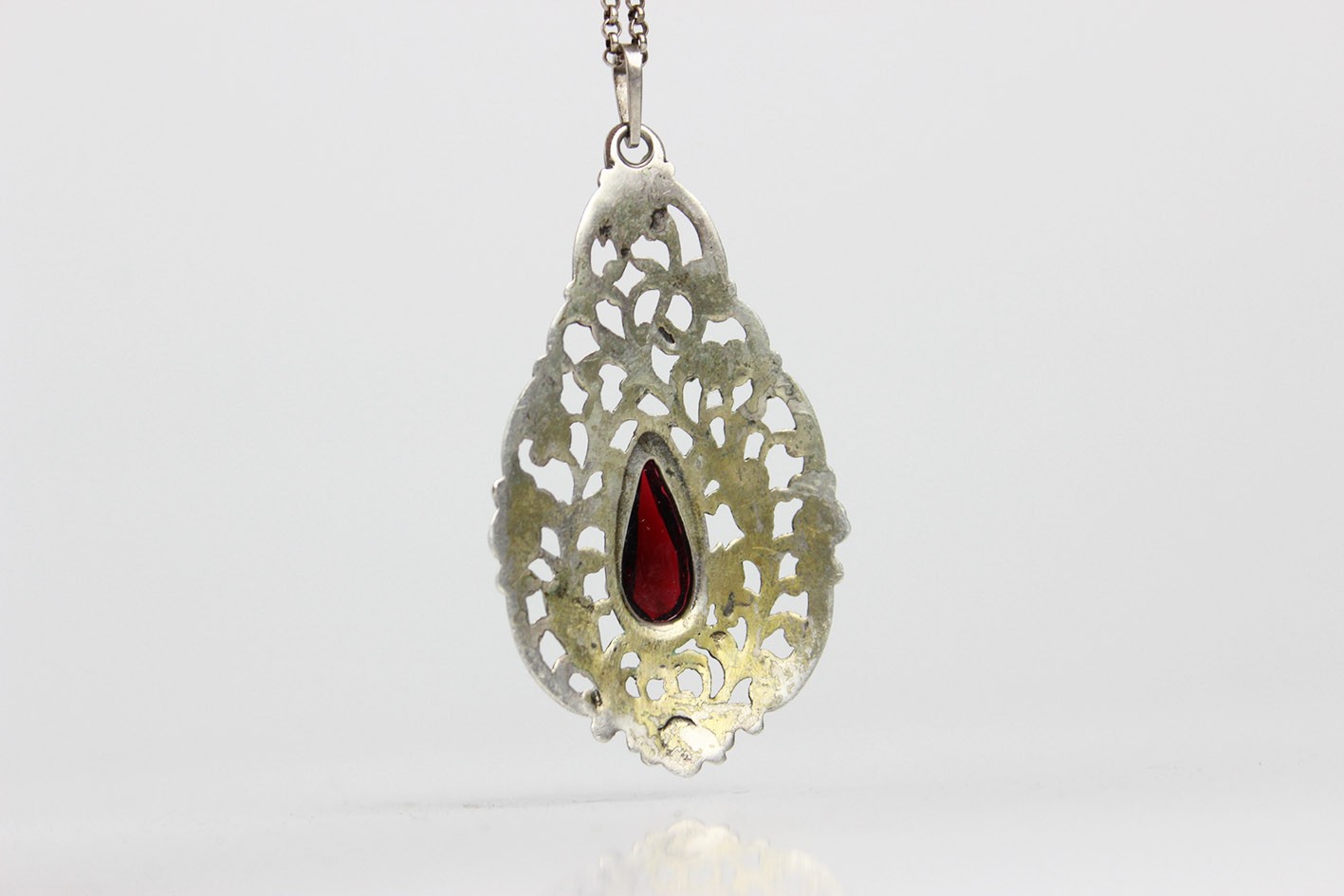 Wyjątkowej urody zawieszka pochodząca z początków XX wieku. Wyrób ażurowy, bogato zdobiony motywami kwiatowymi oraz osadzonym centralnie sporym granatem. Całość w wiekowej patynce. Na rewersie widoczne pozostałości złocenia. Zawieszka wykonana w całości w srebrze próby około 900 ( brak punc badanie kwasowe). Wymiary: