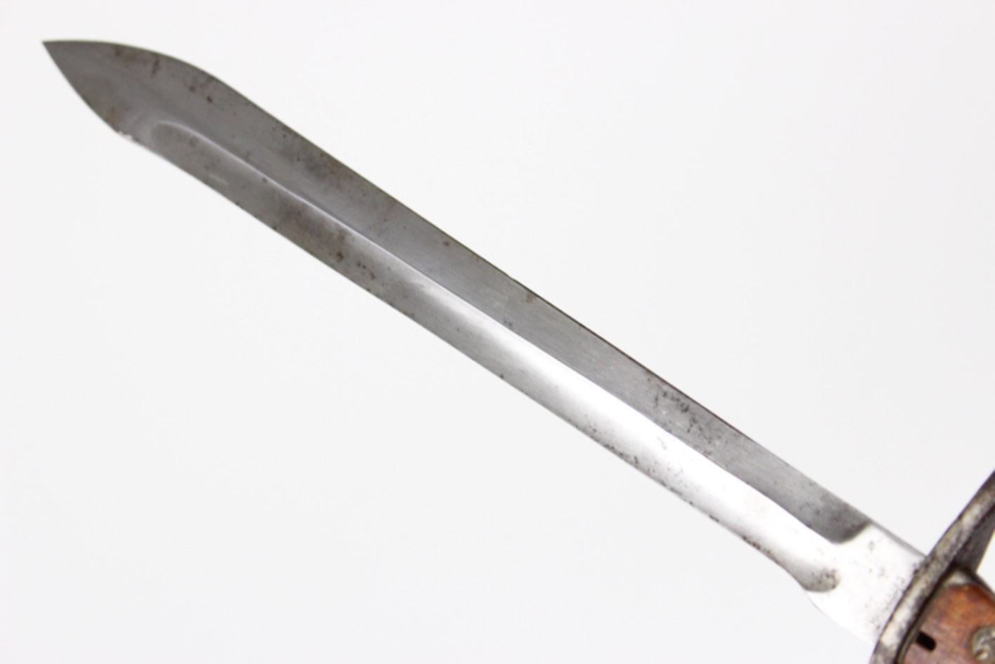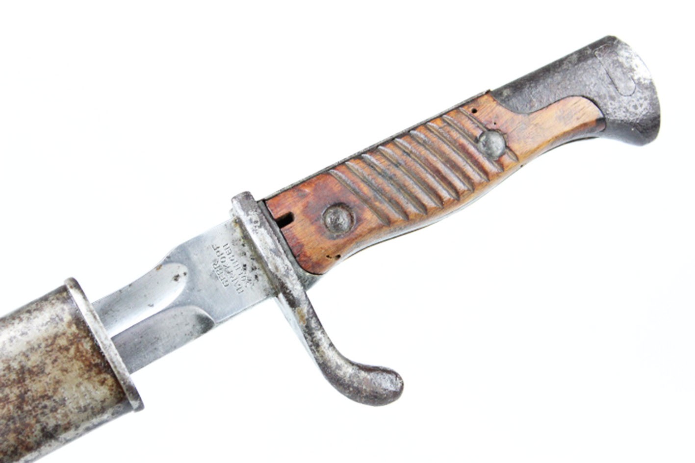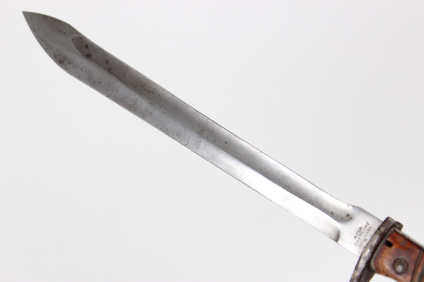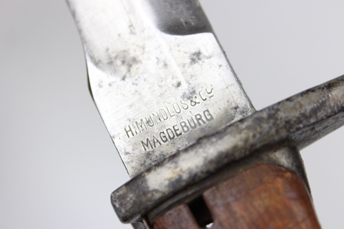 Oryginalny niemiecki bagnet do karabinu Mauser mod. S98/05 nowego typu z osłona ogniową. Egzemplarz strychowy nie czyszczony, nie rozkręcany ani nie polerowany. Głownia jednosieczna z obustronnym wklęsłym zbroczem dwustronnie sygnowana: GEBR. HARTKOPF SOLINGEN. druga strona: H.MUNDLOS & Co MAGDEBURG. Bardzo ciekawa, podoficerska wersja w której piła została usunięta w toku działań wojennych, zgodnie z obowiązującymi wówczas regulaminami. Na grzbiecie fragment odbioru wojskowego z datą 1917 ?? Głownia w pięknym stanie zachowania. Rękojeść ze sprawnym zamkiem. Pochwa gładka, z delikatną powierzchniową rdzą. Dławik trzyma mocno. Pochwa bez wgnieceń.