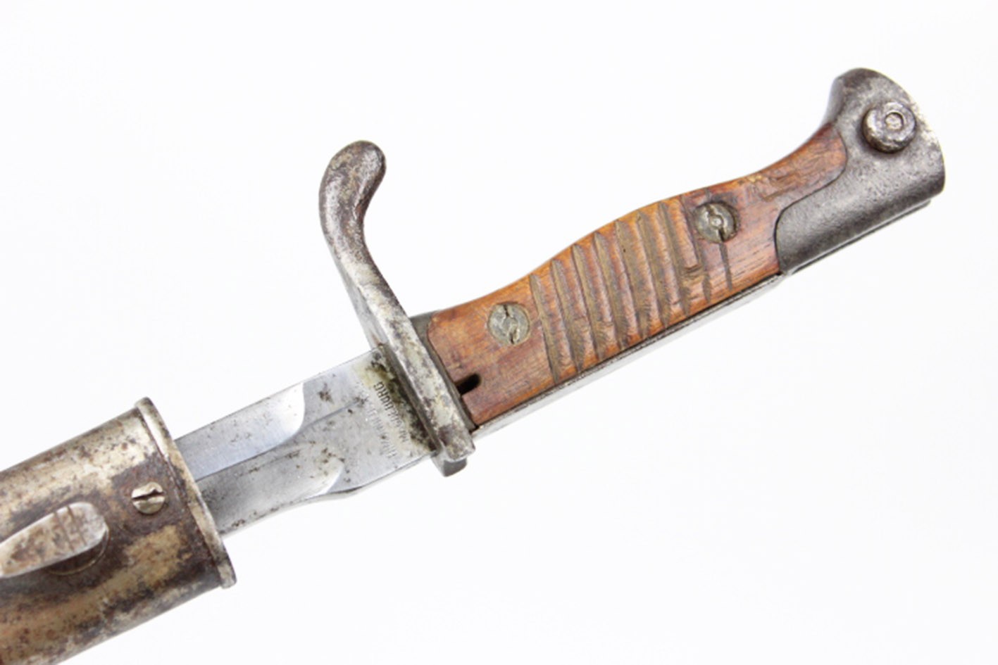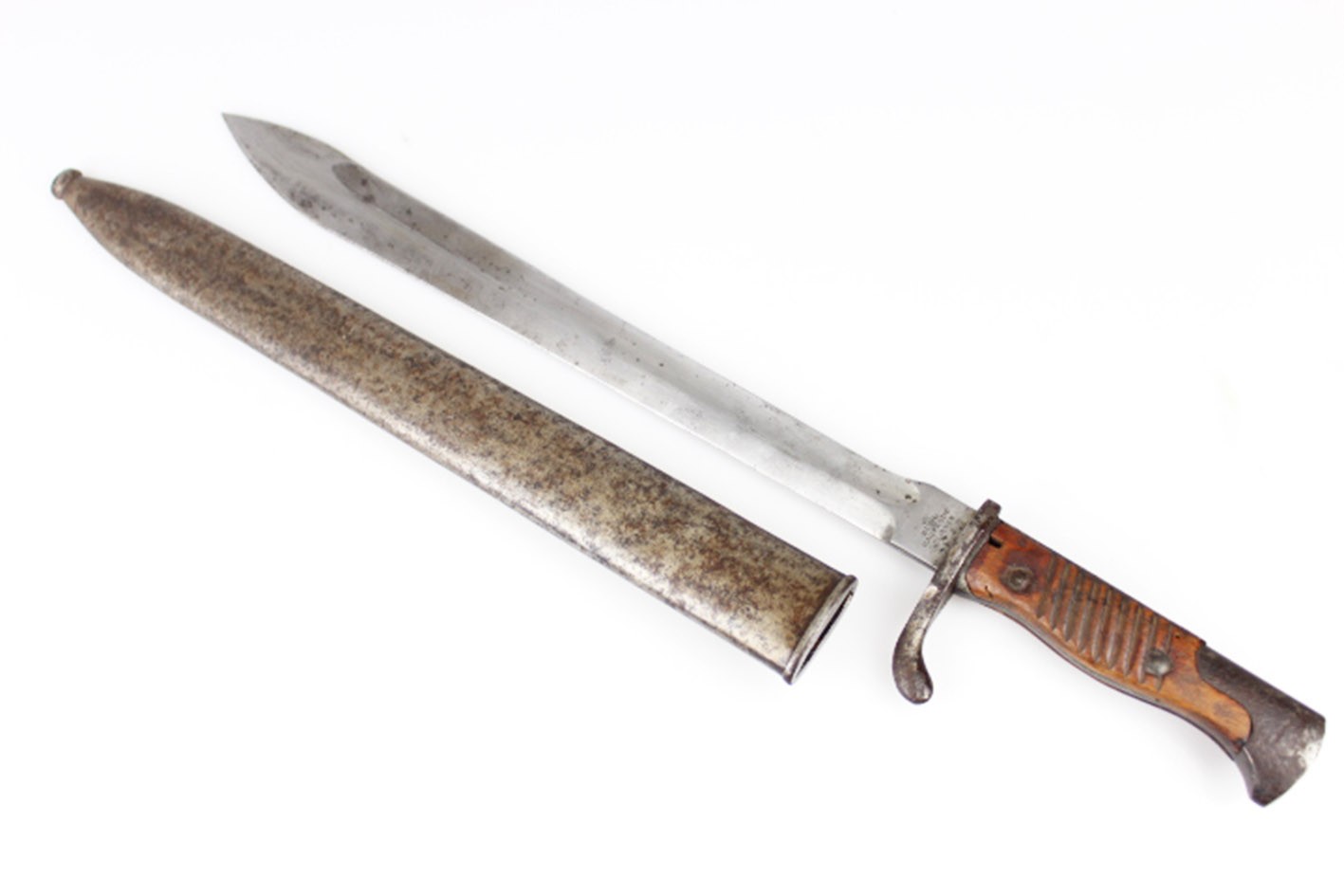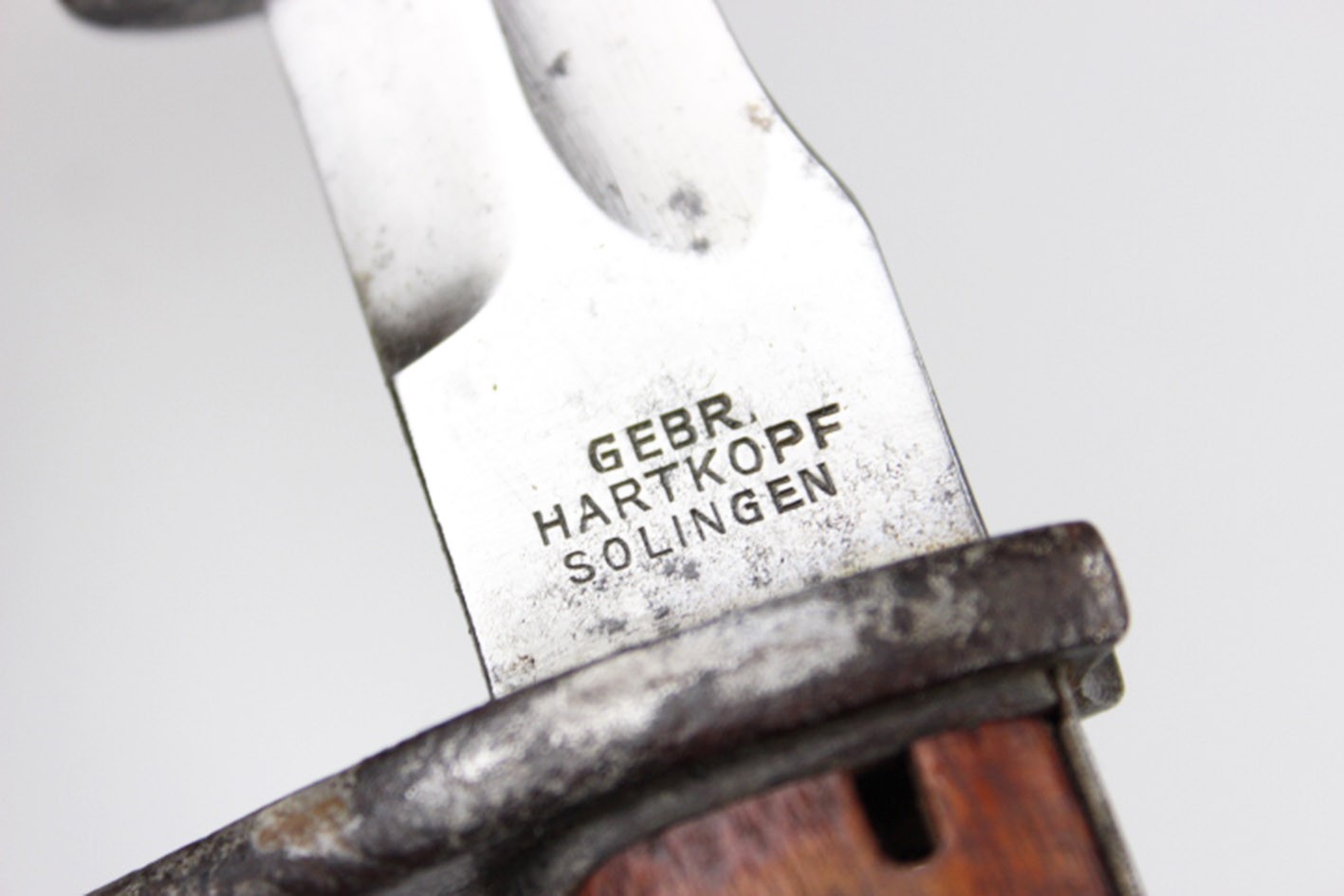 Oryginalny niemiecki bagnet do karabinu Mauser mod. S98/05 nowego typu z osłona ogniową. Egzemplarz strychowy nie czyszczony, nie rozkręcany ani nie polerowany. Głownia jednosieczna z obustronnym wklęsłym zbroczem dwustronnie sygnowana: GEBR. HARTKOPF SOLINGEN. druga strona: H.MUNDLOS & Co MAGDEBURG. Bardzo ciekawa, podoficerska wersja w której piła została usunięta w toku działań wojennych, zgodnie z obowiązującymi wówczas regulaminami. Na grzbiecie fragment odbioru wojskowego z datą 1917 ?? Głownia w pięknym stanie zachowania. Rękojeść ze sprawnym zamkiem. Pochwa gładka, z delikatną powierzchniową rdzą. Dławik trzyma mocno. Pochwa bez wgnieceń.
