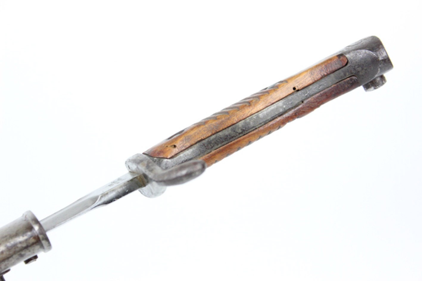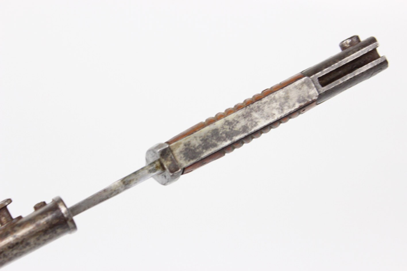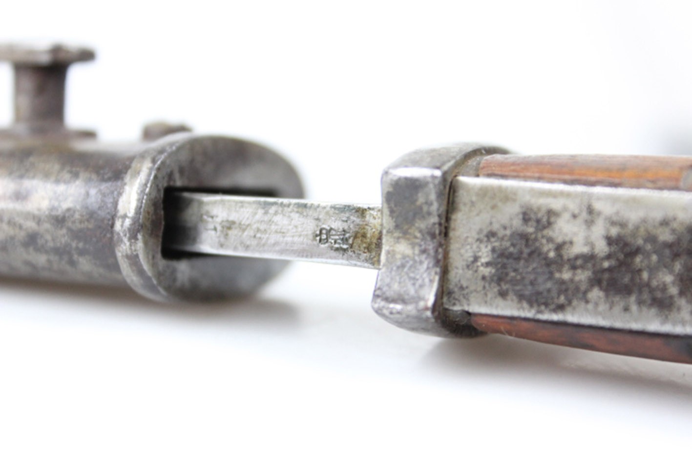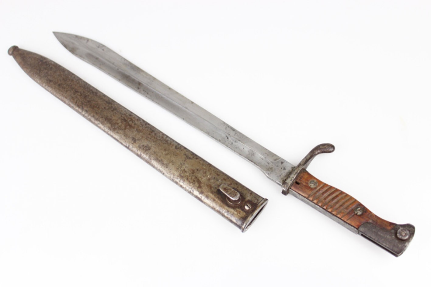 Oryginalny niemiecki bagnet do karabinu Mauser mod. S98/05 nowego typu z osłona ogniową. Egzemplarz strychowy nie czyszczony, nie rozkręcany ani nie polerowany. Głownia jednosieczna z obustronnym wklęsłym zbroczem dwustronnie sygnowana: GEBR. HARTKOPF SOLINGEN. druga strona: H.MUNDLOS & Co MAGDEBURG. Bardzo ciekawa, podoficerska wersja w której piła została usunięta w toku działań wojennych, zgodnie z obowiązującymi wówczas regulaminami. Na grzbiecie fragment odbioru wojskowego z datą 1917 ?? Głownia w pięknym stanie zachowania. Rękojeść ze sprawnym zamkiem. Pochwa gładka, z delikatną powierzchniową rdzą. Dławik trzyma mocno. Pochwa bez wgnieceń.