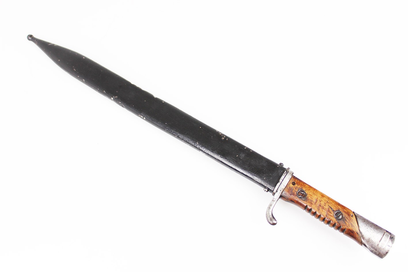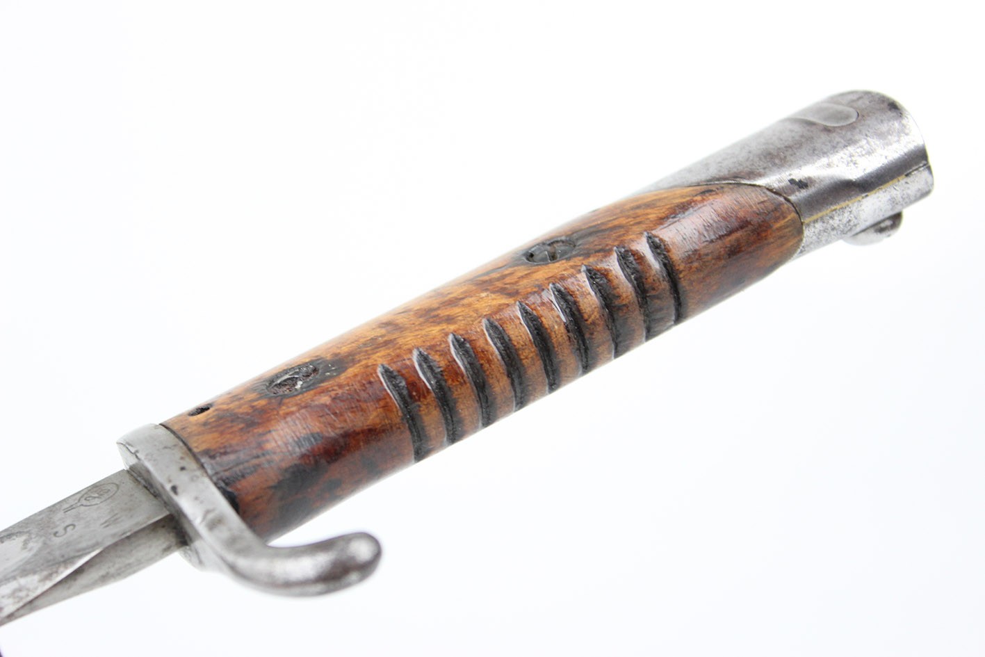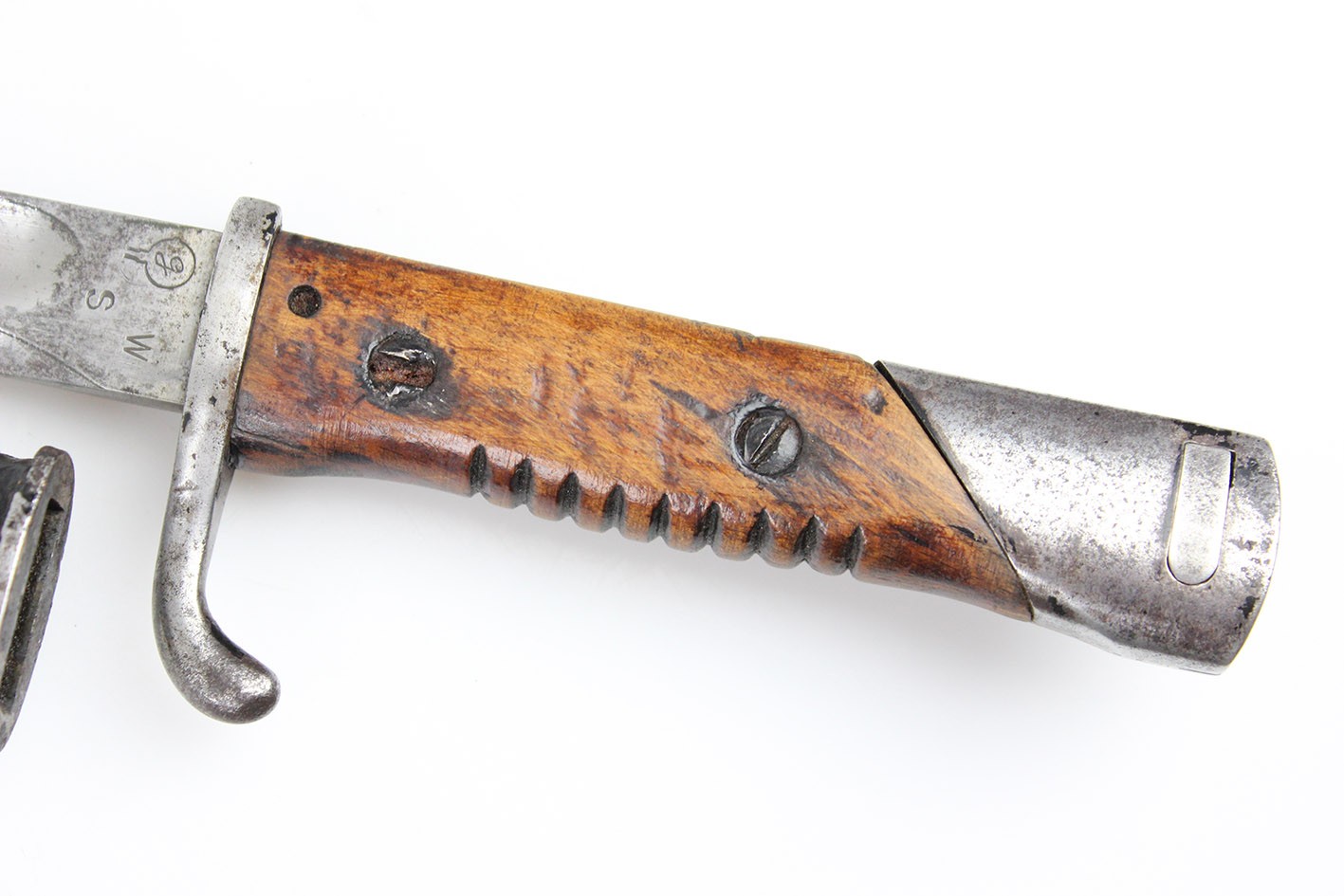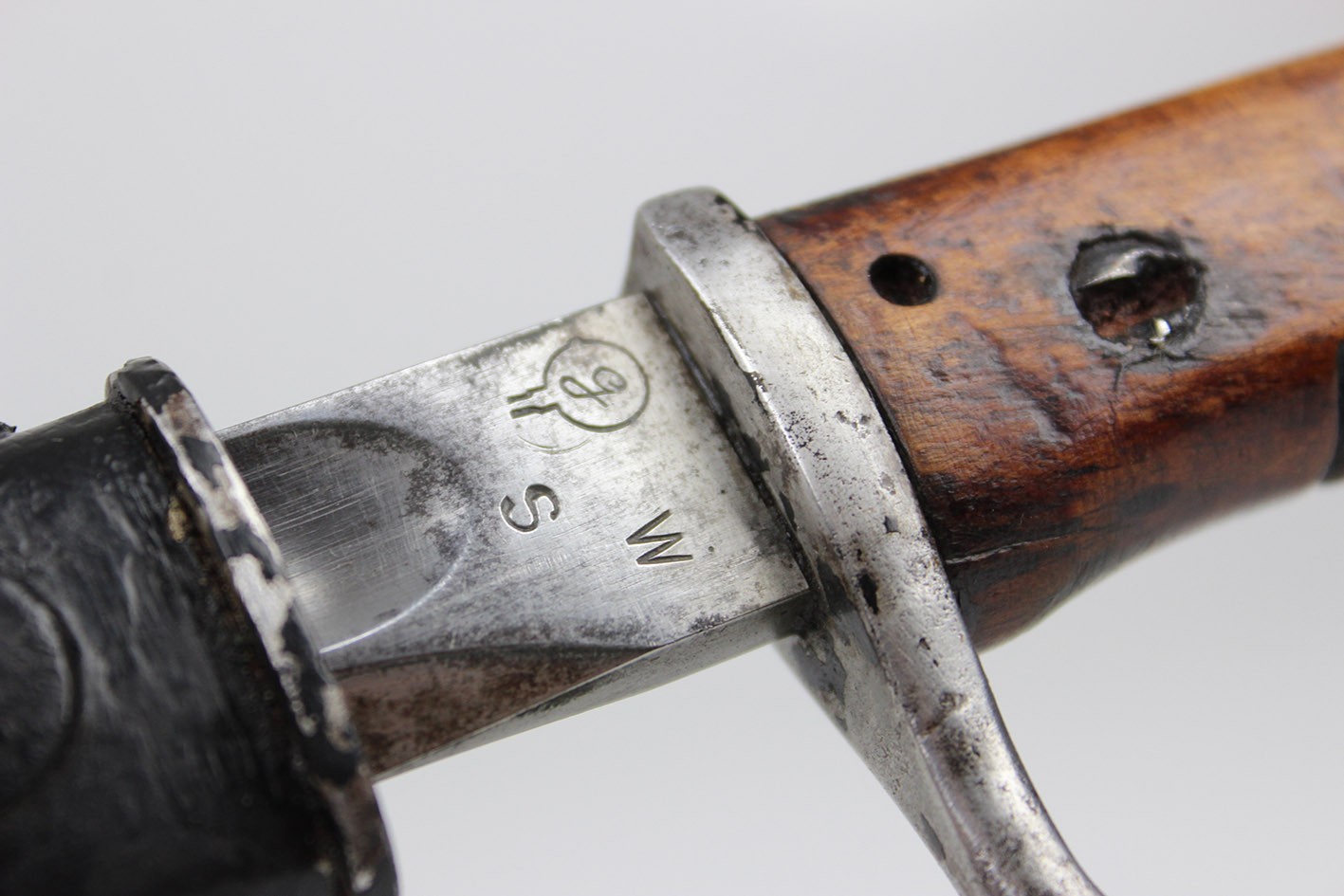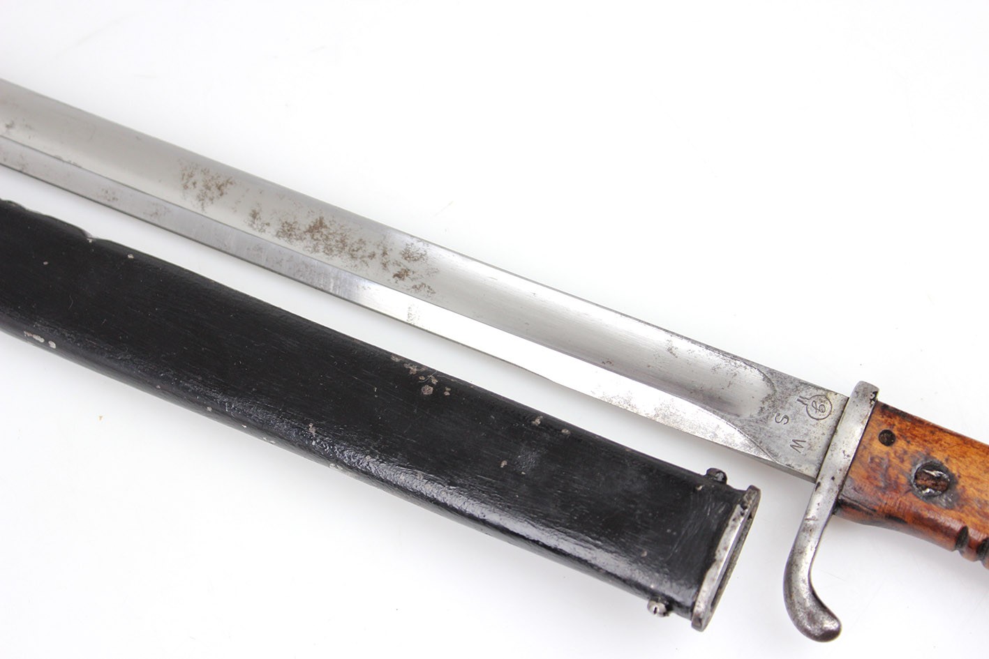 Prezentowany egzemplarz reprezentuje klasyczny wariant bojowy S.14, przeznaczony do karabinów Mauser, funkcjonalnie zbliżony do systemu S84/98, choć formalnie pozostający konstrukcją odrębną. Głownia jednosieczna, bez piły, o charakterystycznym profilu i długości odpowiadającej dokumentacji modelu, zachowana jest w bardzo dobrym stanie, z czytelną geometrią i jedynie drobnymi, powierzchniowymi śladami użytkowania. Na grzbiecie głowni widoczne są bawarskie punce odbiorcze – litera „L” pod koroną, jednoznacznie identyfikowane jako znak odbioru z okresu panowania Ludwiga III, króla Bawarii (1913–1918), co stanowi istotny i rzadko zachowany element potwierdzający wojskową akceptację egzemplarza. Rękojeść wykonana z jednego kawałka drewna, z charakterystycznymi poprzecznymi nacięciami poprawiającymi chwyt, zachowana oryginalnie, bez wymian i wtórnych ingerencji. Pochwa stalowa, z mocnym, wyraźnie zachowanym dławikiem, konstrukcyjnie zgodna z okresem. Czarna farba ochronna jest najprawdopodobniej wtórna, jednak stara, wykonana jeszcze w epoce użytkowania wojskowego lub bezpośrednio po niej. Na pochwie widoczne są delikatne wgniecenia, dokładnie pokazane na zdjęciach, typowe dla egzemplarzy noszonych i używanych w warunkach frontowych, bez śladów późniejszych napraw czy prostowania.