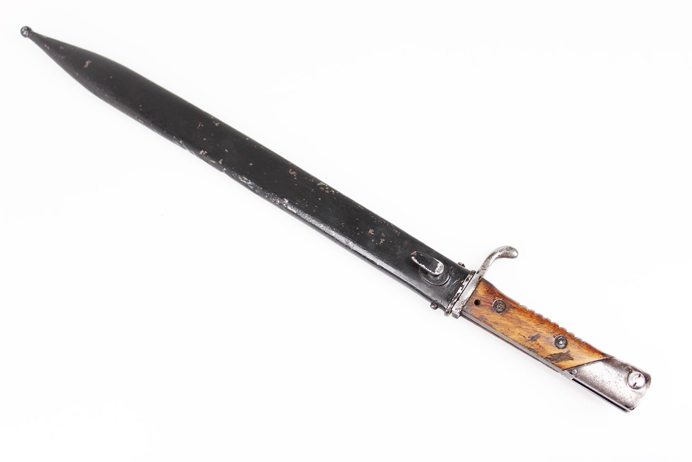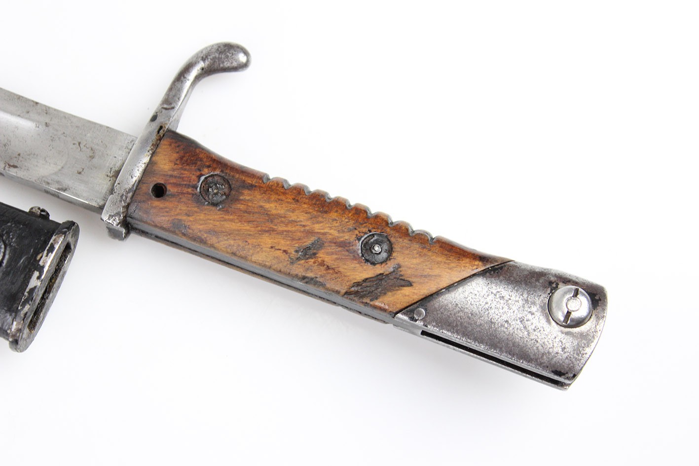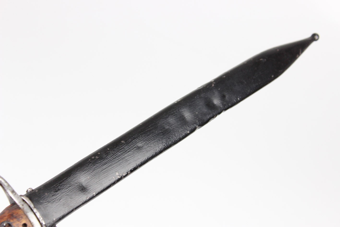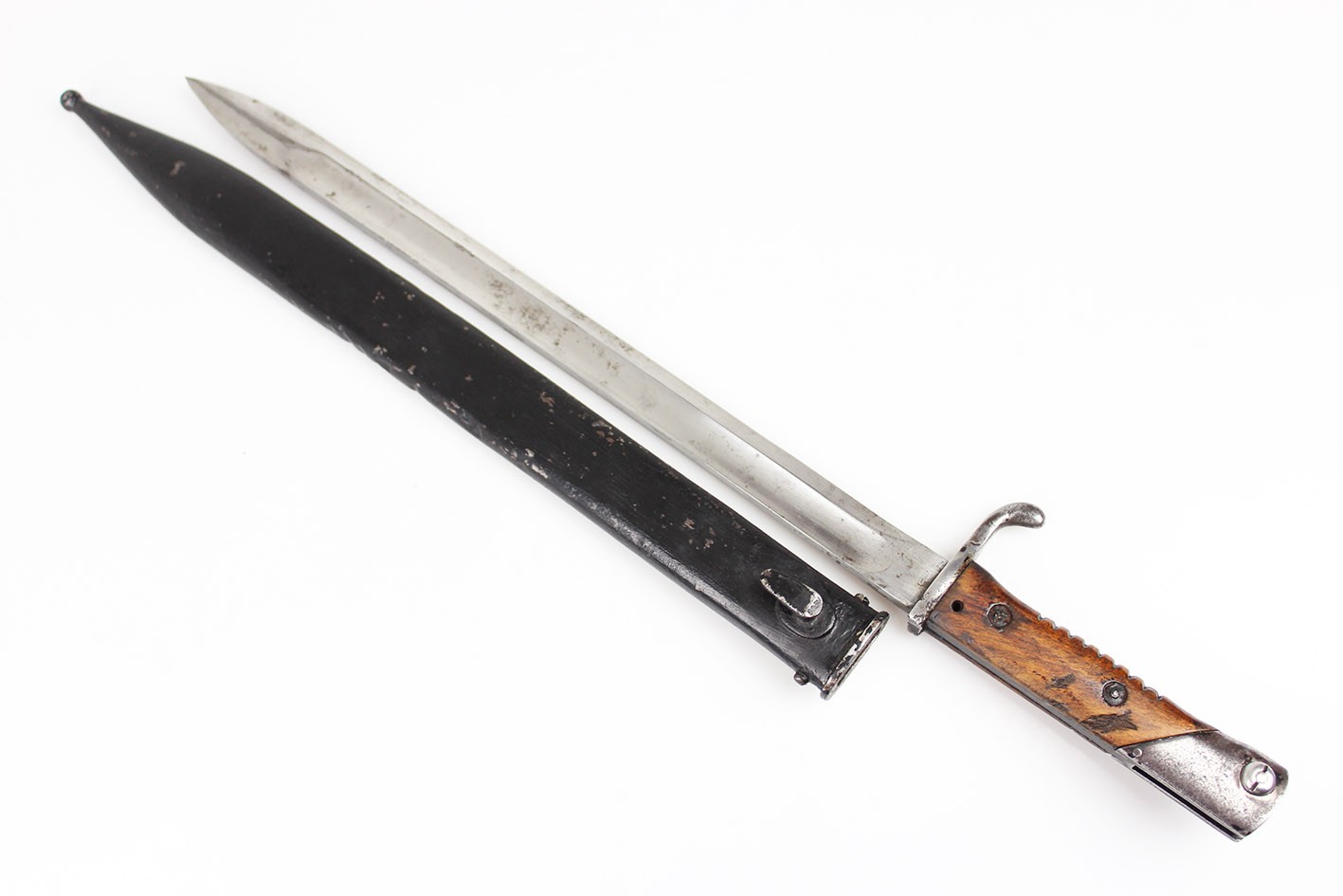 Prezentowany egzemplarz reprezentuje klasyczny wariant bojowy S.14, przeznaczony do karabinów Mauser, funkcjonalnie zbliżony do systemu S84/98, choć formalnie pozostający konstrukcją odrębną. Głownia jednosieczna, bez piły, o charakterystycznym profilu i długości odpowiadającej dokumentacji modelu, zachowana jest w bardzo dobrym stanie, z czytelną geometrią i jedynie drobnymi, powierzchniowymi śladami użytkowania. Na grzbiecie głowni widoczne są bawarskie punce odbiorcze – litera „L” pod koroną, jednoznacznie identyfikowane jako znak odbioru z okresu panowania Ludwiga III, króla Bawarii (1913–1918), co stanowi istotny i rzadko zachowany element potwierdzający wojskową akceptację egzemplarza. Rękojeść wykonana z jednego kawałka drewna, z charakterystycznymi poprzecznymi nacięciami poprawiającymi chwyt, zachowana oryginalnie, bez wymian i wtórnych ingerencji. Pochwa stalowa, z mocnym, wyraźnie zachowanym dławikiem, konstrukcyjnie zgodna z okresem. Czarna farba ochronna jest najprawdopodobniej wtórna, jednak stara, wykonana jeszcze w epoce użytkowania wojskowego lub bezpośrednio po niej. Na pochwie widoczne są delikatne wgniecenia, dokładnie pokazane na zdjęciach, typowe dla egzemplarzy noszonych i używanych w warunkach frontowych, bez śladów późniejszych napraw czy prostowania.