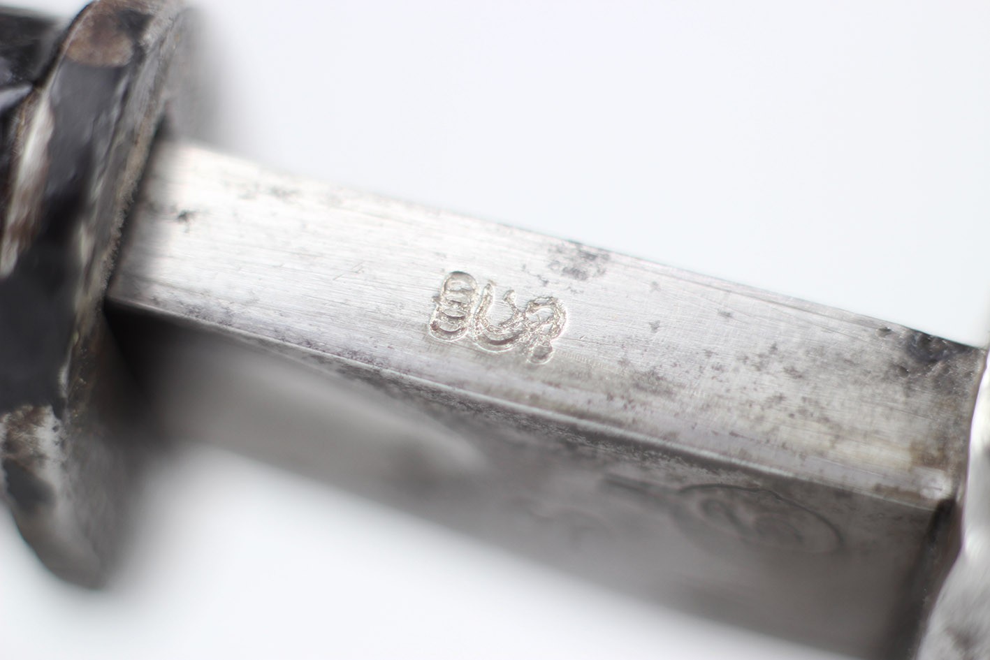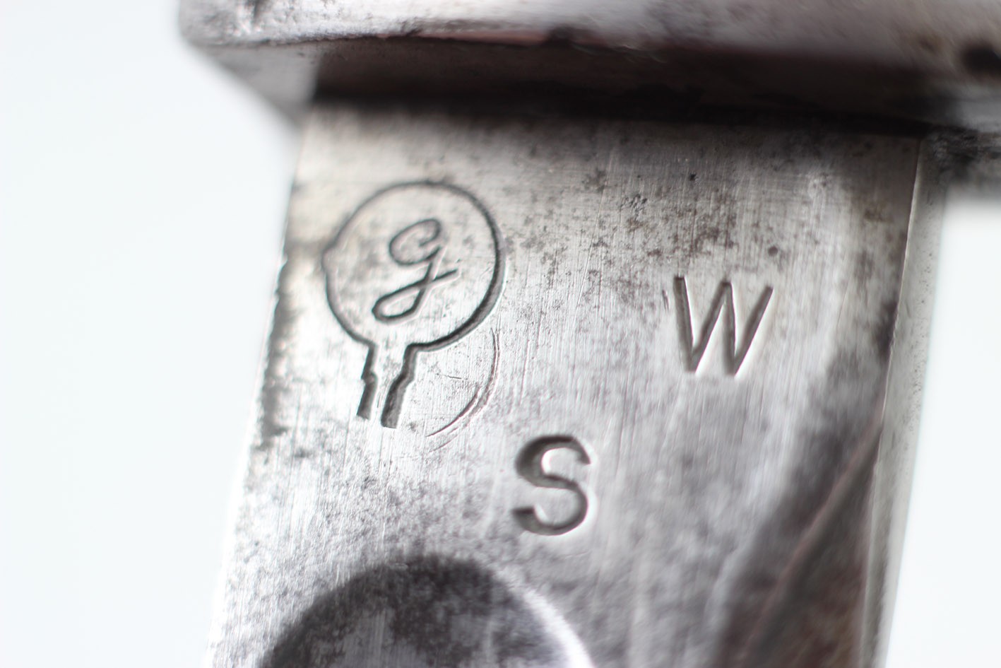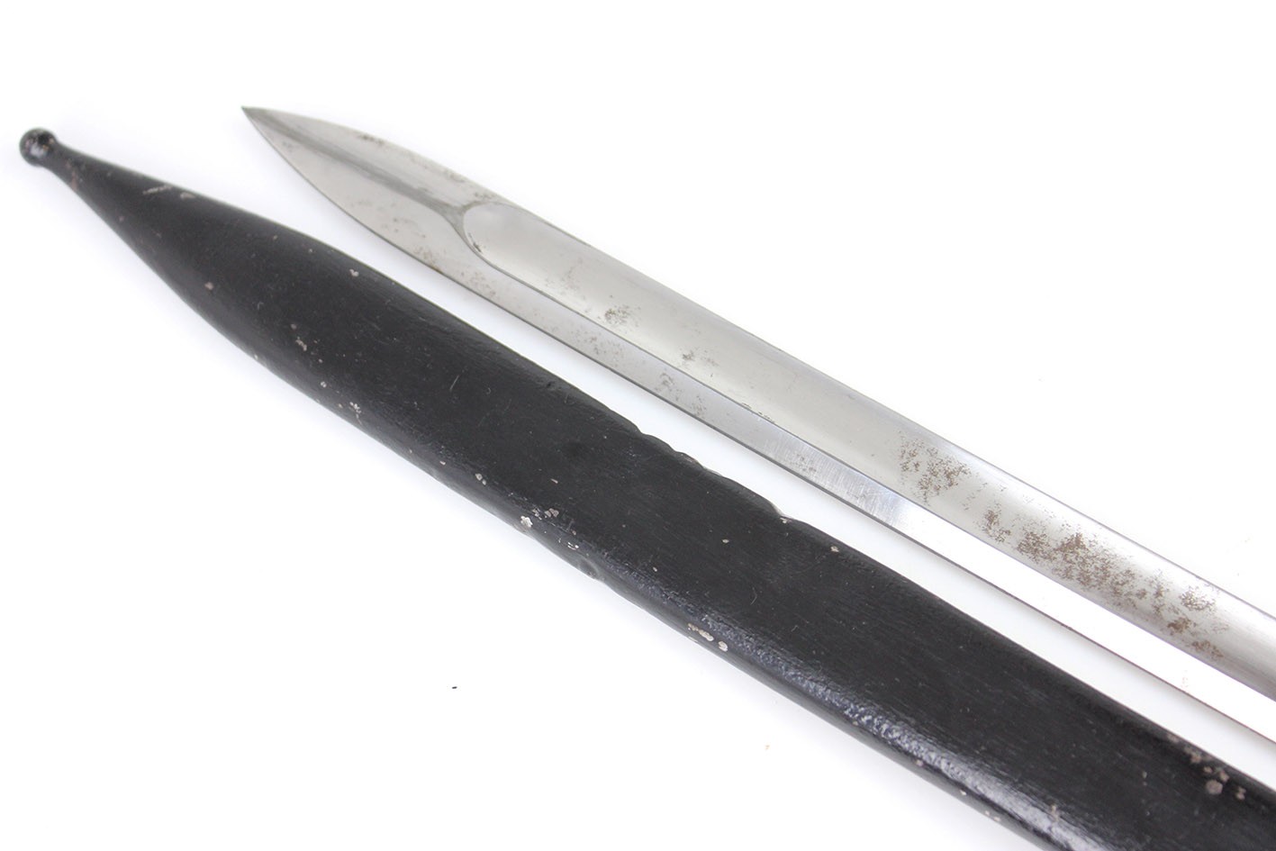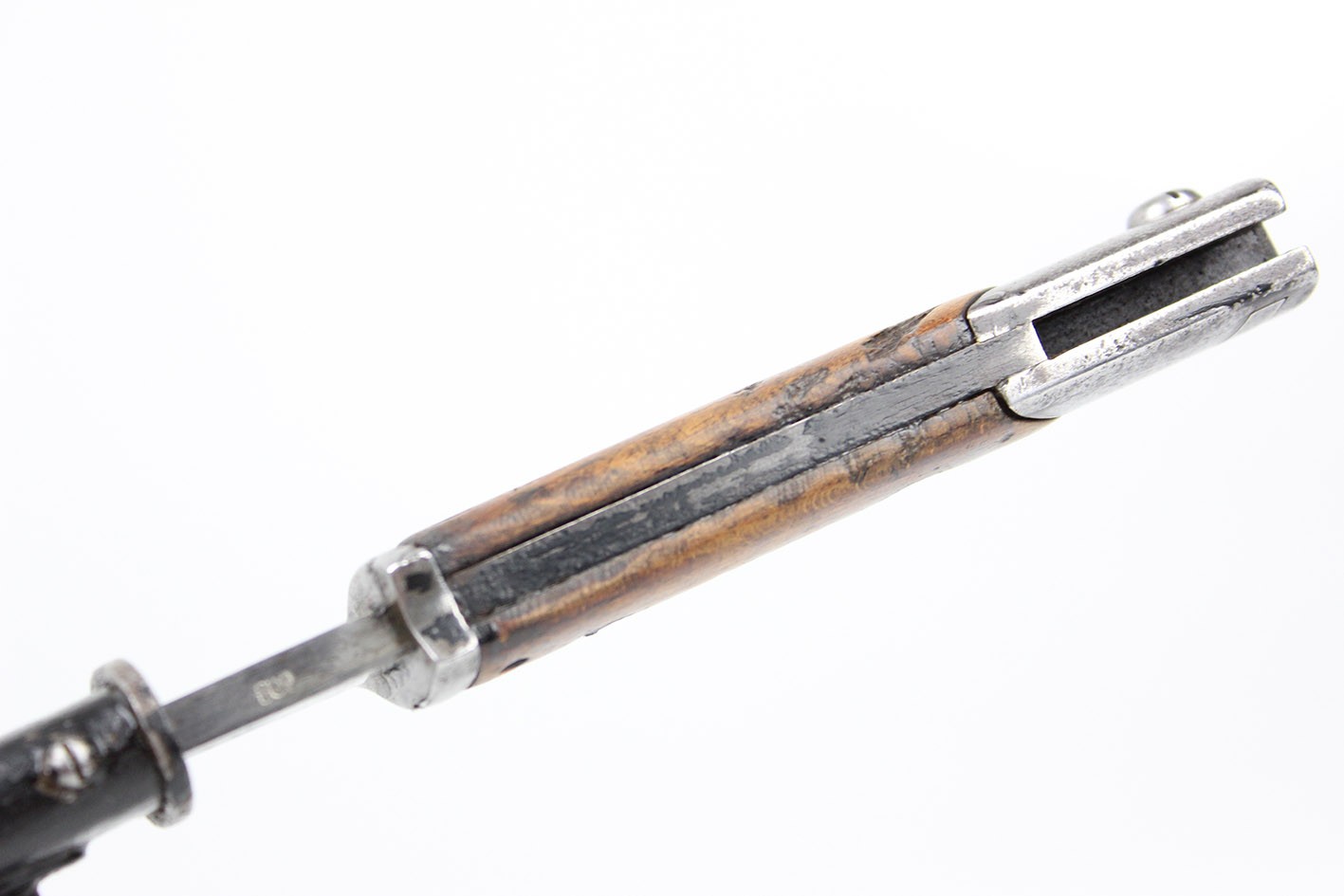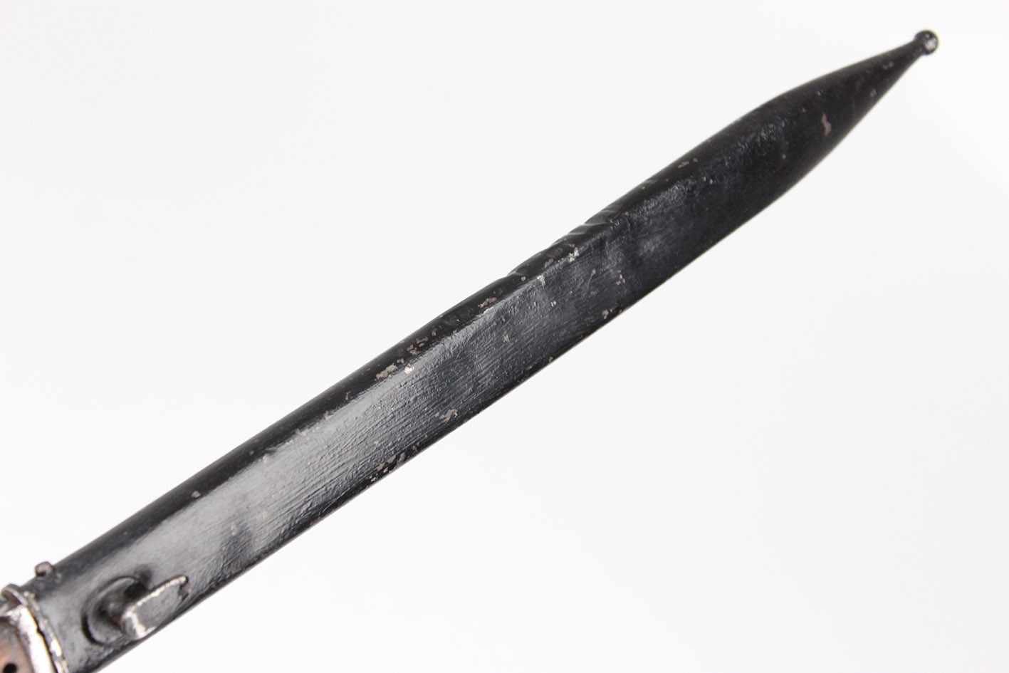 Prezentowany egzemplarz reprezentuje klasyczny wariant bojowy S.14, przeznaczony do karabinów Mauser, funkcjonalnie zbliżony do systemu S84/98, choć formalnie pozostający konstrukcją odrębną. Głownia jednosieczna, bez piły, o charakterystycznym profilu i długości odpowiadającej dokumentacji modelu, zachowana jest w bardzo dobrym stanie, z czytelną geometrią i jedynie drobnymi, powierzchniowymi śladami użytkowania. Na grzbiecie głowni widoczne są bawarskie punce odbiorcze – litera „L” pod koroną, jednoznacznie identyfikowane jako znak odbioru z okresu panowania Ludwiga III, króla Bawarii (1913–1918), co stanowi istotny i rzadko zachowany element potwierdzający wojskową akceptację egzemplarza. Rękojeść wykonana z jednego kawałka drewna, z charakterystycznymi poprzecznymi nacięciami poprawiającymi chwyt, zachowana oryginalnie, bez wymian i wtórnych ingerencji. Pochwa stalowa, z mocnym, wyraźnie zachowanym dławikiem, konstrukcyjnie zgodna z okresem. Czarna farba ochronna jest najprawdopodobniej wtórna, jednak stara, wykonana jeszcze w epoce użytkowania wojskowego lub bezpośrednio po niej. Na pochwie widoczne są delikatne wgniecenia, dokładnie pokazane na zdjęciach, typowe dla egzemplarzy noszonych i używanych w warunkach frontowych, bez śladów późniejszych napraw czy prostowania.