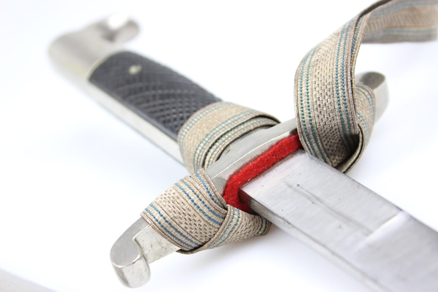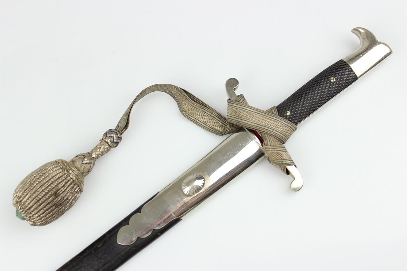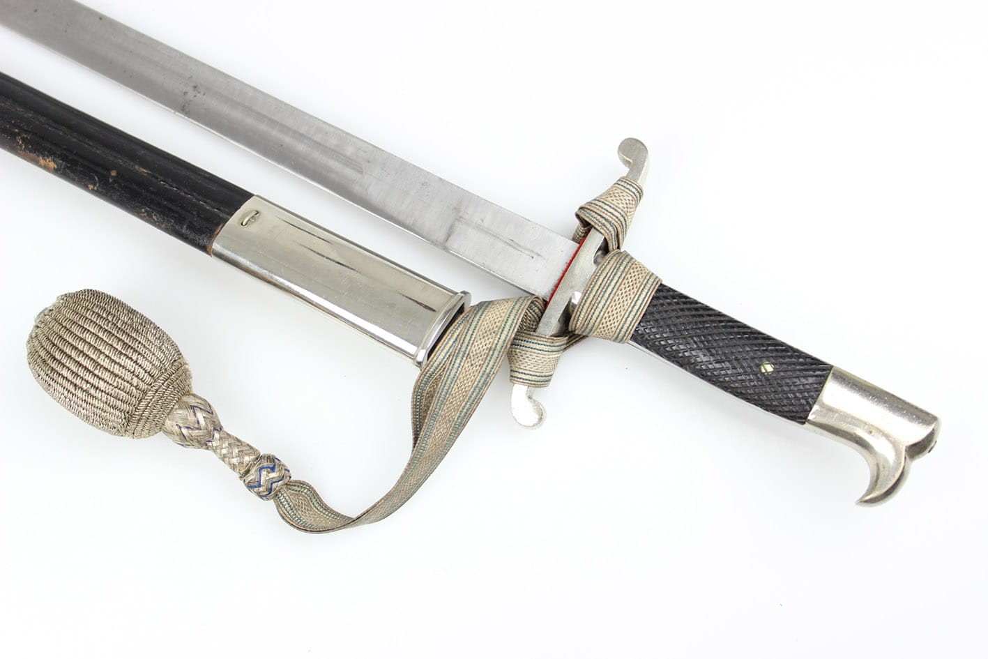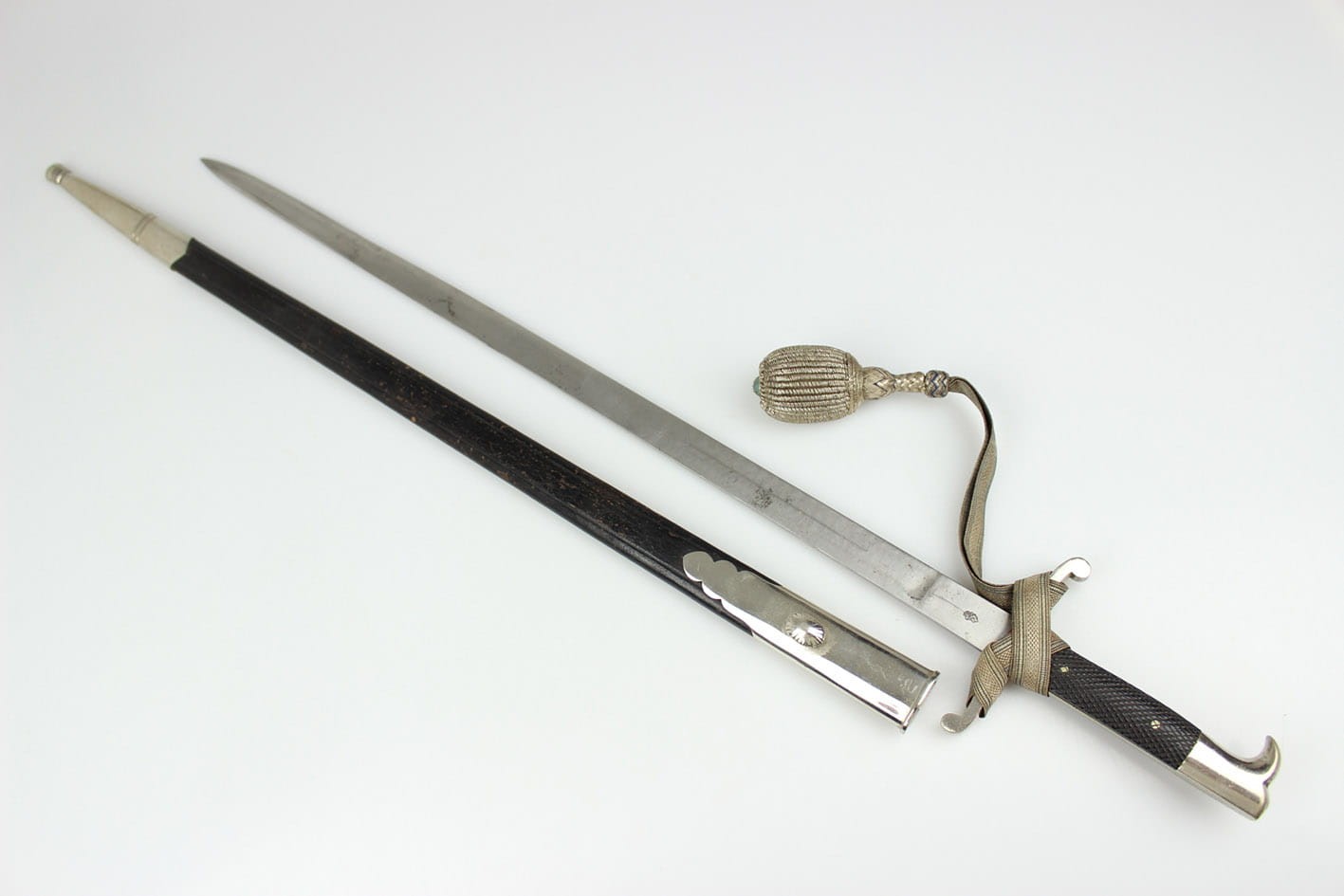 Najbardziej reprezentatywny wariant prywatnego bagnetu nawiązujący do wersji bojowej w typie Hirschfanger z wytwórni Kirschbaum Solingen produkowany na Bawarię, głownia obustronnie zdobiona bawarskim mottem "In Treue Fest", sygnowany na progu logo z wizerunkiem rycerza w przyłbicy ( produkcja do 1883 r). Pełne niklowanie metalowych elementów, szew pochwy w fabrycznym idealnym stanie, okładziny nigdy nie rozkuwane, w komplecie oficerski bawarski temblak wykonany w całości z metalowej plecionki w barwie srebrno-niebieskiej. Całość w stanie kolekcjonerskim, nie tykany z zachowanym materiałem w kolorze czerwonym pod jelcem. Wymiary: