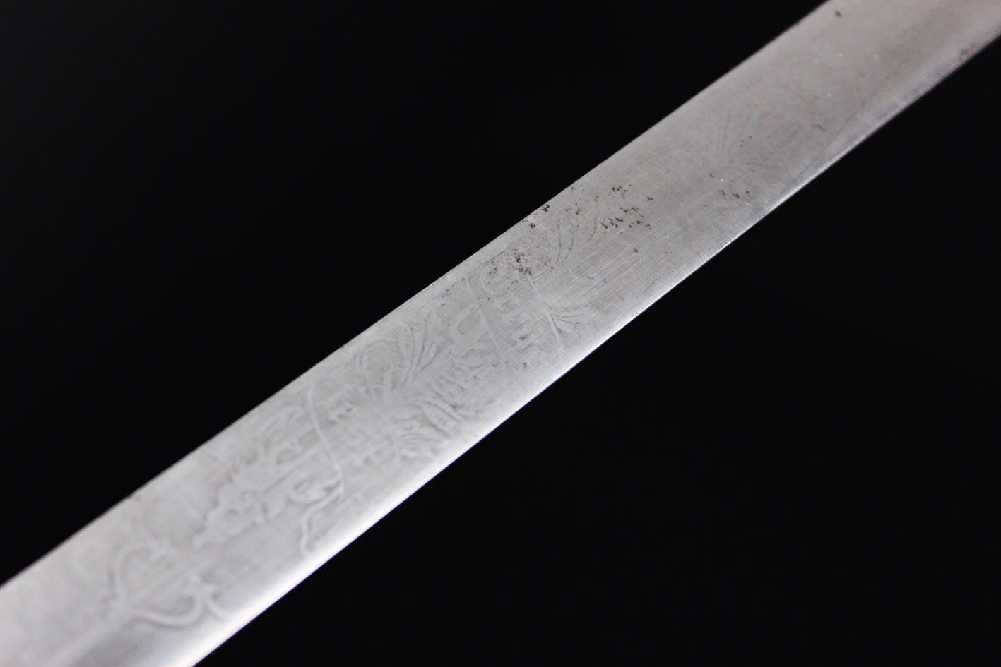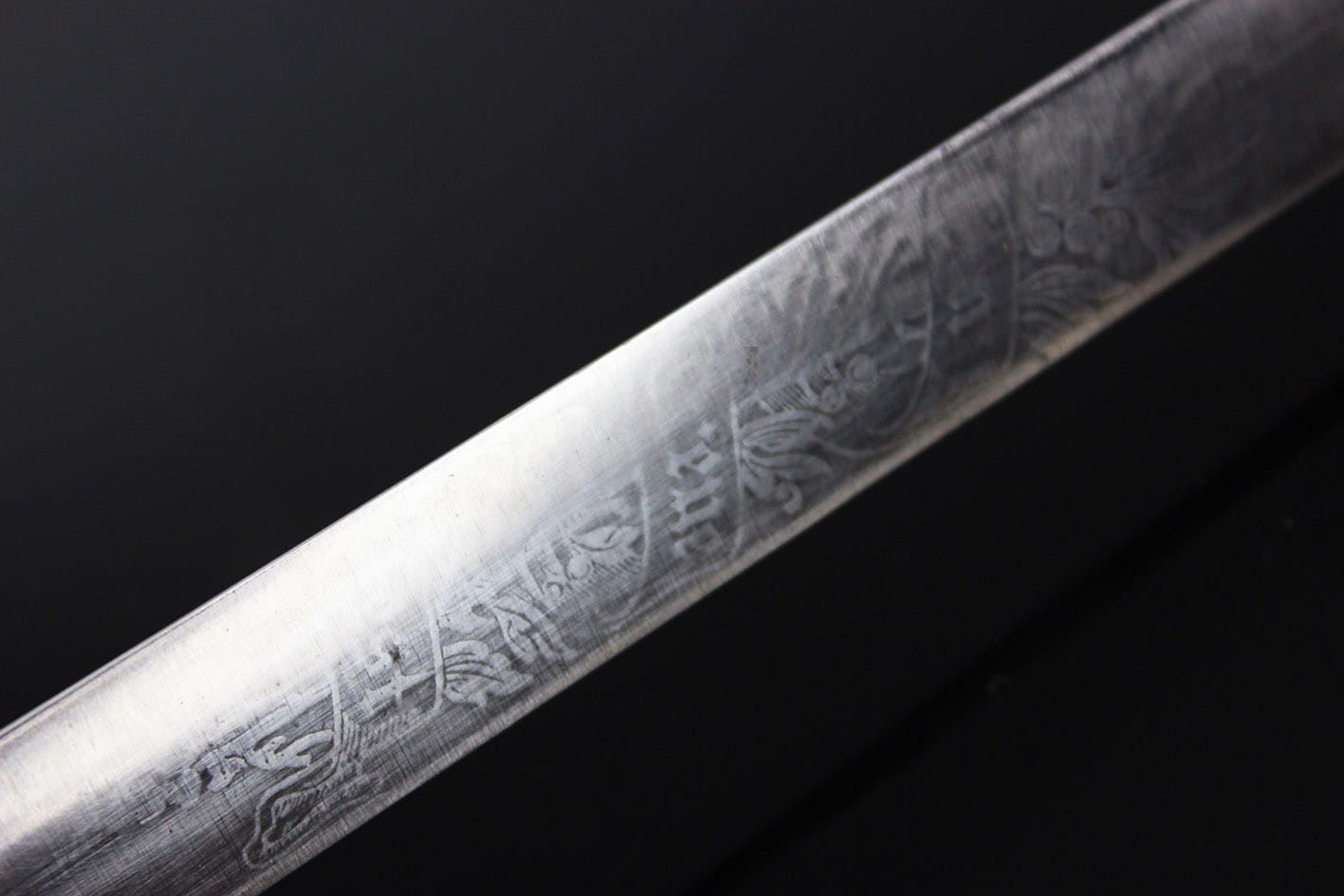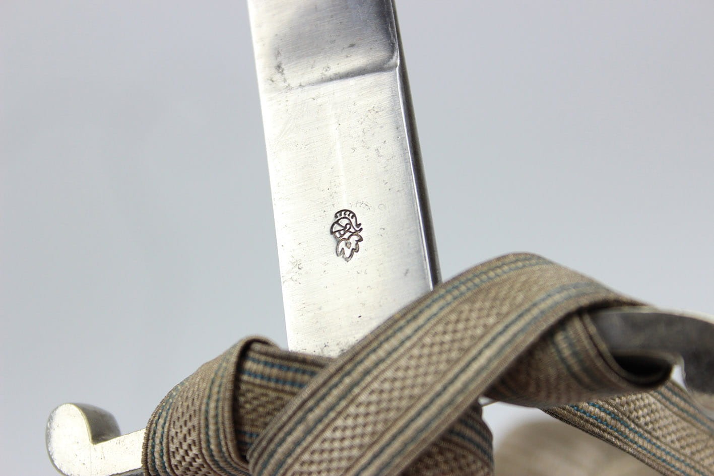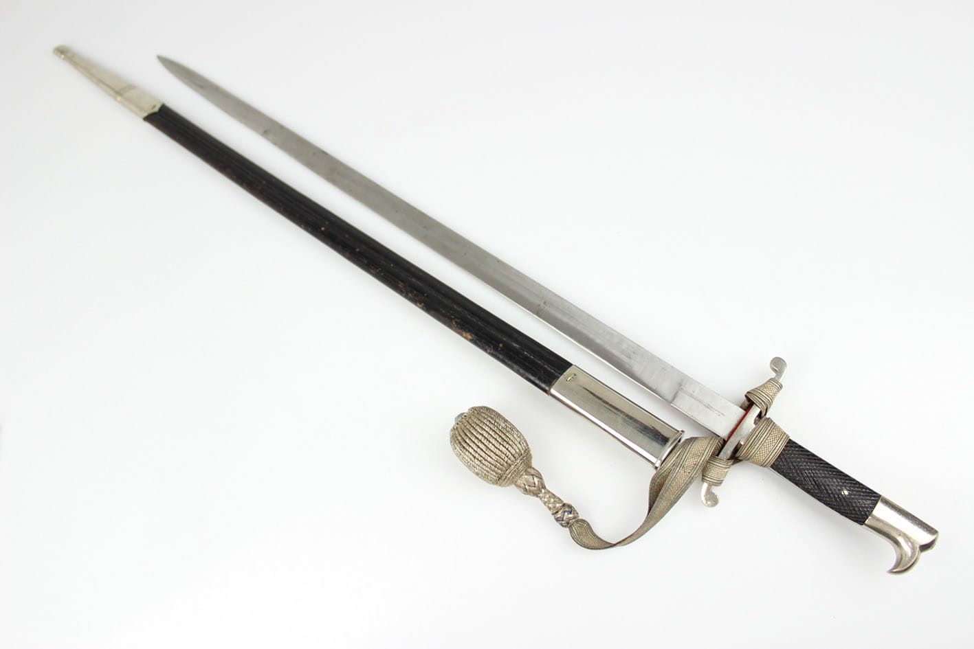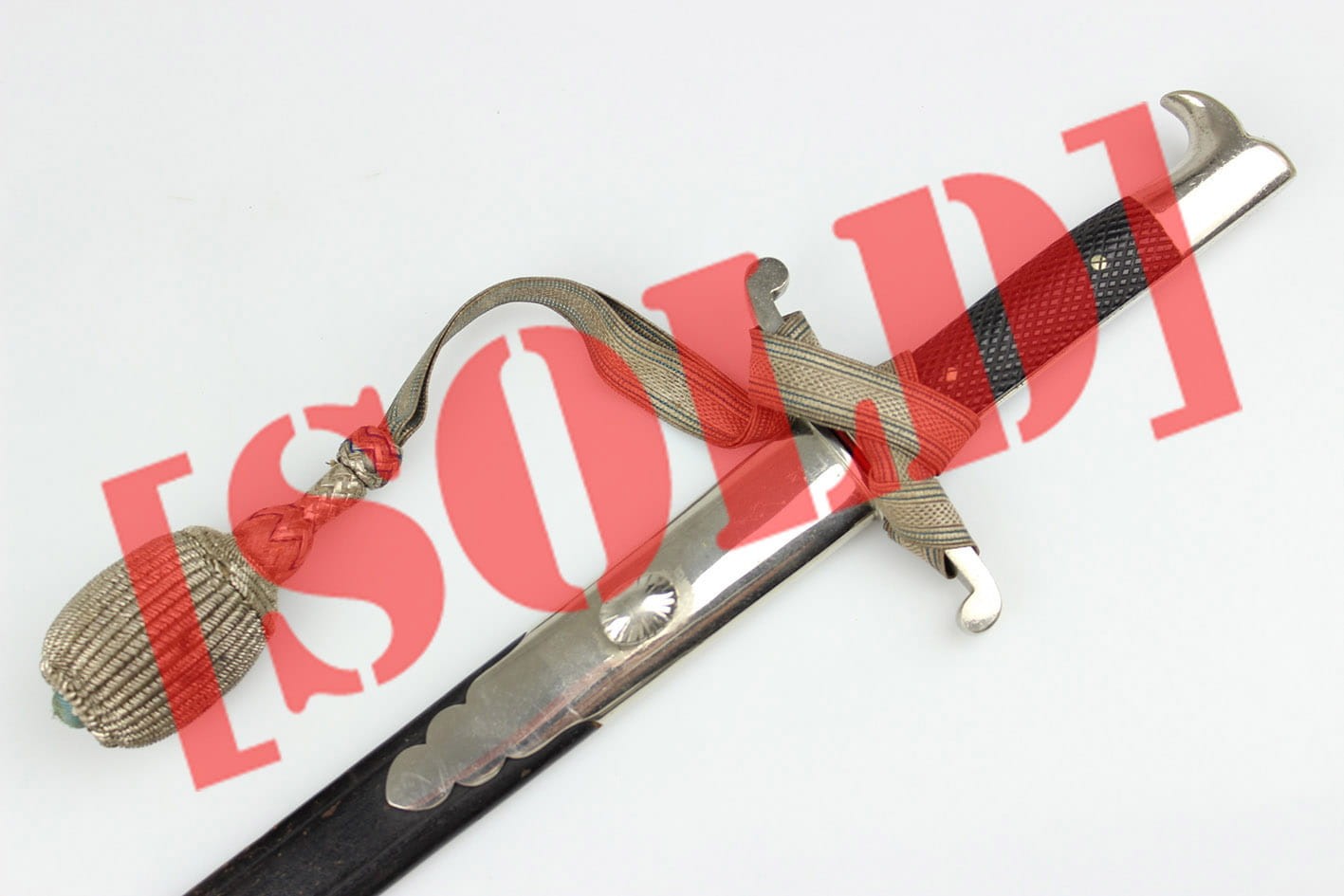 Najbardziej reprezentatywny wariant prywatnego bagnetu nawiązujący do wersji bojowej w typie Hirschfanger z wytwórni Kirschbaum Solingen produkowany na Bawarię, głownia obustronnie zdobiona bawarskim mottem "In Treue Fest", sygnowany na progu logo z wizerunkiem rycerza w przyłbicy ( produkcja do 1883 r). Pełne niklowanie metalowych elementów, szew pochwy w fabrycznym idealnym stanie, okładziny nigdy nie rozkuwane, w komplecie oficerski bawarski temblak wykonany w całości z metalowej plecionki w barwie srebrno-niebieskiej. Całość w stanie kolekcjonerskim, nie tykany z zachowanym materiałem w kolorze czerwonym pod jelcem. Wymiary:
