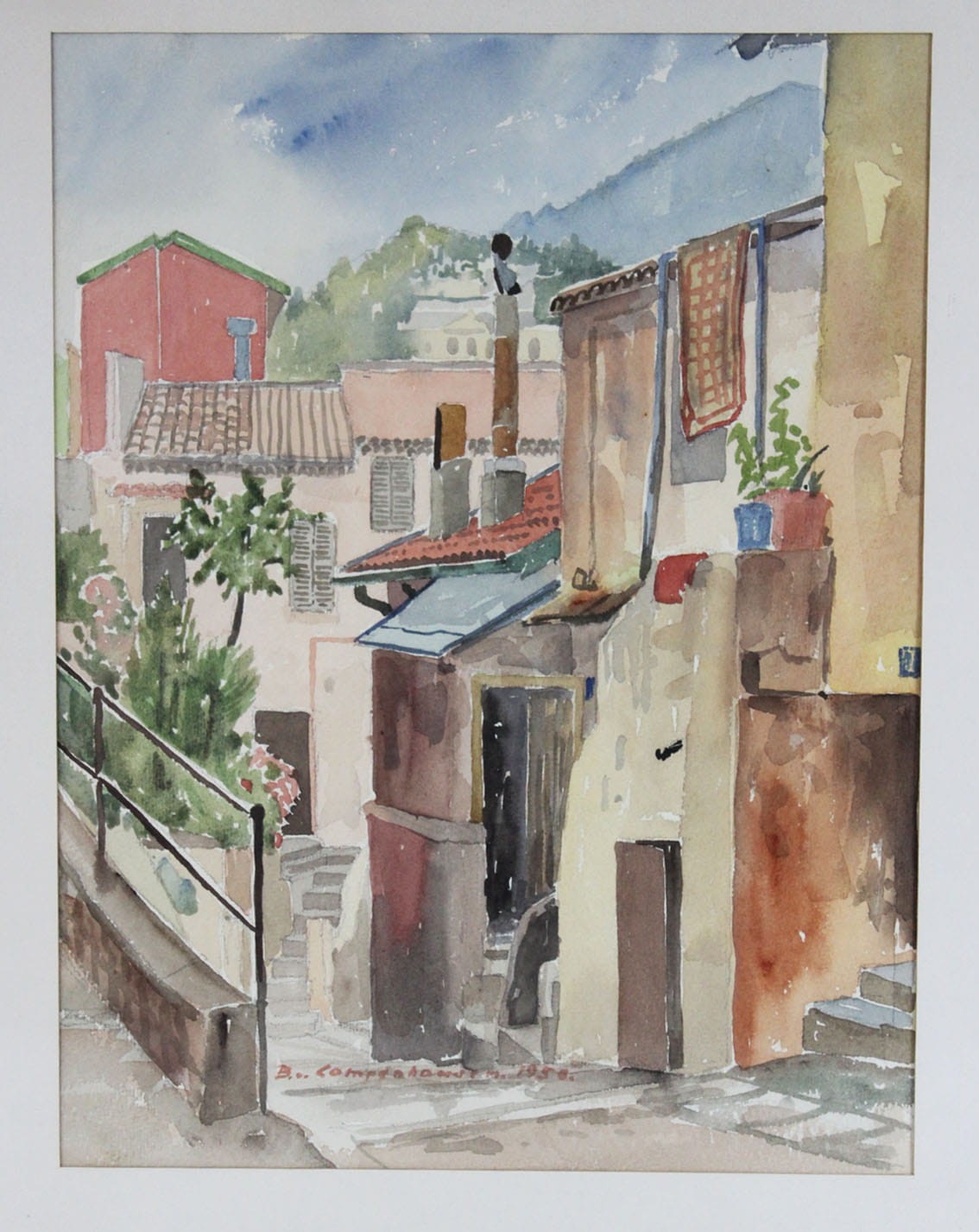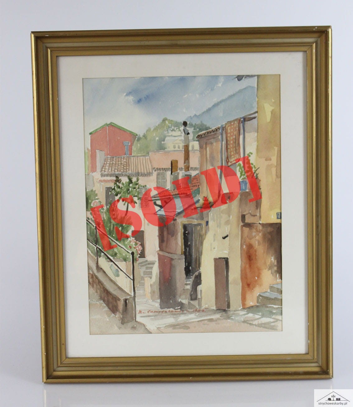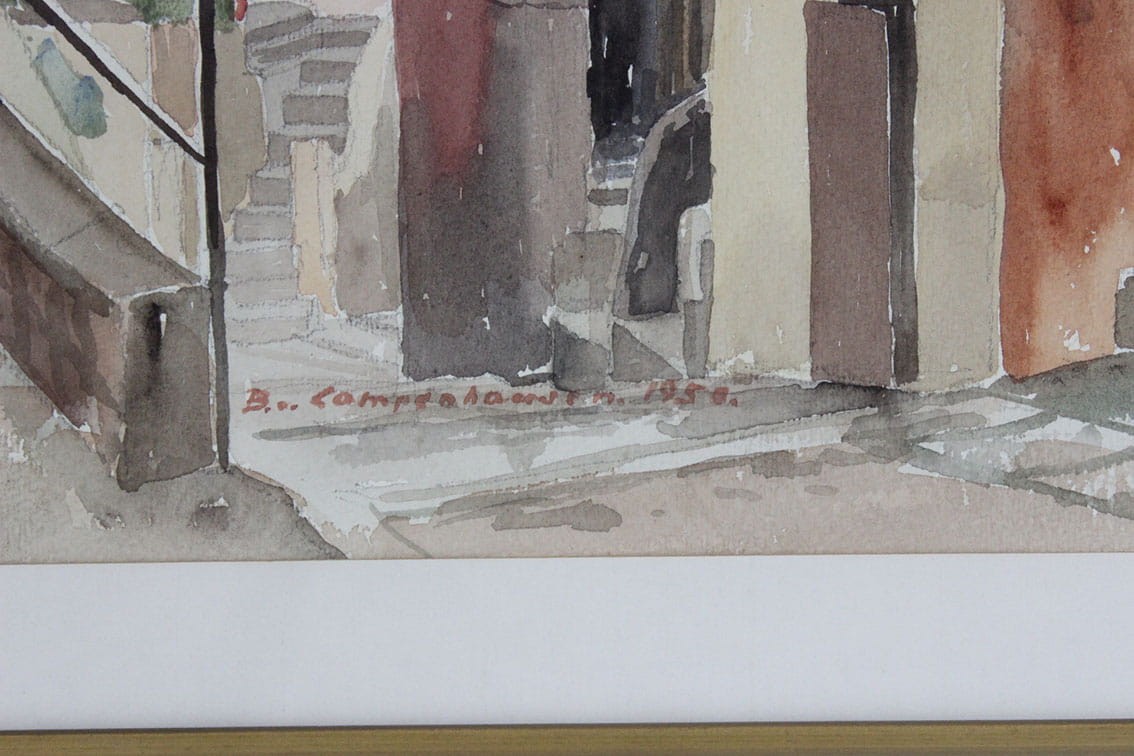 Akwarela znanego szwedzkiego-niemieckiego artysty Bodo von Campenhausen ( 1898-1988) z 1950 roku przedstawiają pejzaż miejski z krajów bałkańskich. Całość w passe partout, za szkłem w drewnianej ramie. Wymiary: