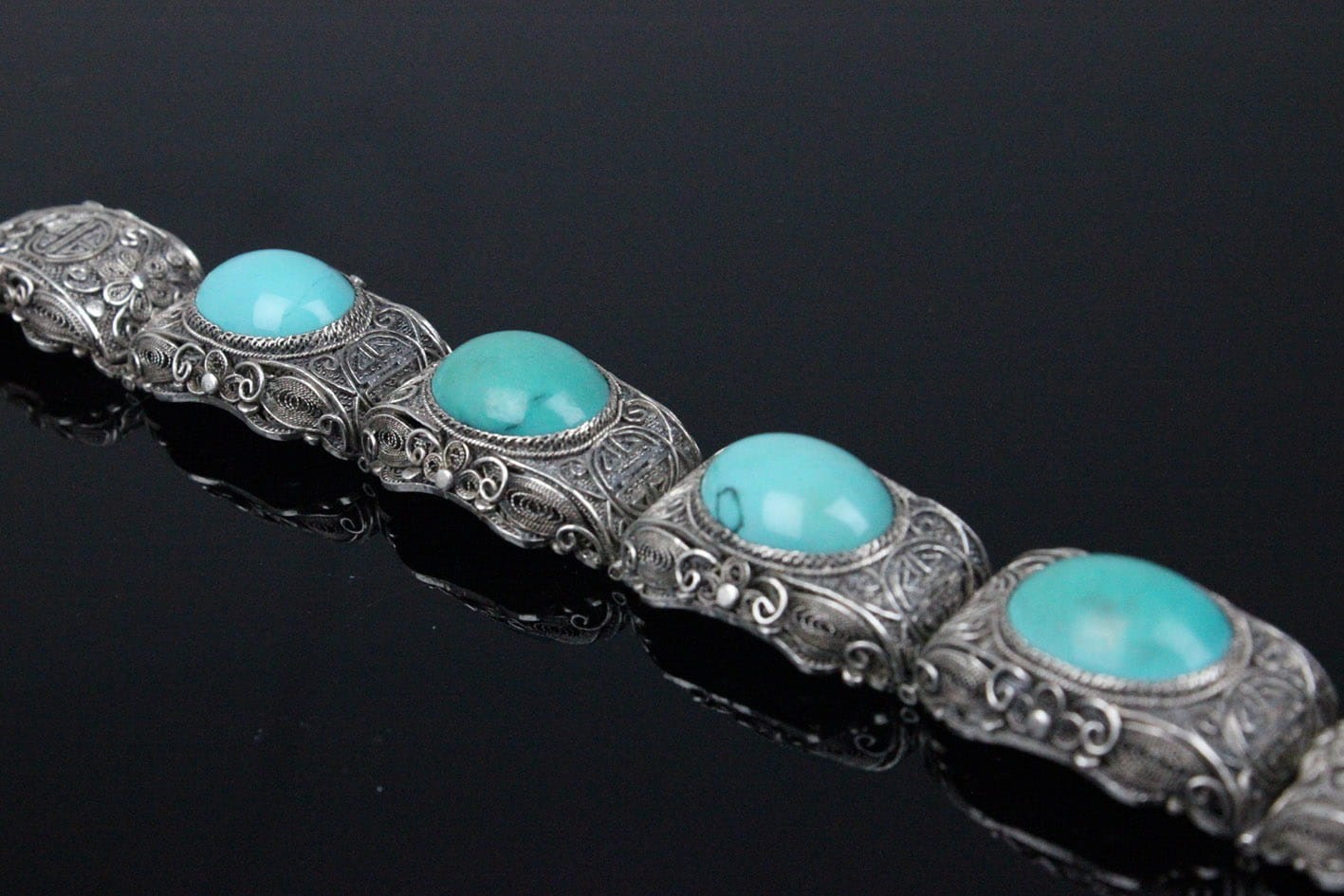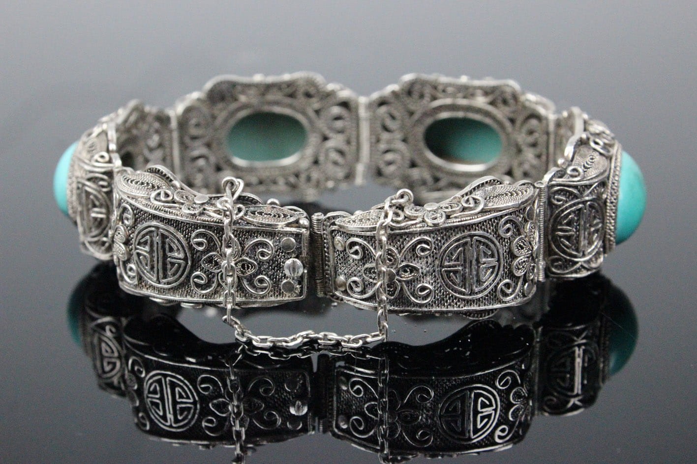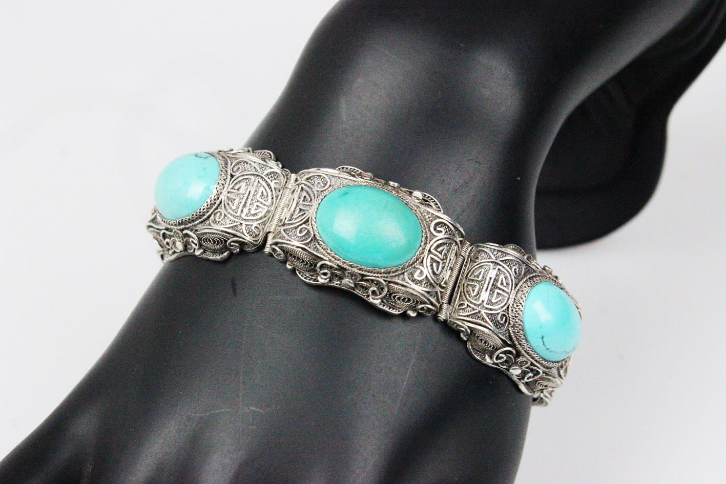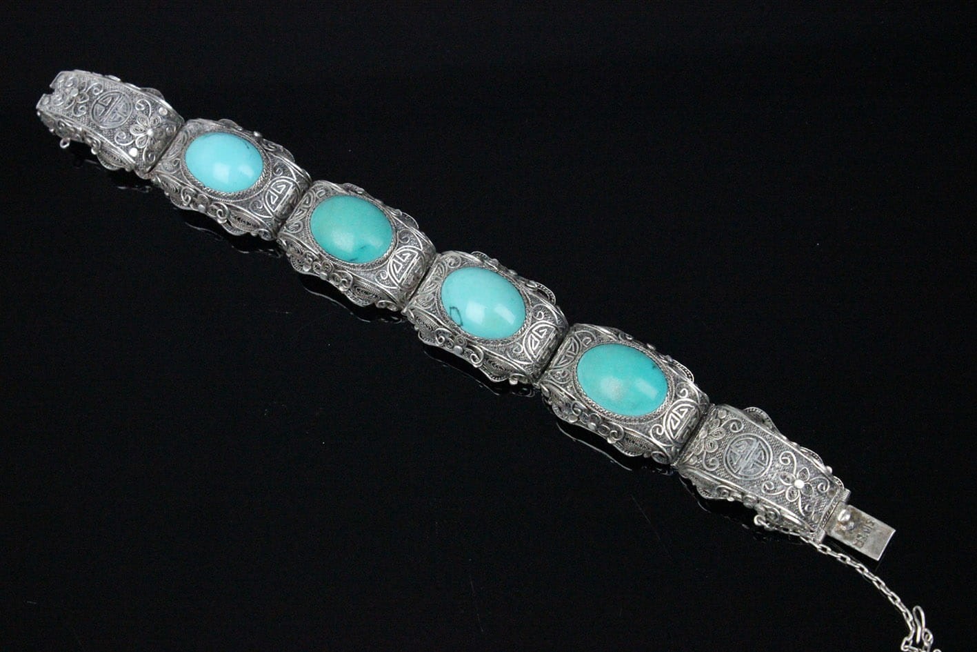 Oryginalna chińska bransoletka pochodząca z lat 50/60-tych XX wieku. Wyrób eksportowy, wykonany w srebrze sygnowany charakterystyczną dla tej grupy wyrobów puncą SILVER. Cztery segmenty kameryzowane pokaźnym turkusem w szlifie kaboszonowym. Całość w bardzo dobrym stanie zachowania z dodatkowym łańcuszkiem zabezpieczającym. Wymiary: