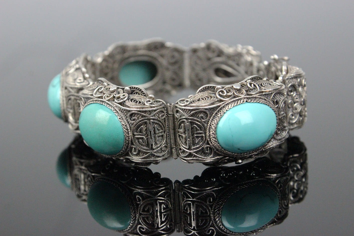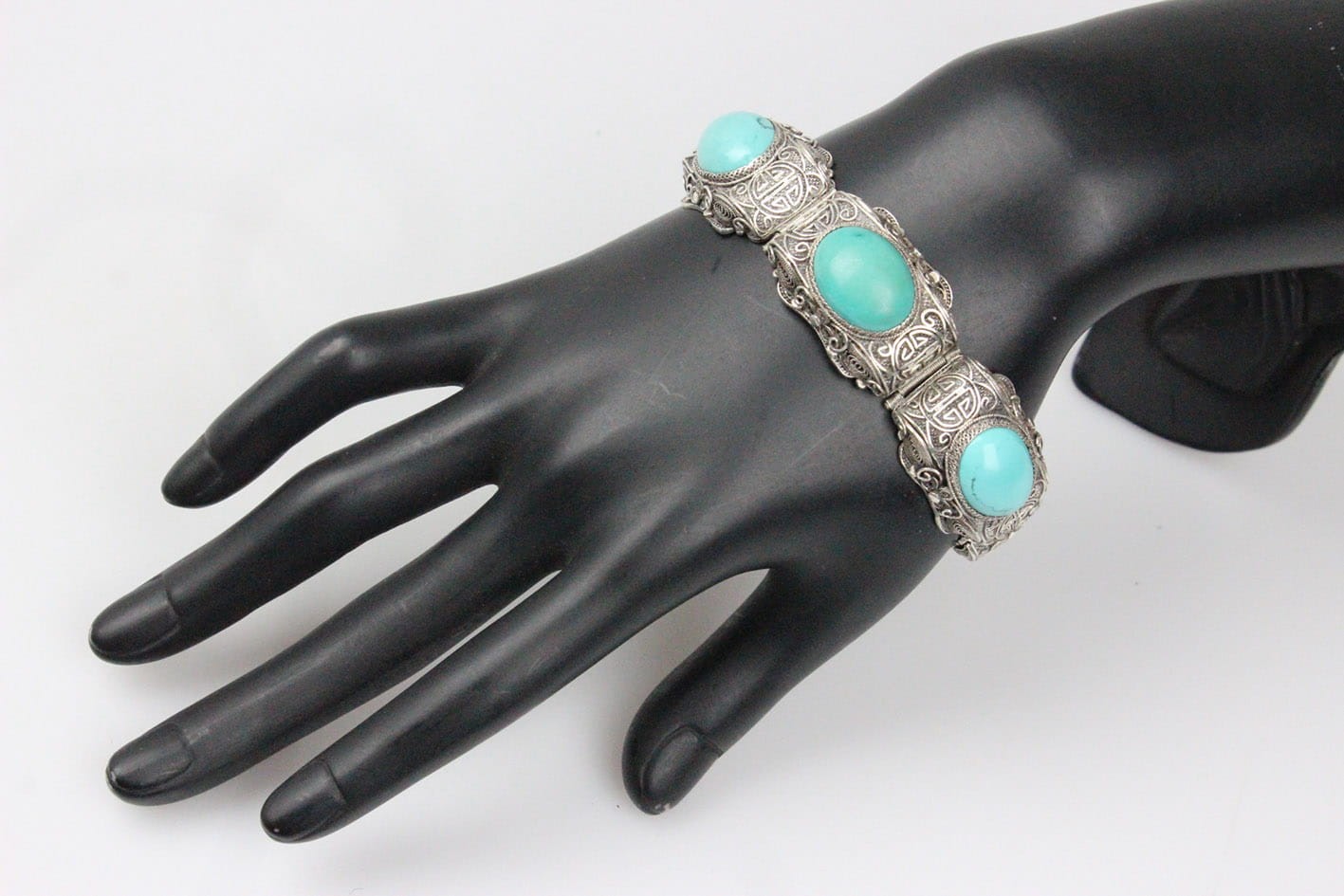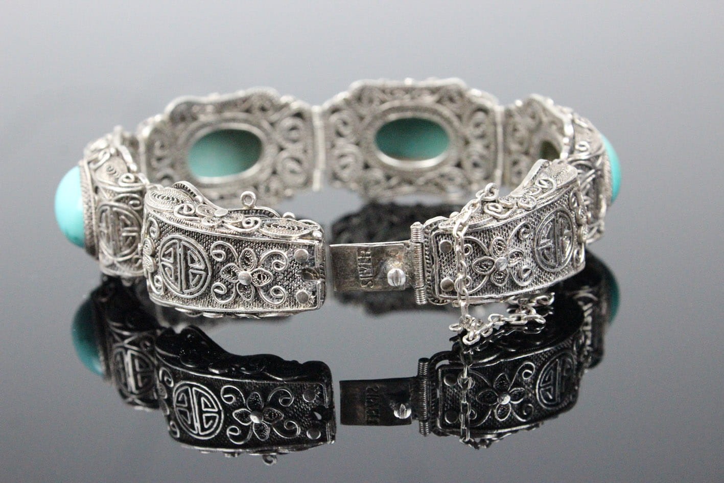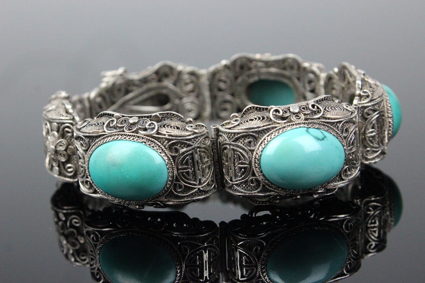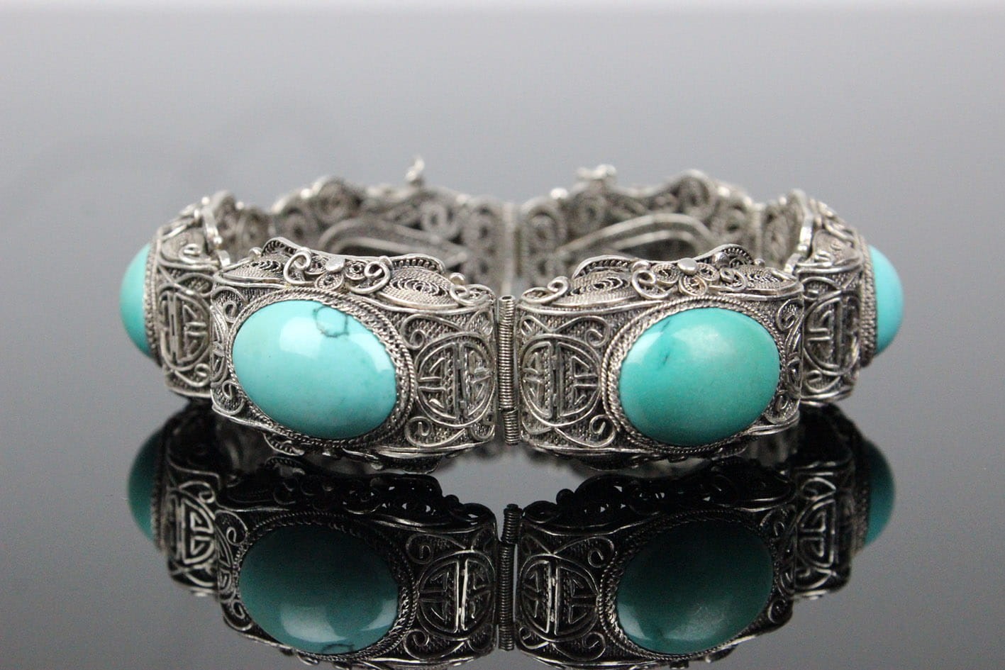 Oryginalna chińska bransoletka pochodząca z lat 50/60-tych XX wieku. Wyrób eksportowy, wykonany w srebrze sygnowany charakterystyczną dla tej grupy wyrobów puncą SILVER. Cztery segmenty kameryzowane pokaźnym turkusem w szlifie kaboszonowym. Całość w bardzo dobrym stanie zachowania z dodatkowym łańcuszkiem zabezpieczającym. Wymiary: