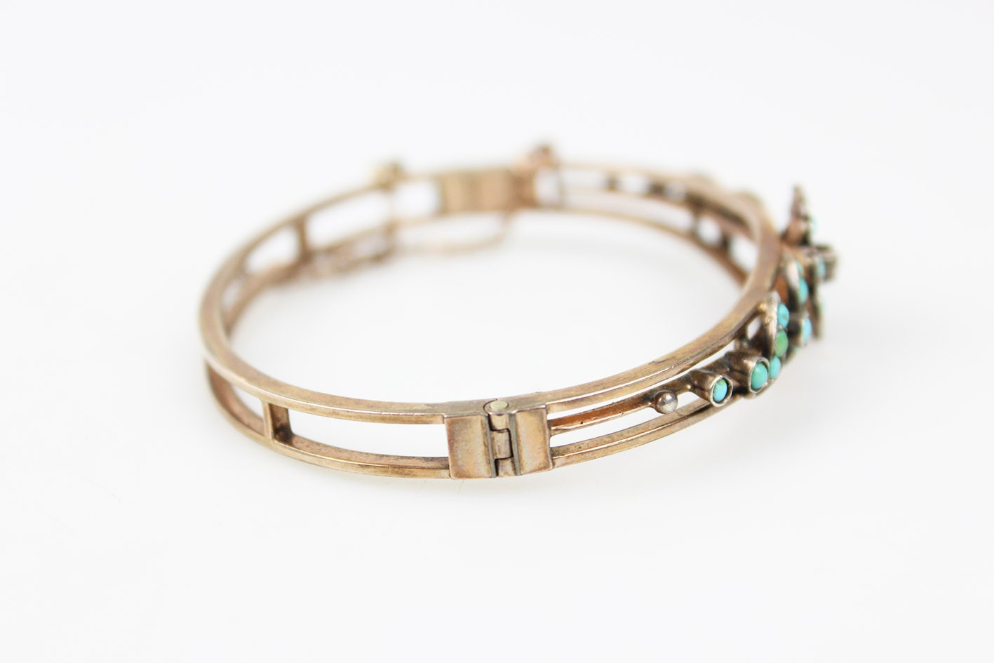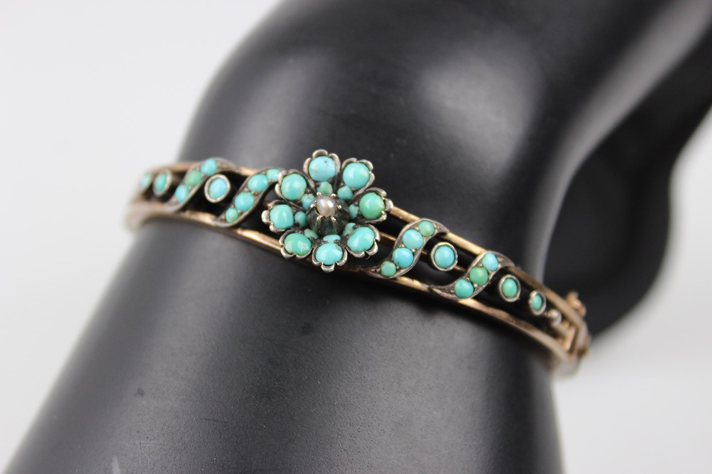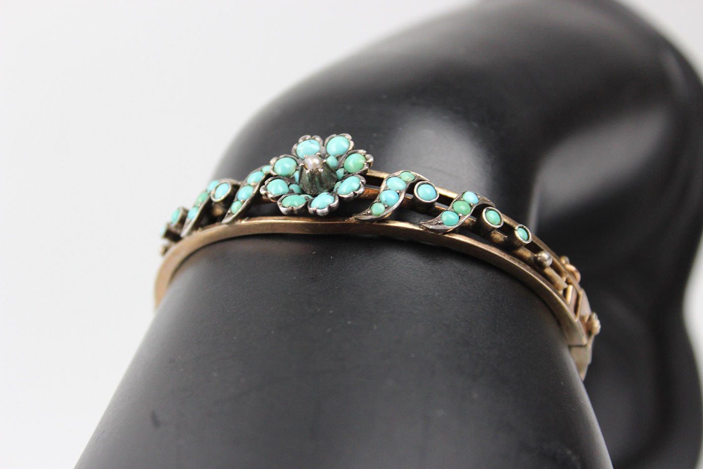 Korpus bransoletki wykonano w technice double z grubo złoconego mosiądzu. Elementy dekoracyjne wykonano w złoconym srebrze i bogato zdobiono naturalnymi turkusami o delikatnej, mleczno-błękitnej barwie, które w XIX wieku symbolizowały pamięć, wierność i ochronę. Centralnym akcentem kompozycji jest niewielka perełka, subtelnie podkreślająca sentymentalny, niemal intymny charakter tej ozdoby.