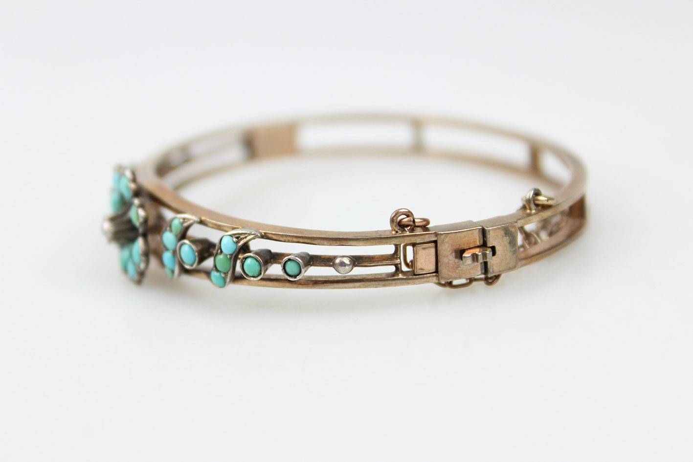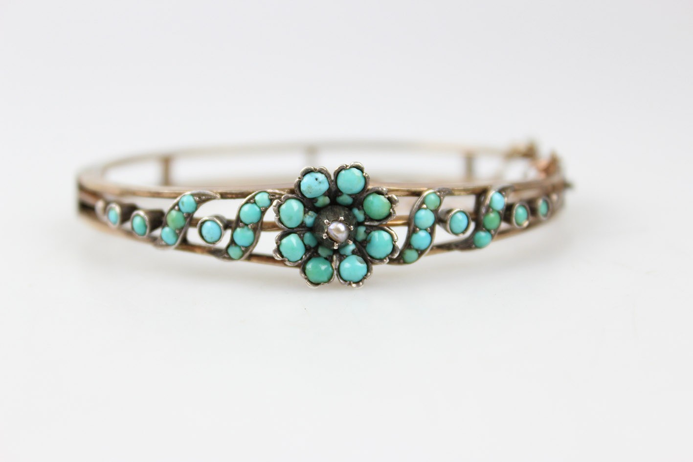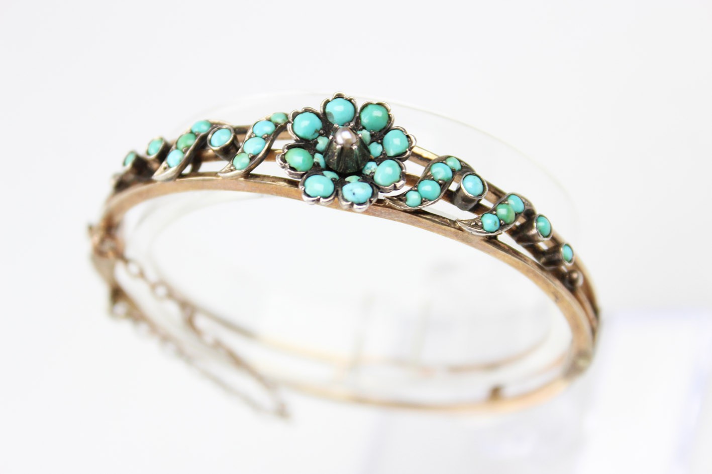 Korpus bransoletki wykonano w technice double z grubo złoconego mosiądzu. Elementy dekoracyjne wykonano w złoconym srebrze i bogato zdobiono naturalnymi turkusami o delikatnej, mleczno-błękitnej barwie, które w XIX wieku symbolizowały pamięć, wierność i ochronę. Centralnym akcentem kompozycji jest niewielka perełka, subtelnie podkreślająca sentymentalny, niemal intymny charakter tej ozdoby.