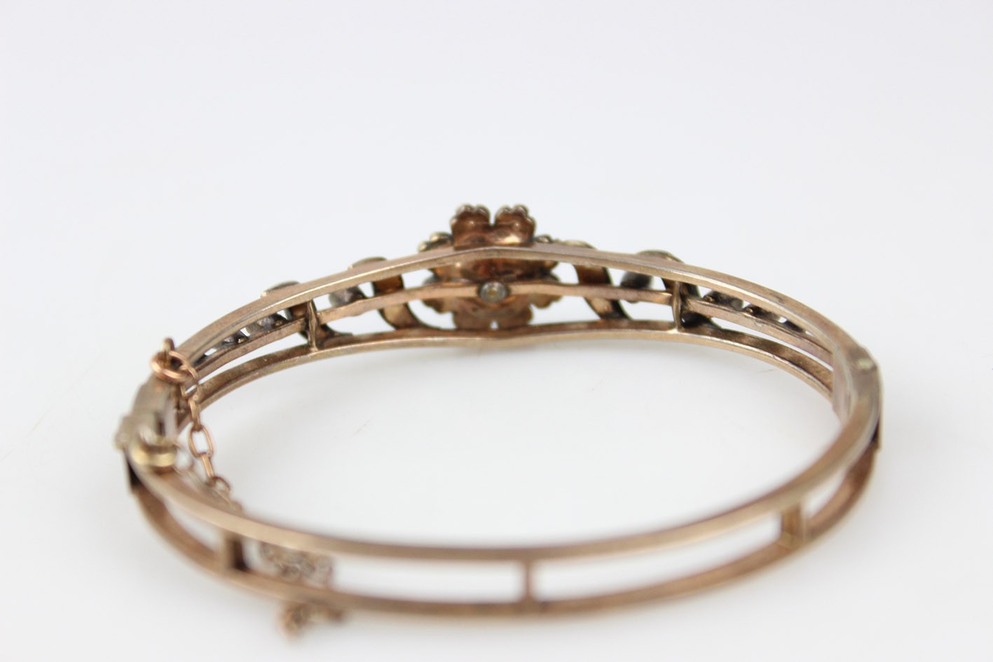 XIX-wieczna bransoletka o wyjątkowo subtelnym, sentymentalnym charakterze, reprezentująca nurt biżuterii sentymentalnej, tak popularnej w drugiej połowie XIX stulecia. Owalna forma oparta na konstrukcji z dwóch połówek połączonych zawiasem z solidnym zapięciem szufladkowym uzupełnionym łańcuszkiem zabezpieczającym, przeznaczonym do codziennego, bezpiecznego noszenia.