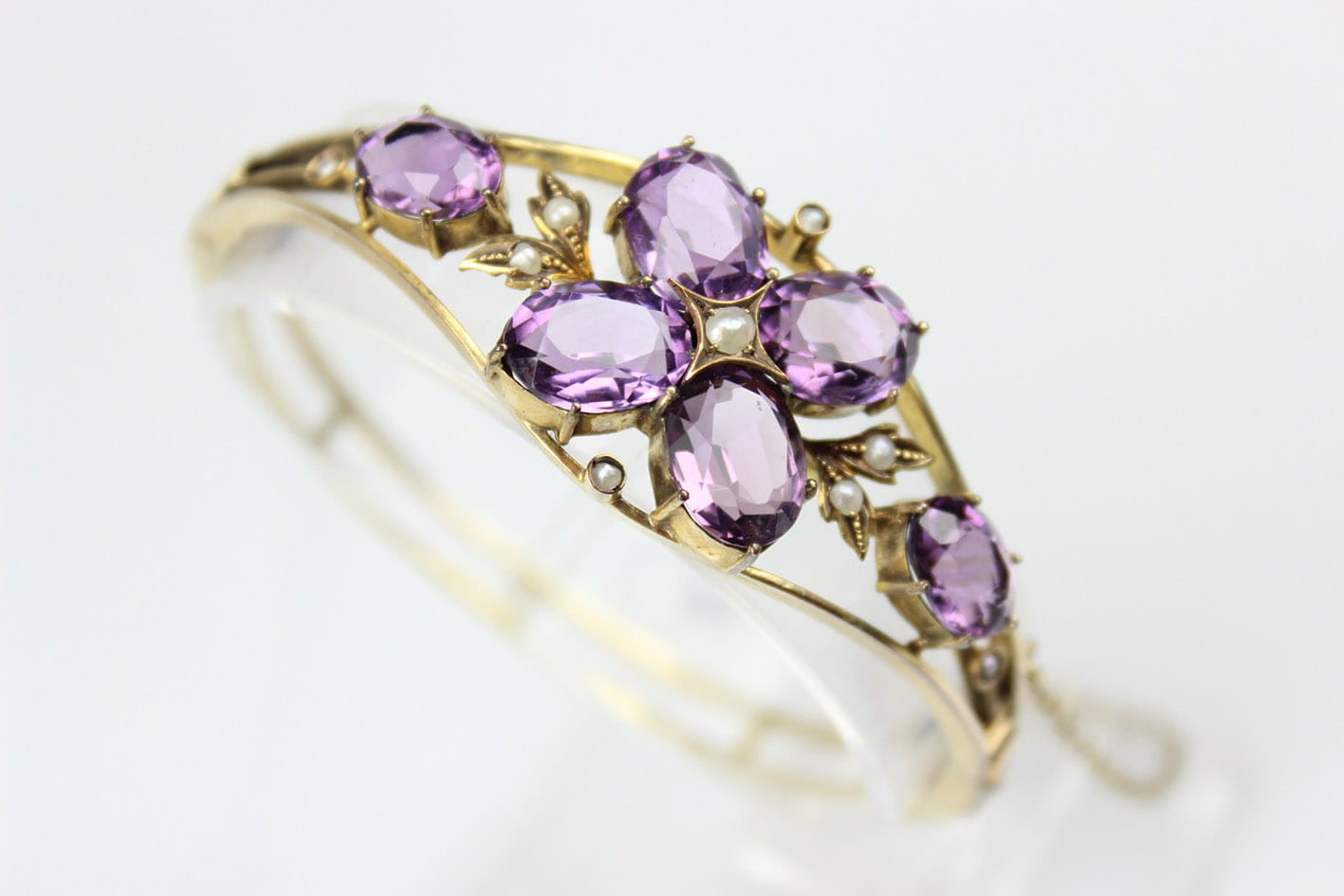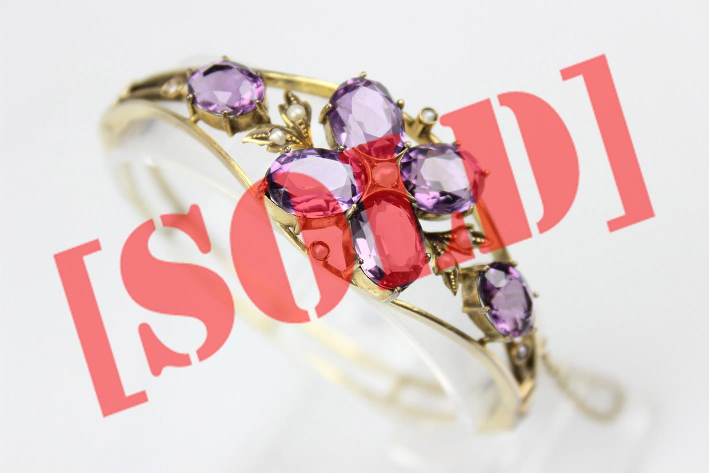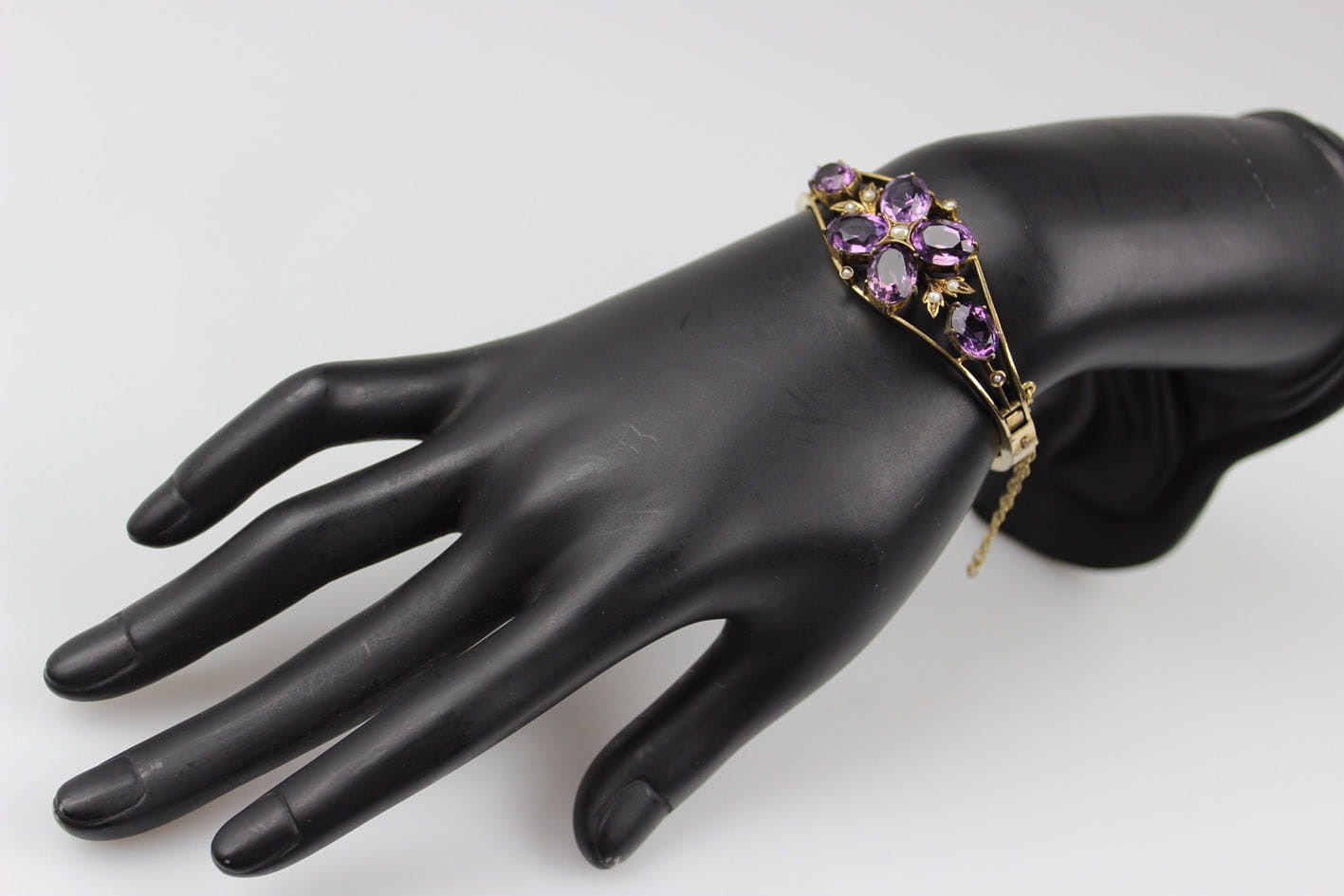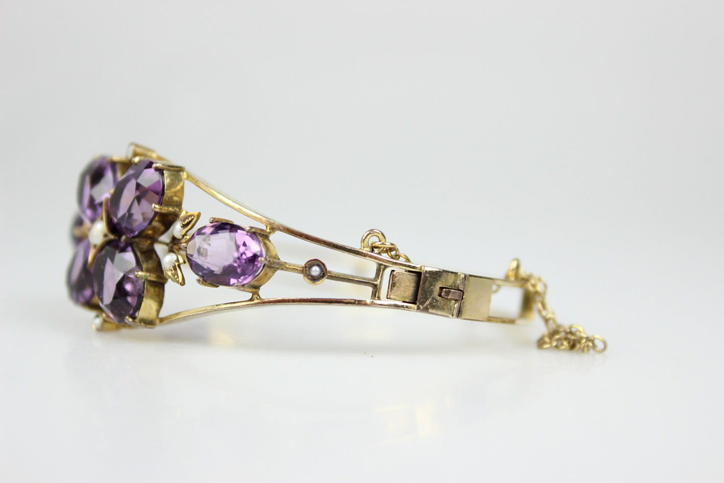 Piękna, ażurowa, wiktoriańska bransoletka pochodząca z przełomu XIX i XX wieku. Dwudzielna obręcz łączona zawiasem i zapinana na zamek szufladkowy z łańcuszkiem zabezpieczającym. Górna półobręcz rozdziela się przytrzymując kompozycję kwiatową wykonaną z naturalnych ametystów i półpereł. Podstawa w złoconym mosiądzu wykonana techniką złocenia double. Bransoletka w bardzo dobrym stanie zachowania w pełnym złoceniu. Wymiary: