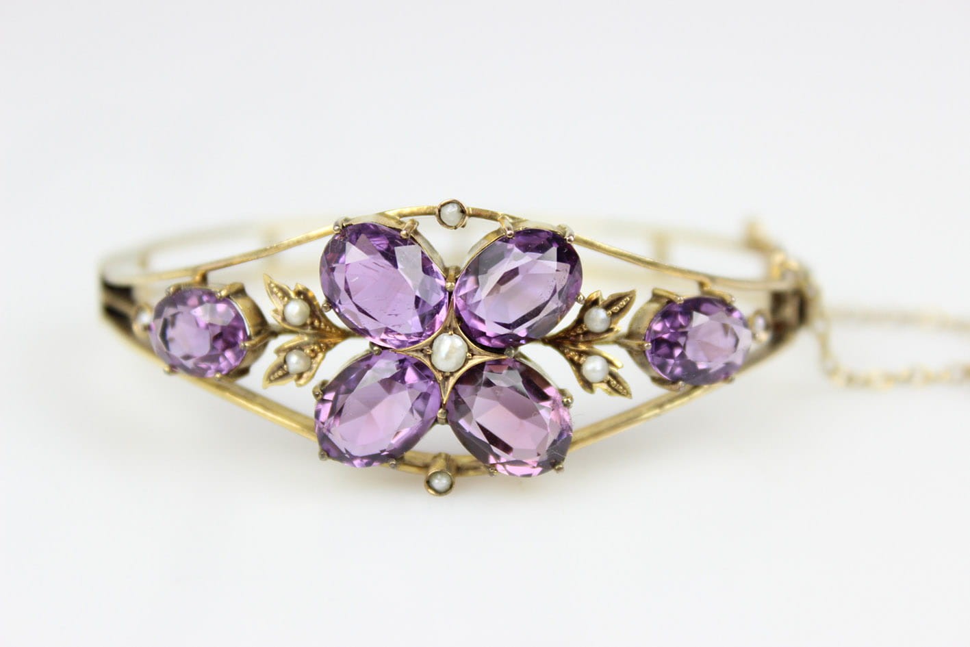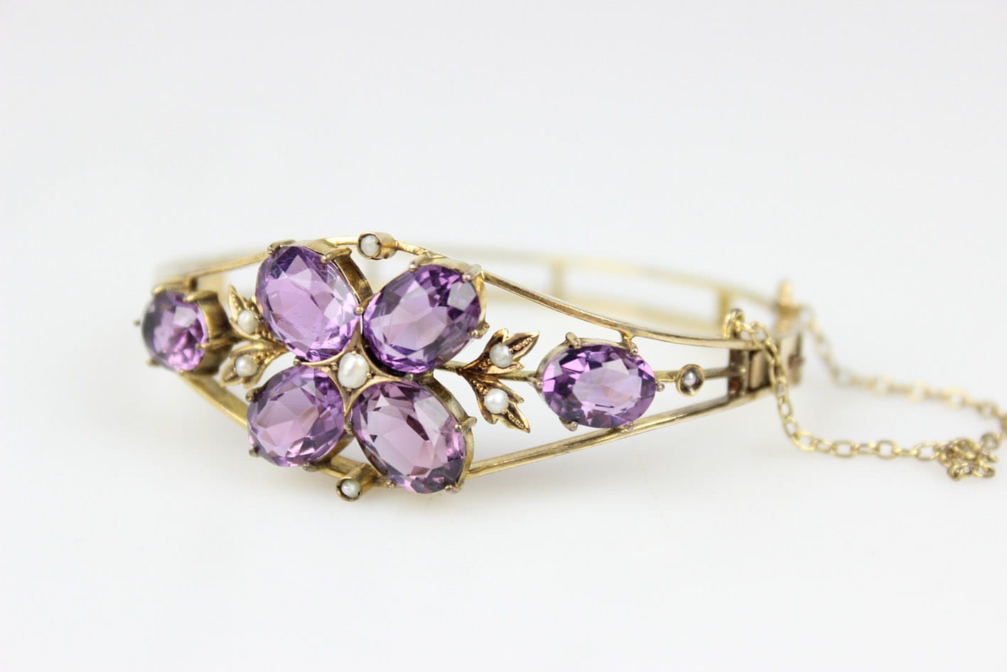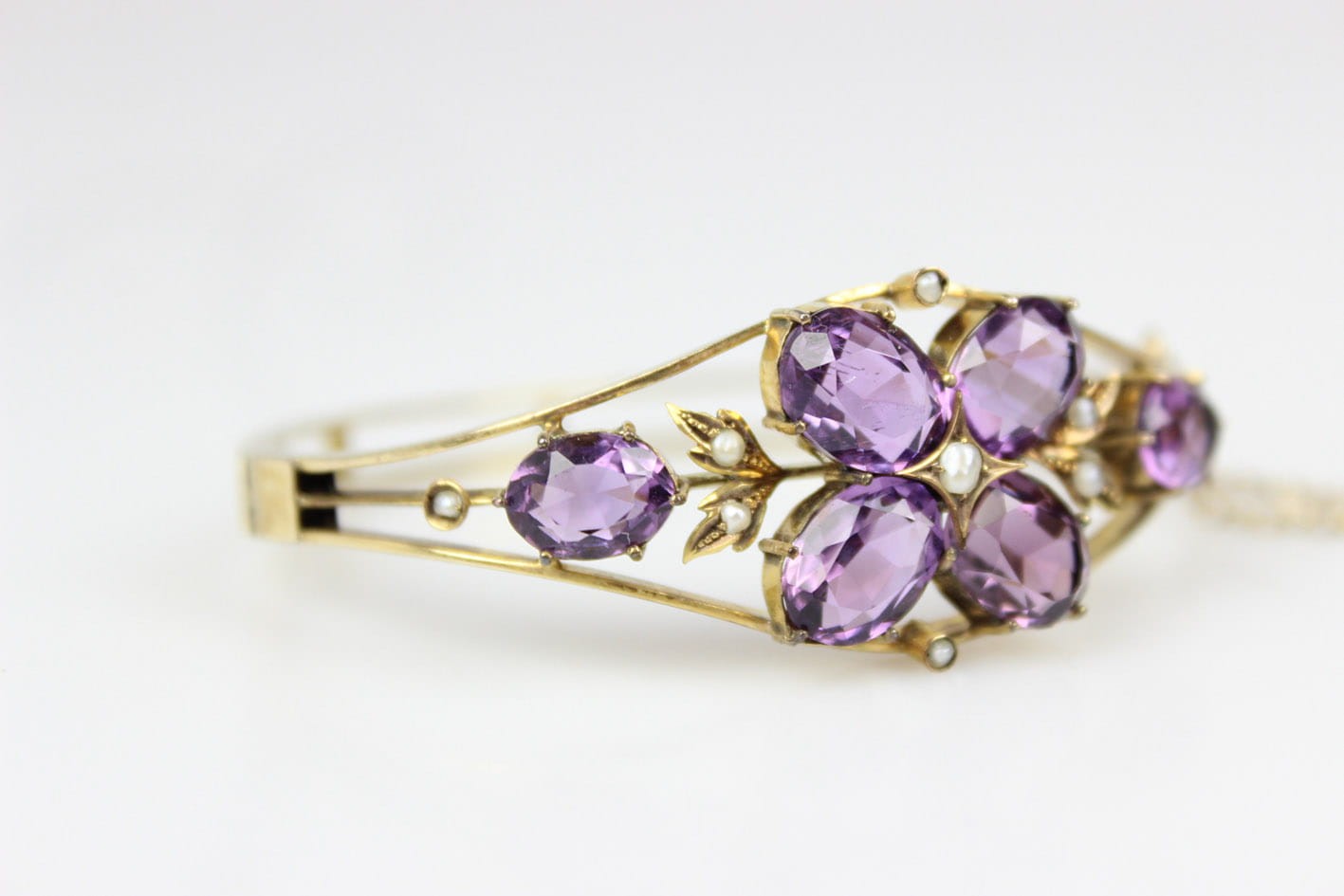 Piękna, ażurowa, wiktoriańska bransoletka pochodząca z przełomu XIX i XX wieku. Dwudzielna obręcz łączona zawiasem i zapinana na zamek szufladkowy z łańcuszkiem zabezpieczającym. Górna półobręcz rozdziela się przytrzymując kompozycję kwiatową wykonaną z naturalnych ametystów i półpereł. Podstawa w złoconym mosiądzu wykonana techniką złocenia double. Bransoletka w bardzo dobrym stanie zachowania w pełnym złoceniu. Wymiary: