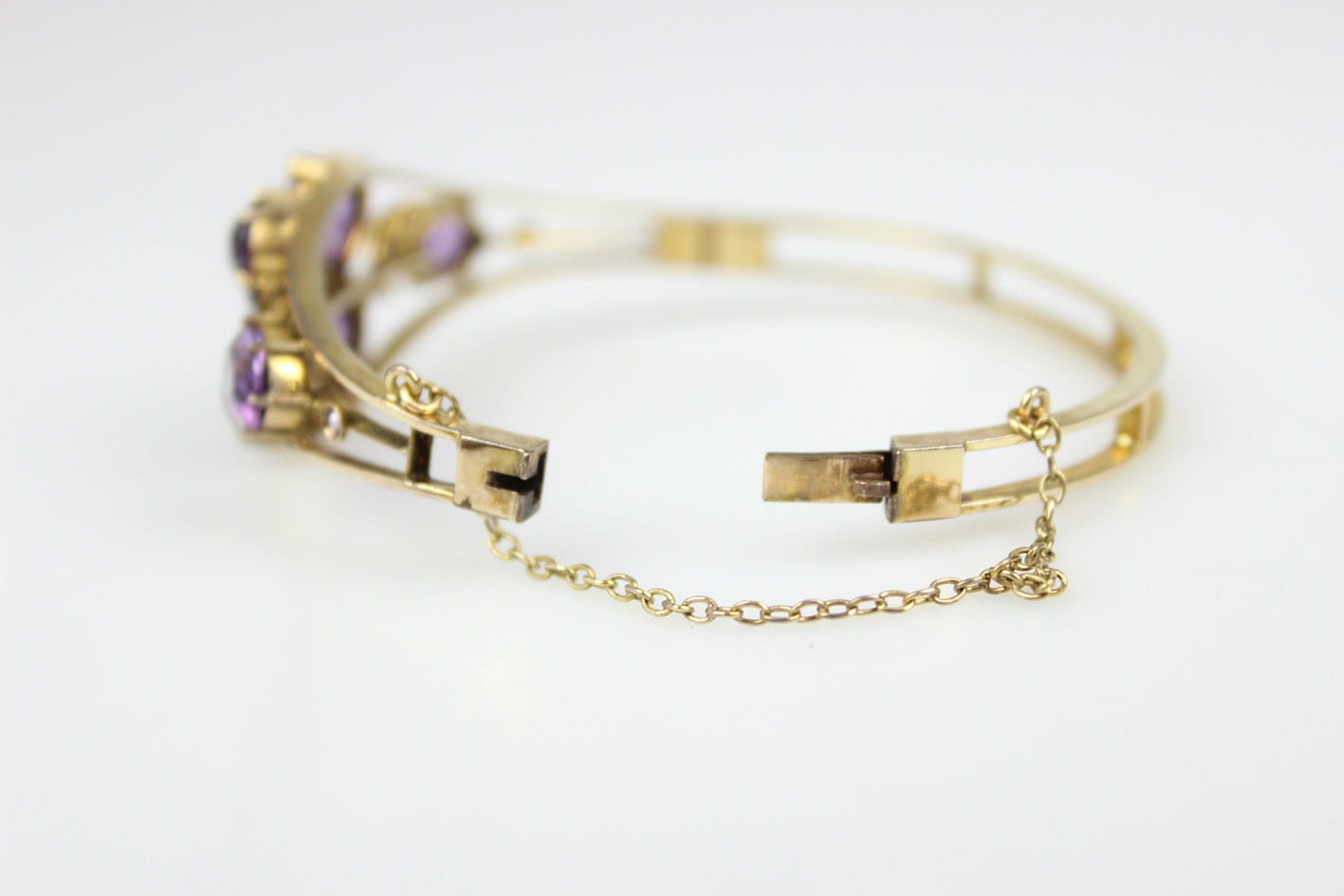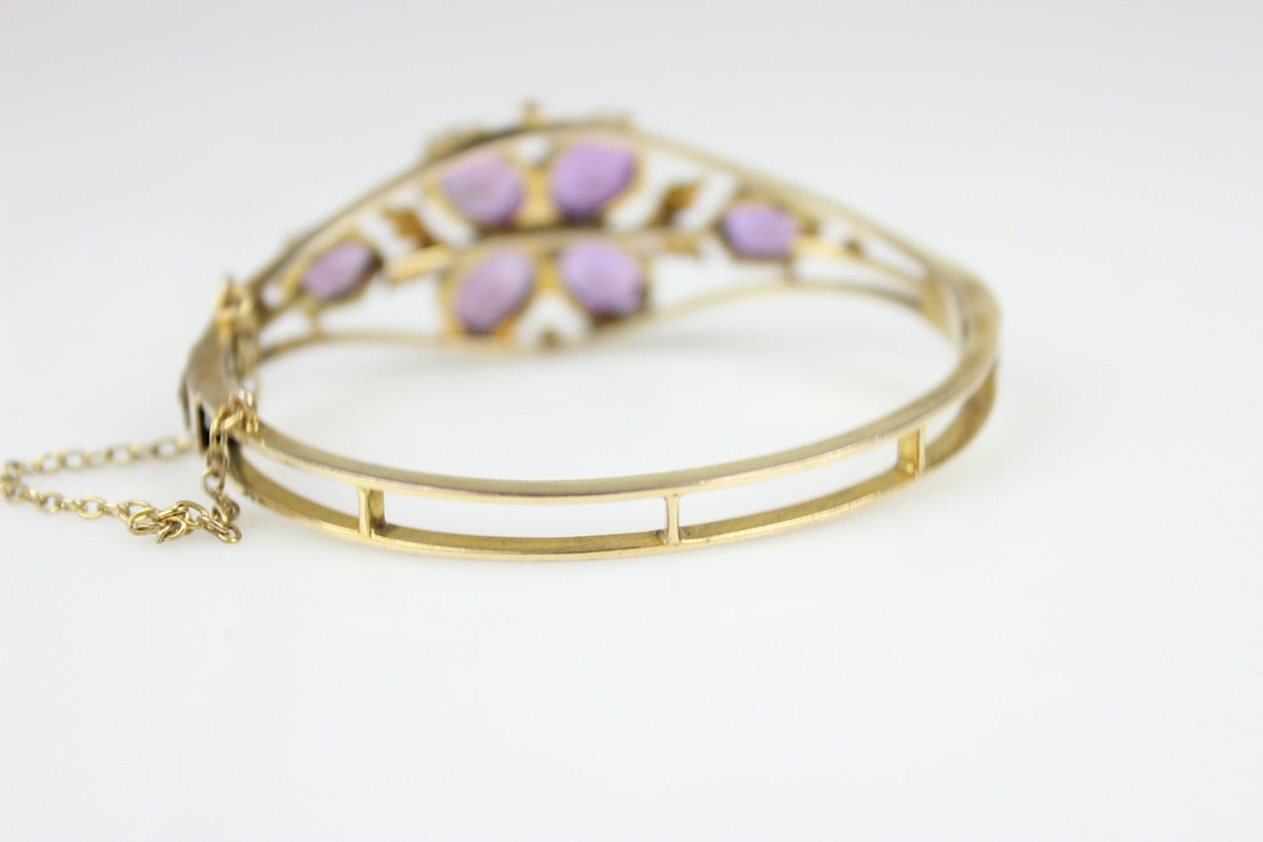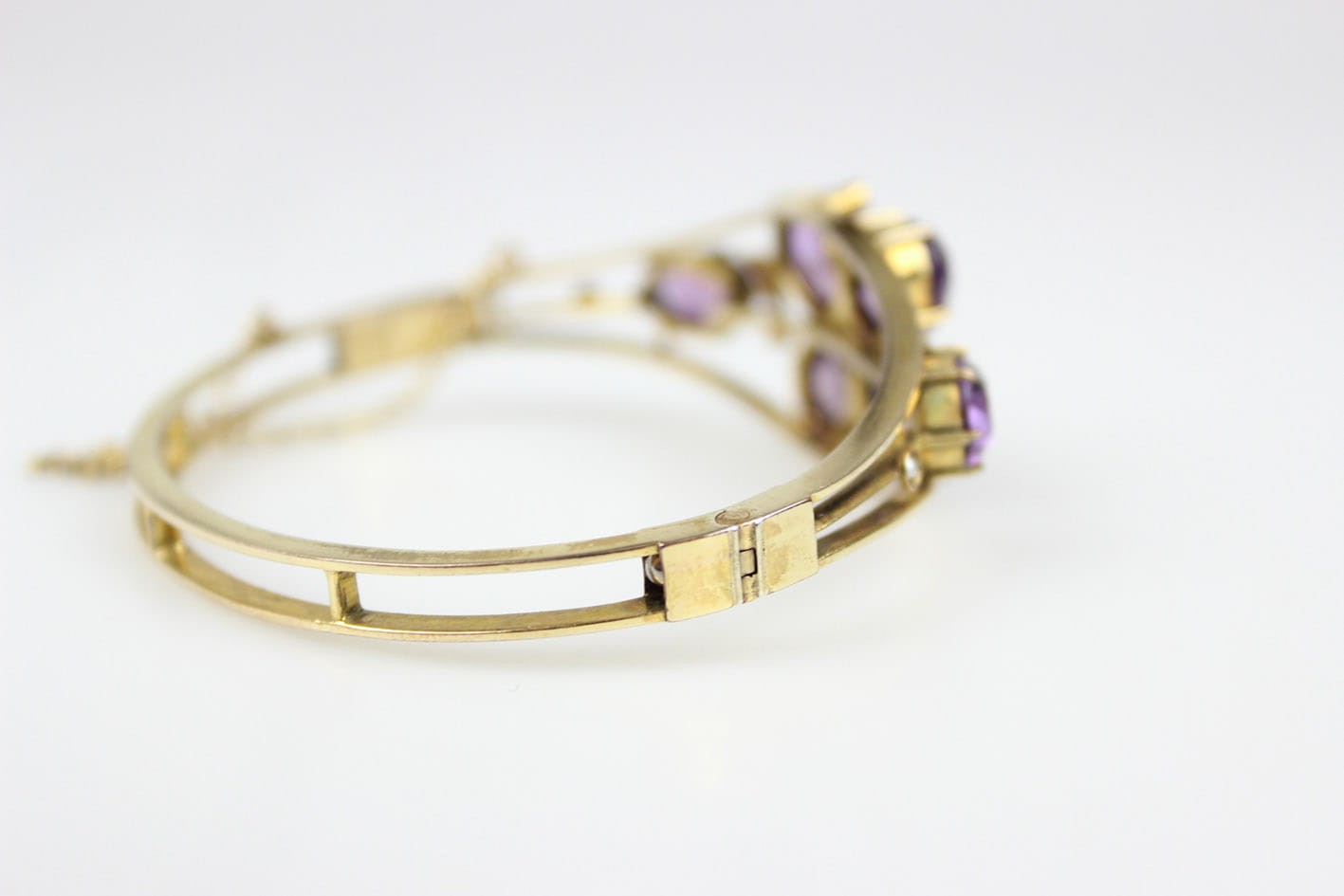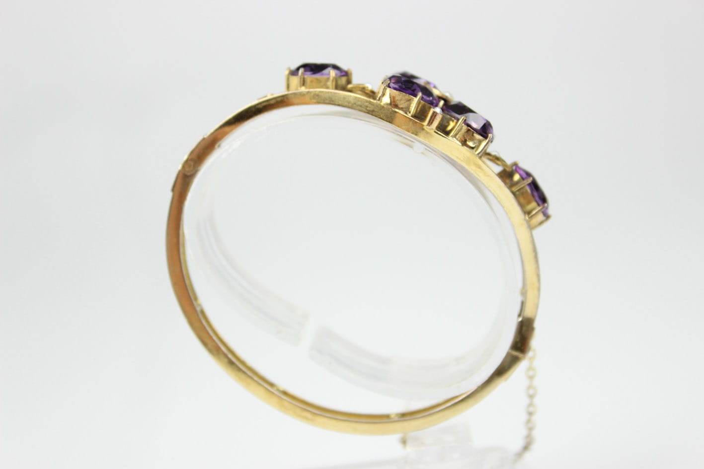 Piękna, ażurowa, wiktoriańska bransoletka pochodząca z przełomu XIX i XX wieku. Dwudzielna obręcz łączona zawiasem i zapinana na zamek szufladkowy z łańcuszkiem zabezpieczającym. Górna półobręcz rozdziela się przytrzymując kompozycję kwiatową wykonaną z naturalnych ametystów i półpereł. Podstawa w złoconym mosiądzu wykonana techniką złocenia double. Bransoletka w bardzo dobrym stanie zachowania w pełnym złoceniu. Wymiary: