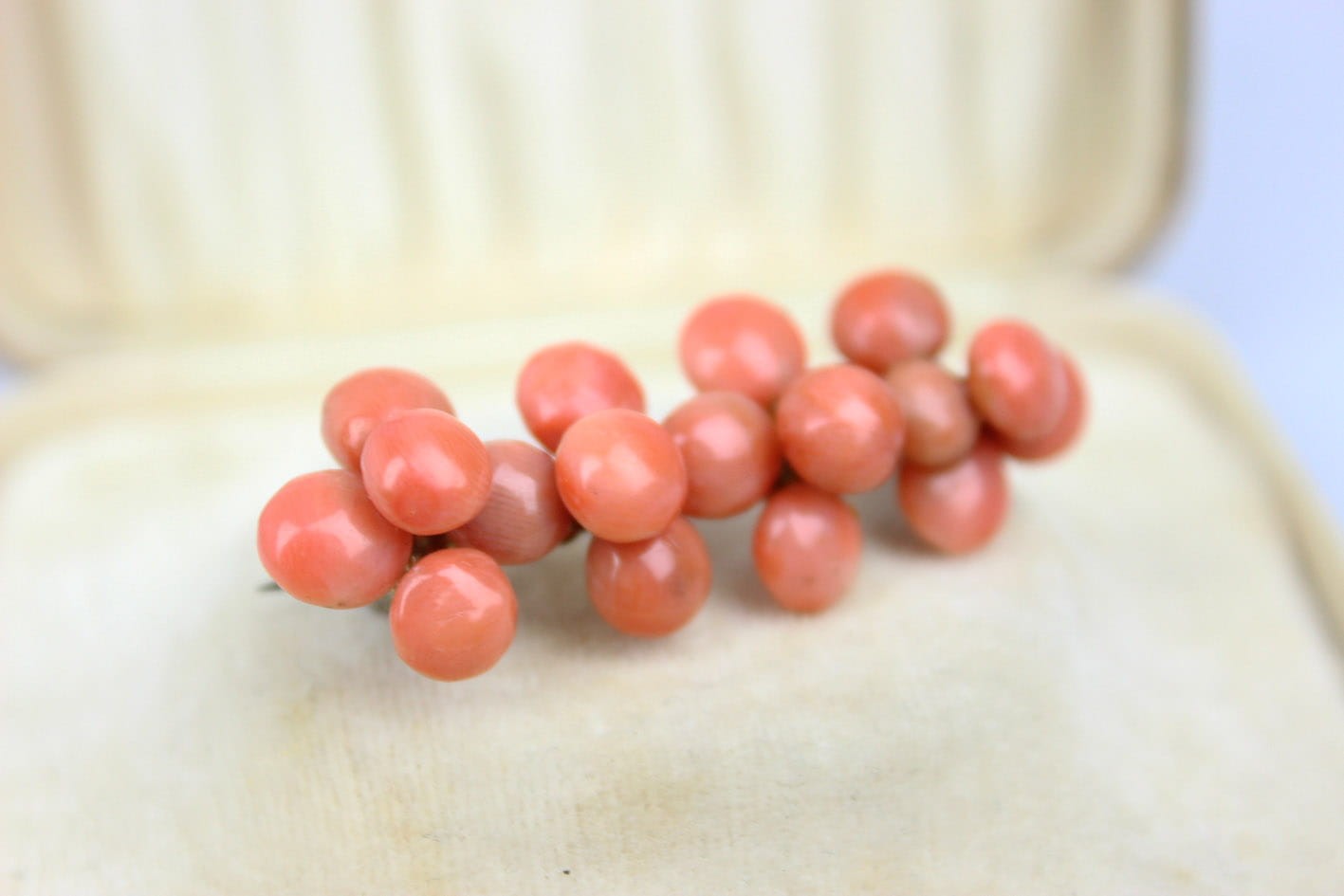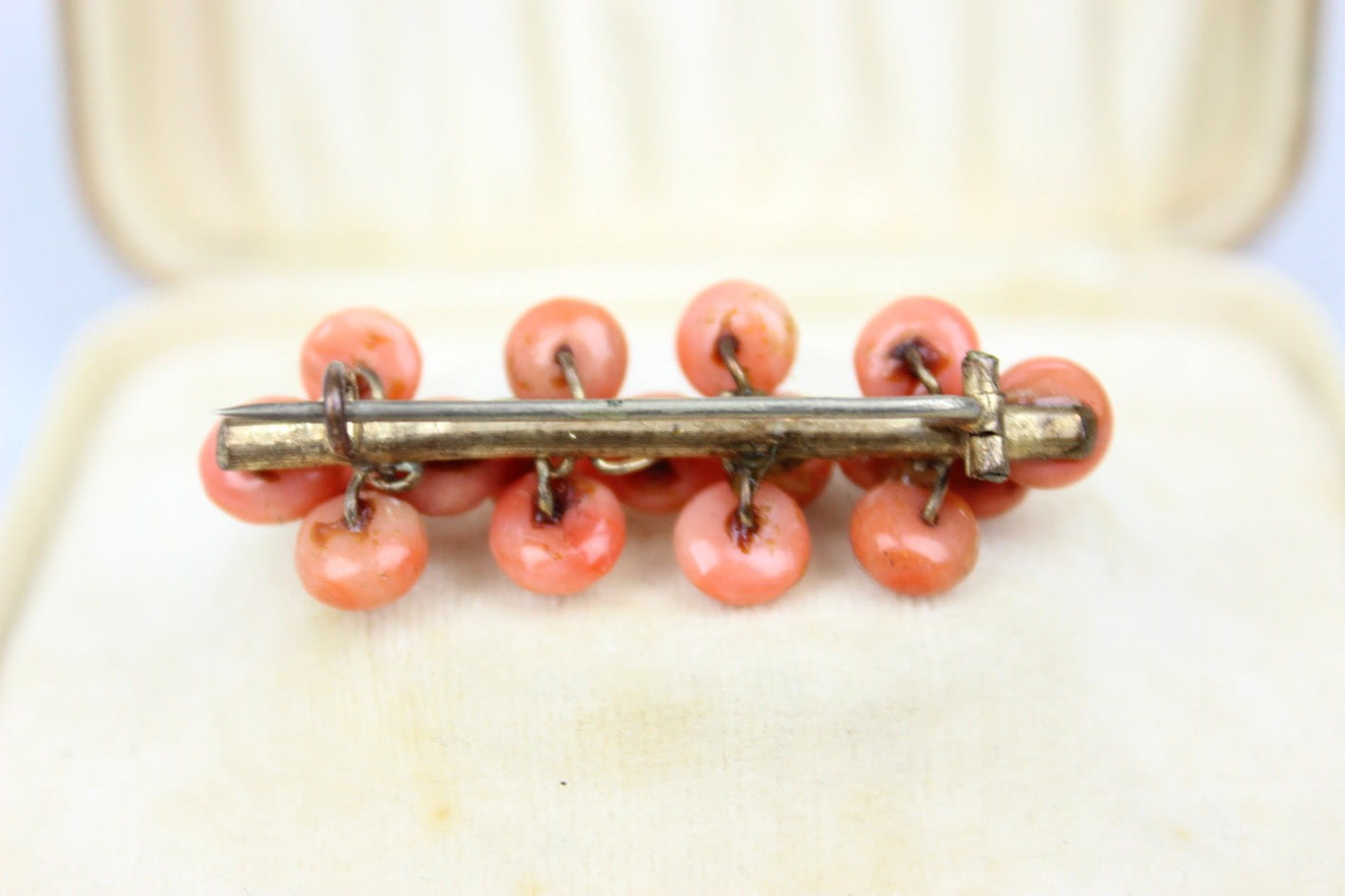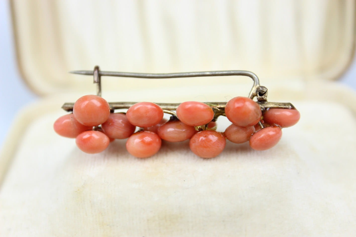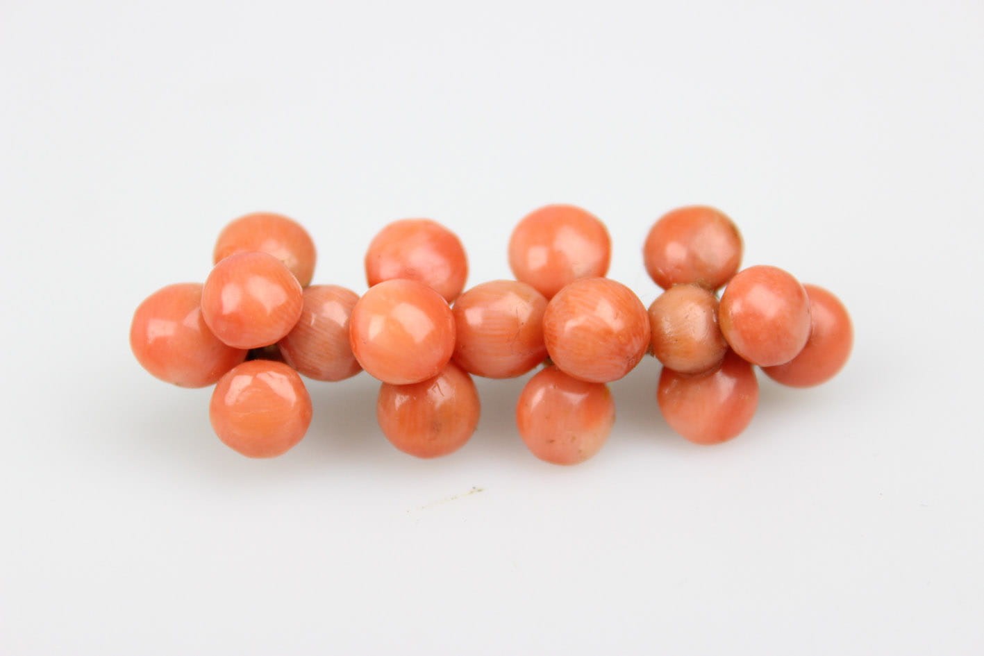 Oryginalna, sporych rozmiarów broszka z 17 pastylkami korala szlachetnego, pochodząca z końca XIX wieku. Konstrukcja w złoconym mosiądzu. Zapięcie typowe typu "C". Stan zachowania bardzo dobry. Wymiary: