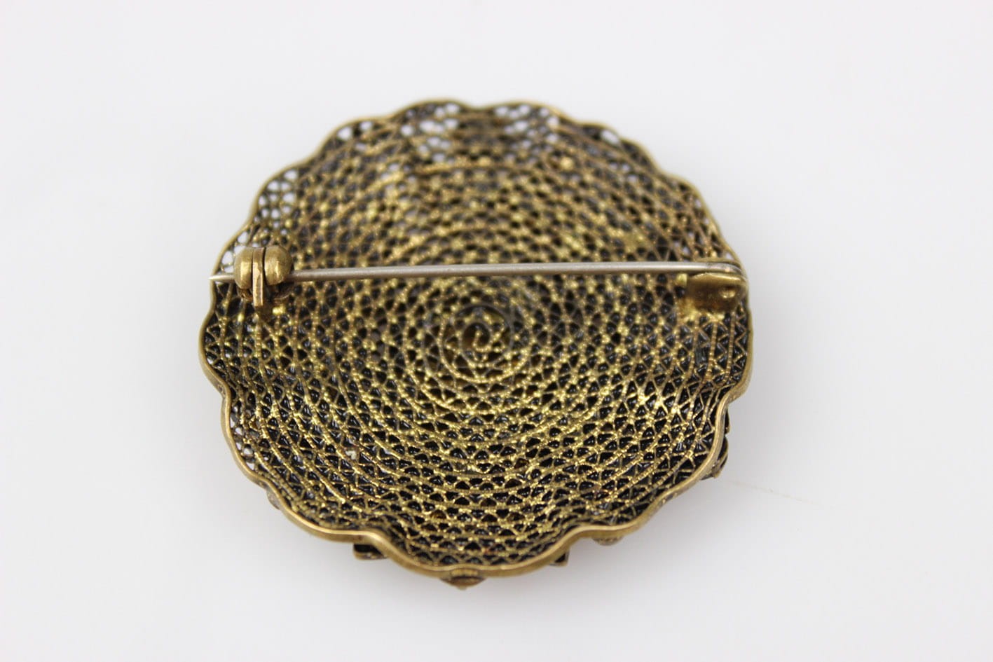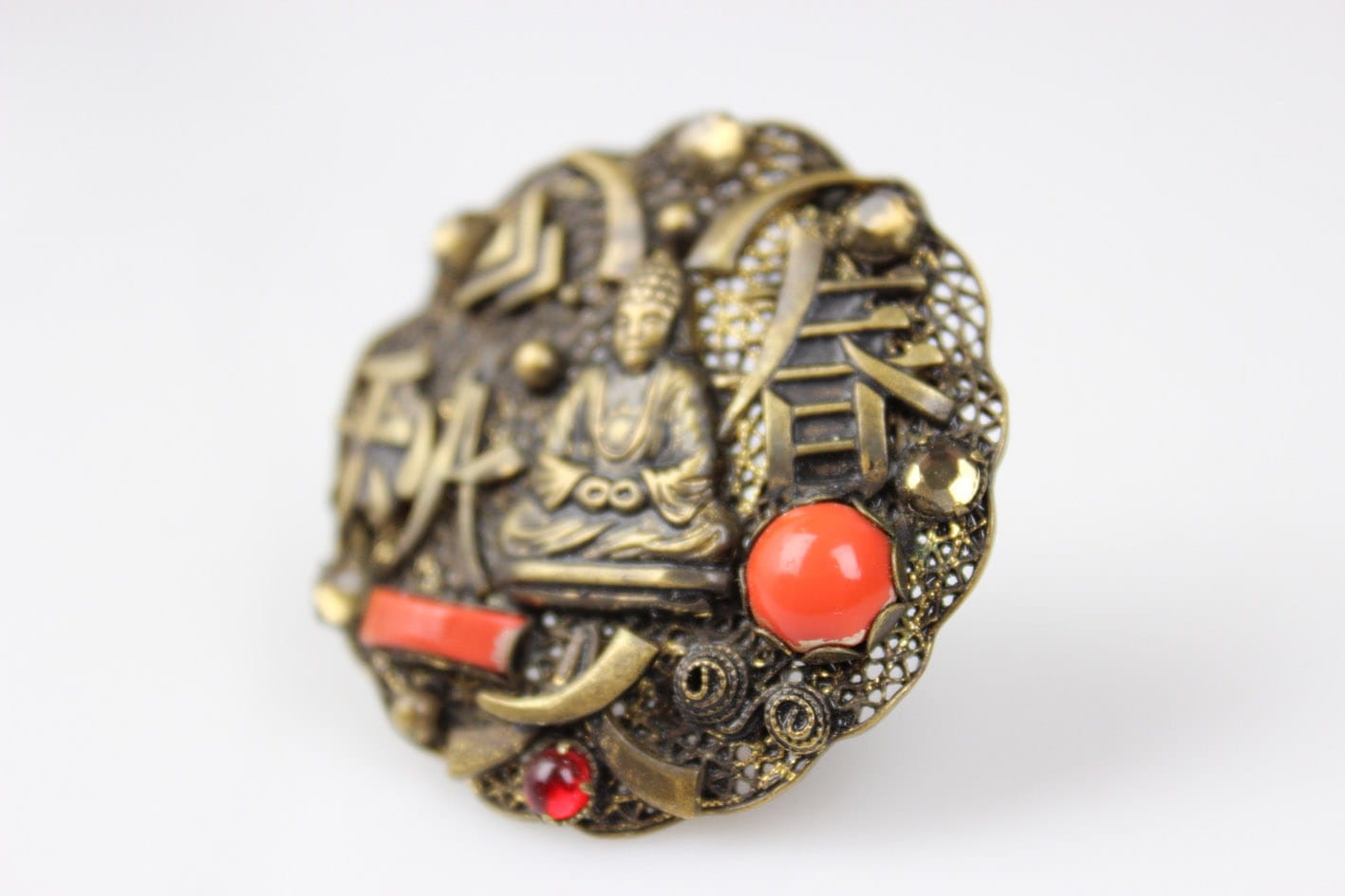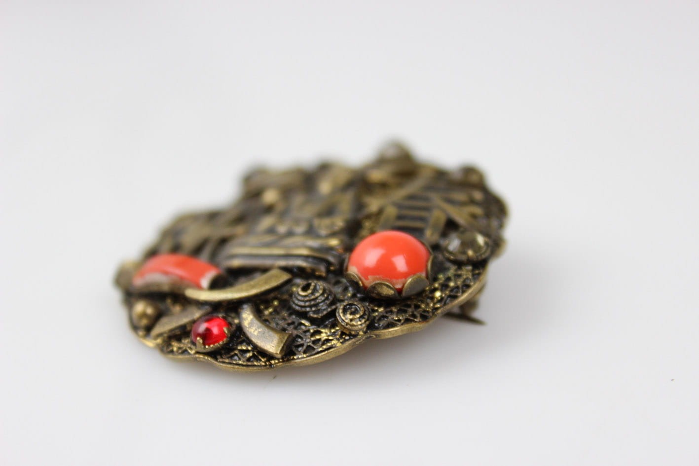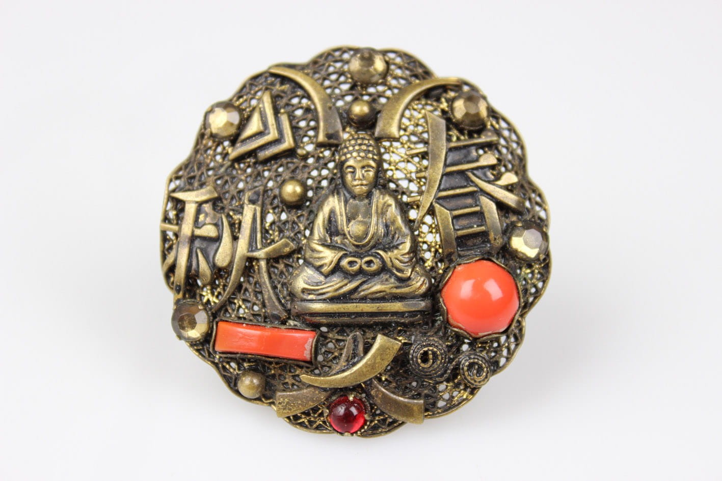 Broszka przedstawiająca Buddę, stworzona przez braci Neiger z Gablonz, to wyjątkowy przykład biżuterii artystycznej. Wykonana w stylu art deco, posiada precyzyjne detale i finezyjne zdobienia, charakterystyczne dla rzemiosła braci Nieger. Przedstawienie Buddy na broszce odzwierciedla inspiracje orientalne, łącząc je z elementami charakterystycznymi dla tego okresu. Wyrób wykonany w złoconym i patynowanym mosiądzu z elementami szklanymi. Stan zachowania bardzo dobry. Wymiary: