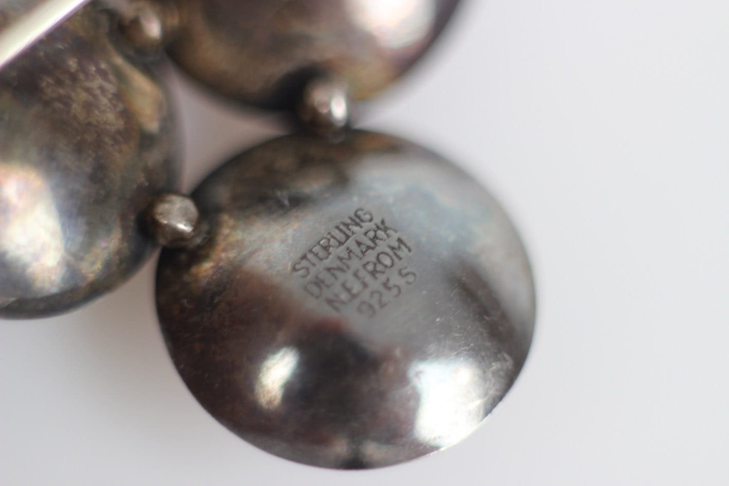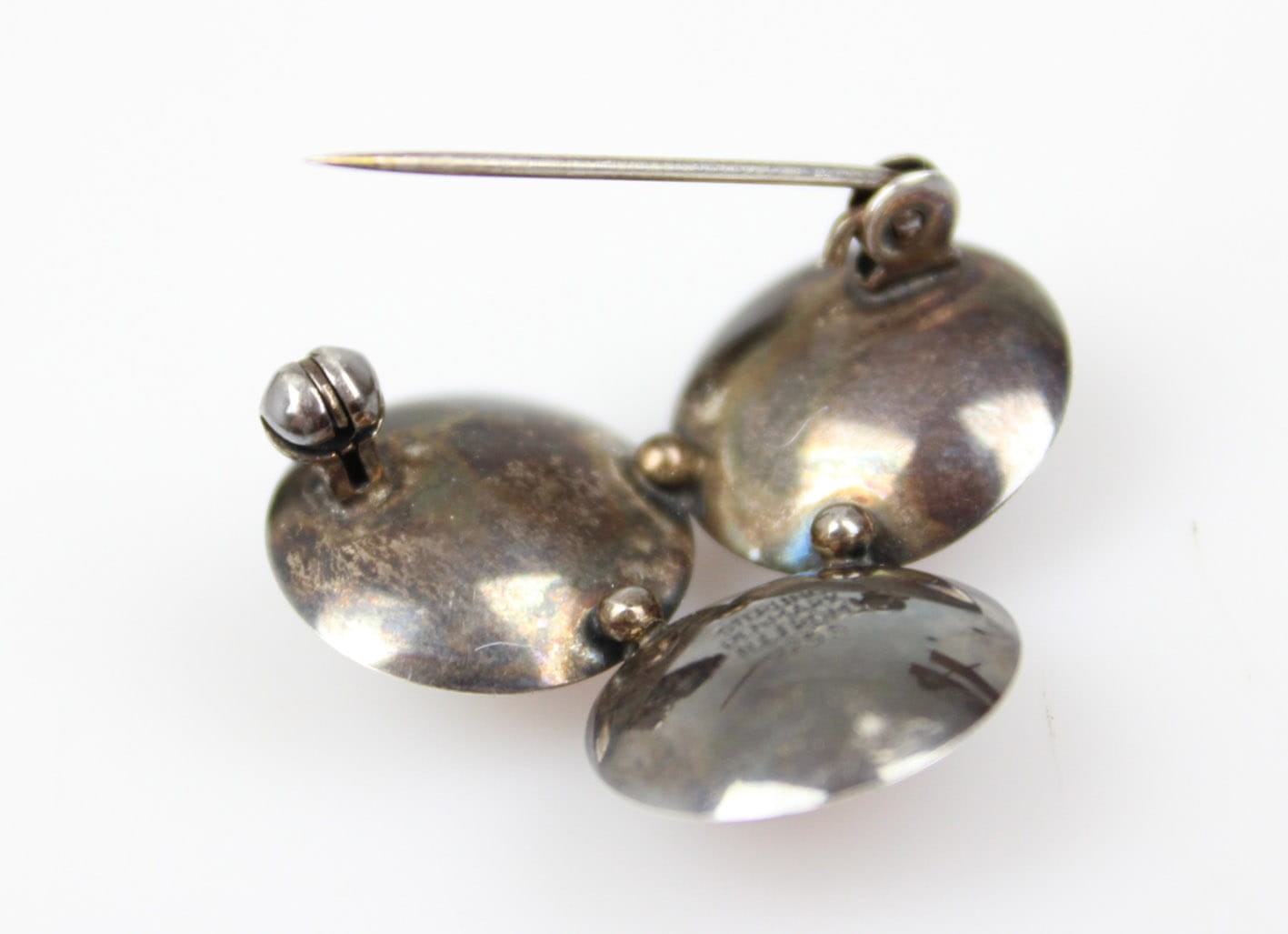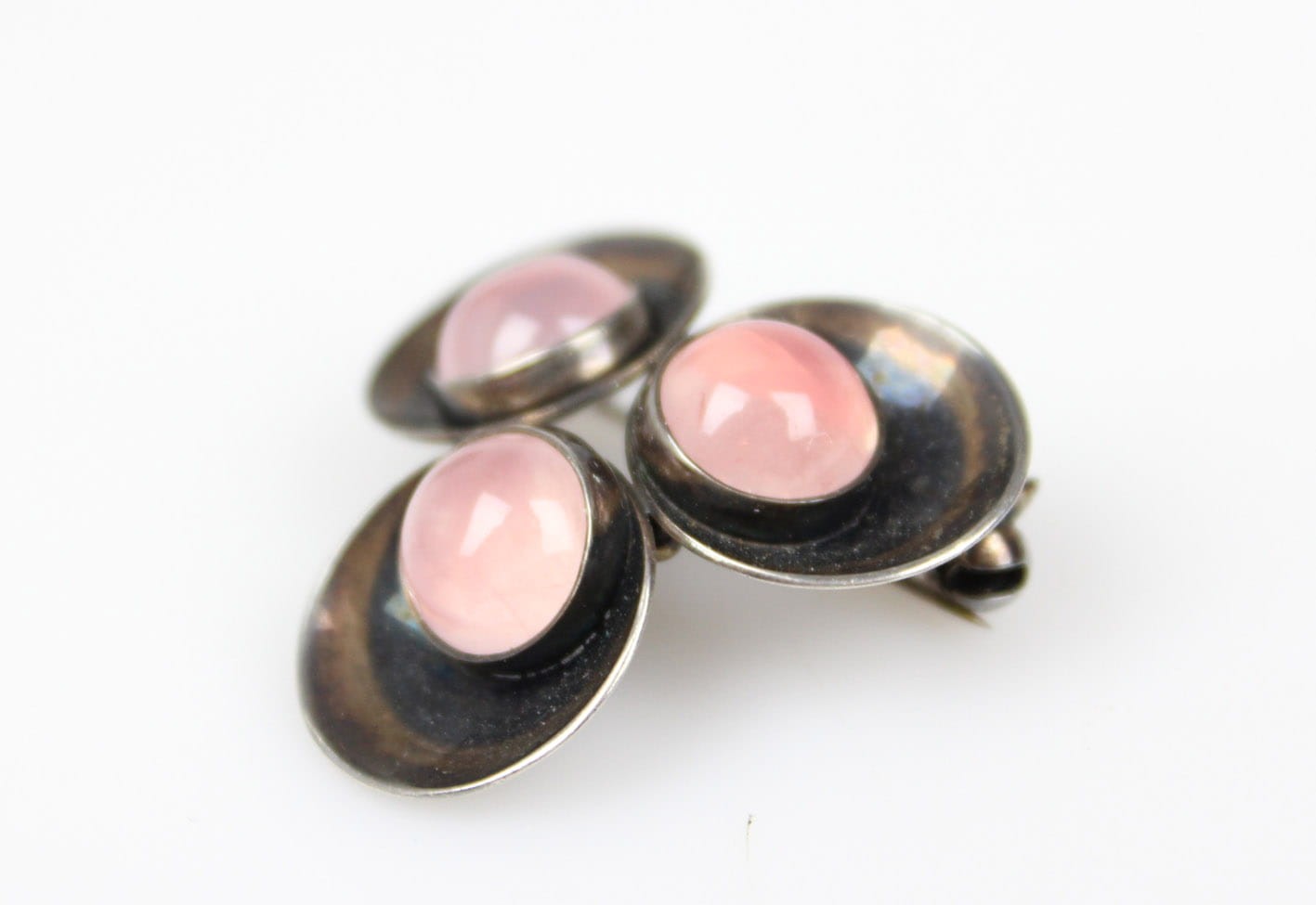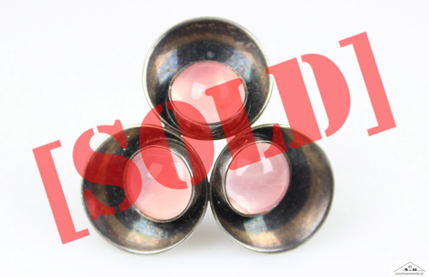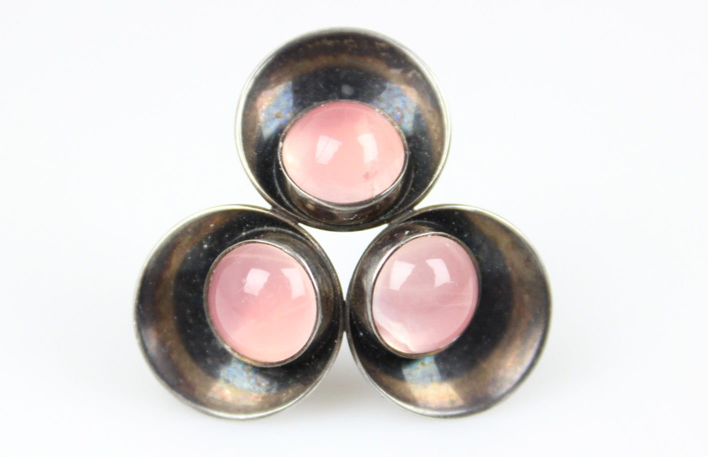 Duńska broszka z lat 60/70 tych XX wieku, pochodząca z wytwórni jubilerskiej Nielsa Erika From. Broszka wykonana w srebrze, sygnowana puncą STERLING DENMARK N.E.FROM 925S. Awers kameryzowany trzema różowymi kwarcami w szlifie kaboszonowym. Wymiary: