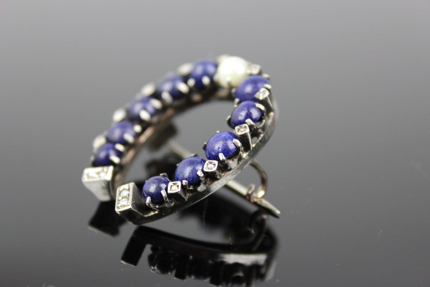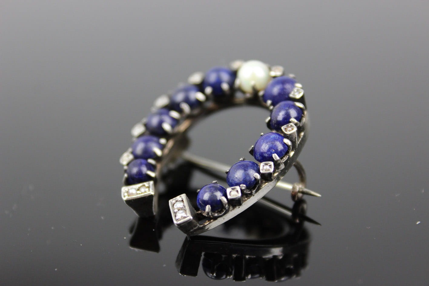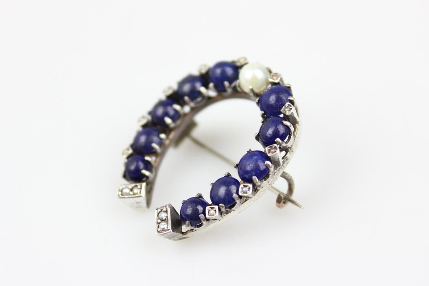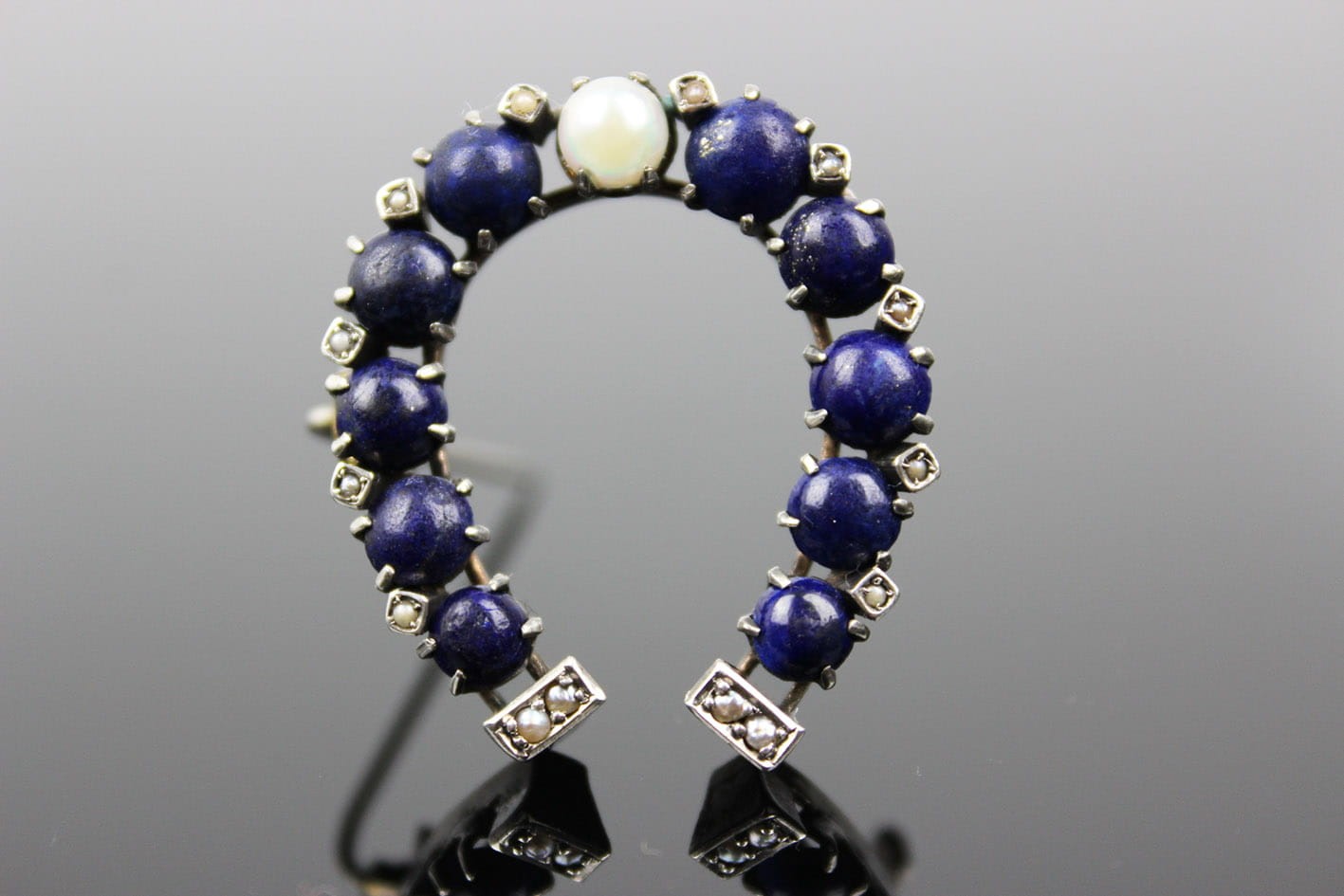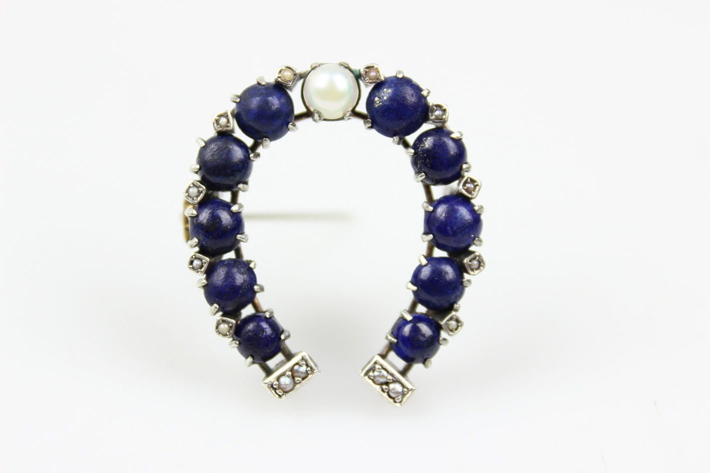 Wyjątkowa broszka w kształcie podkowy, datowana na lata 80. XIX wieku, będąca doskonałym przykładem wyrafinowanego rzemiosła jubilerskiego tamtych czasów. Wykonana ze srebra, zachwyca misterną kompozycją: centralnie osadzona perła pięknie kontrastuje z głębokim, granatowym lapisem, którym wysadzona jest podkowa. Zewnętrzne krawędzie oraz dolna część zdobi rząd maleńkich pereł, dodających broszy subtelnej elegancji i ponadczasowego uroku.