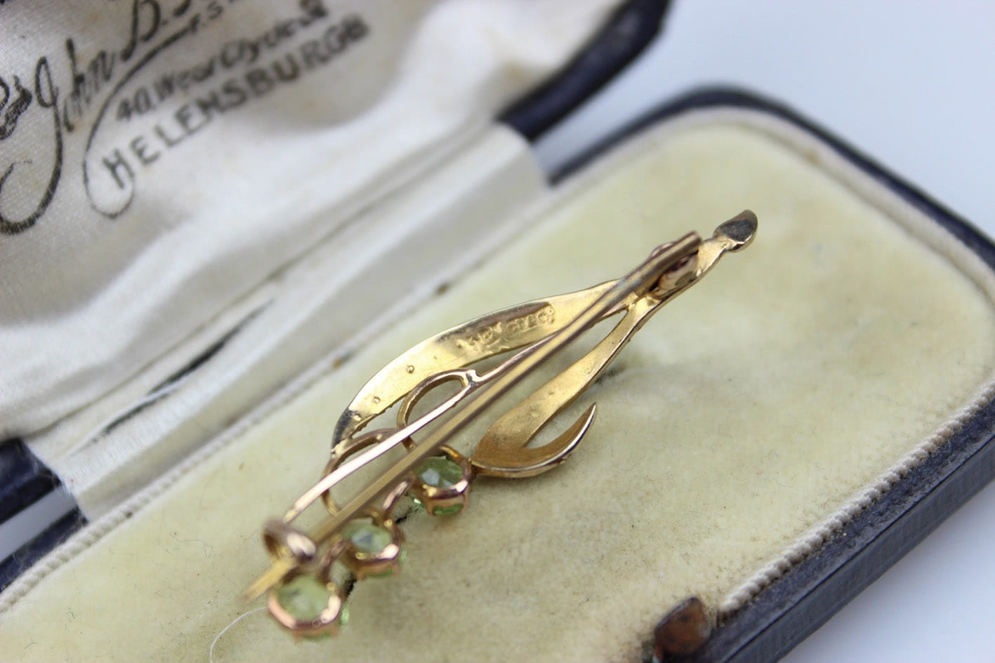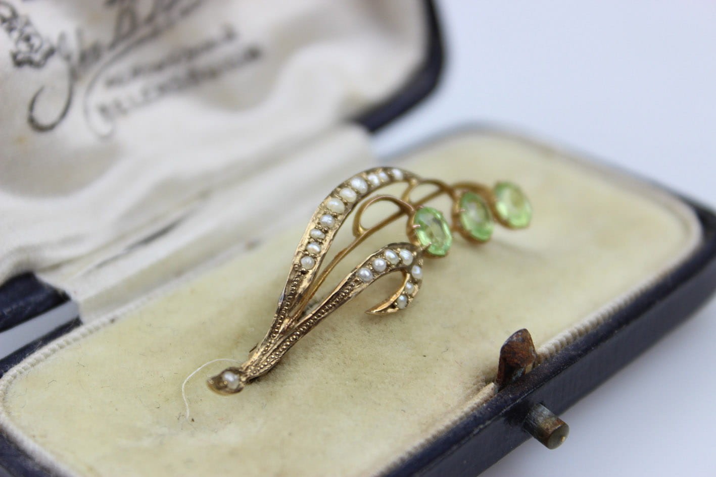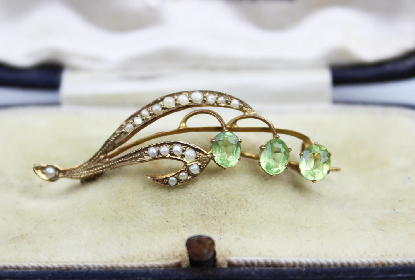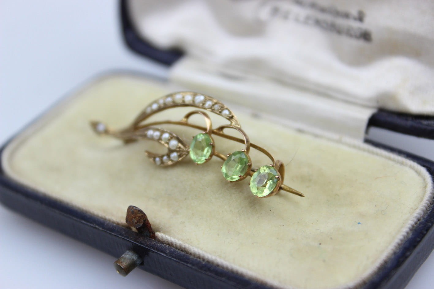 Przepiękna broszka o miękkiej secesyjnej linii w formie gałązki kwiatowej, wykonana na początku XX wieku na terenie Wielkiej Brytanii. Konstrukcja w złocie próby 375 ( 9 karatów). Awers kameryzowany perłami i oliwinami w szlifie fasetowym. Stan zachowania bardzo dobry. Wymiary: