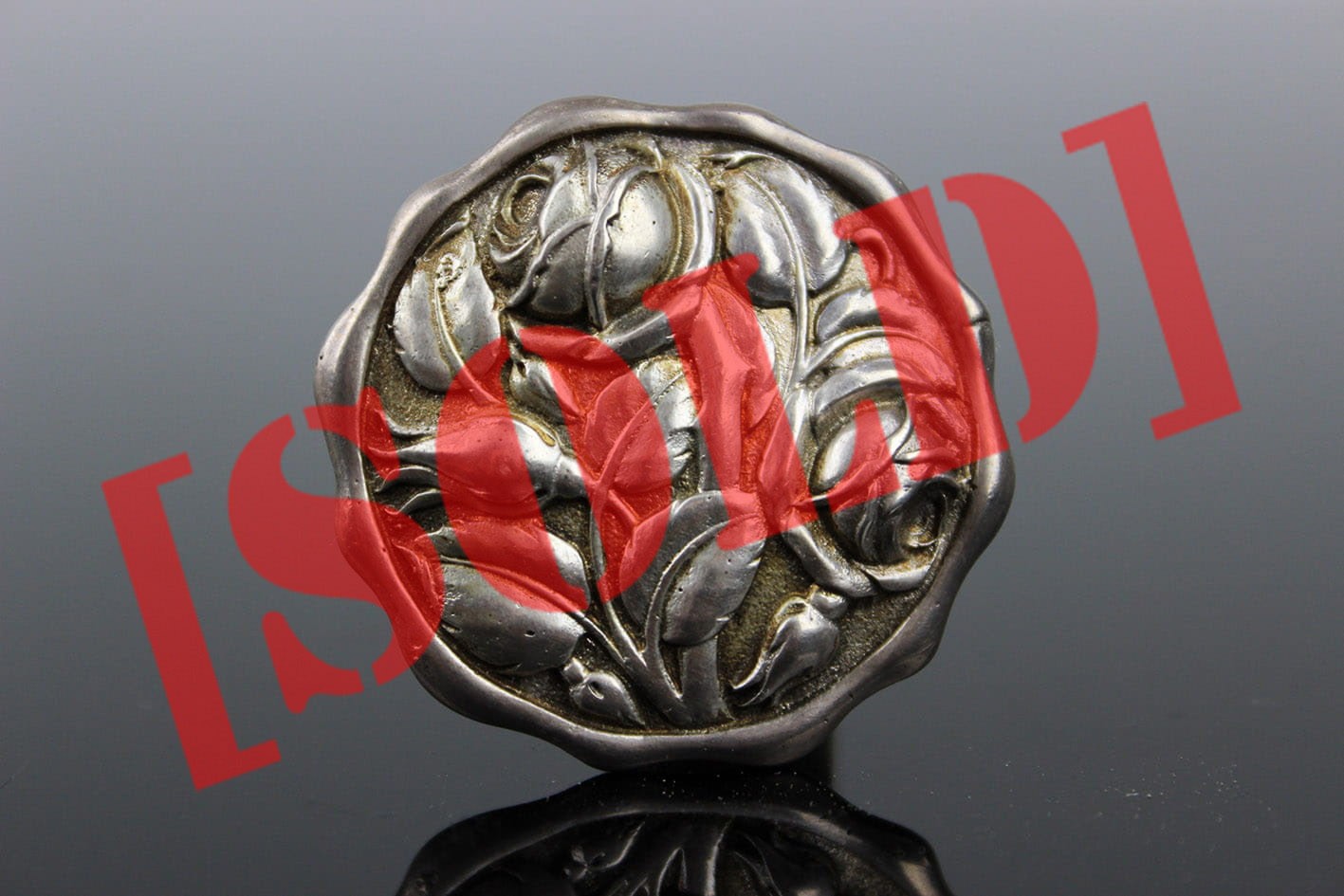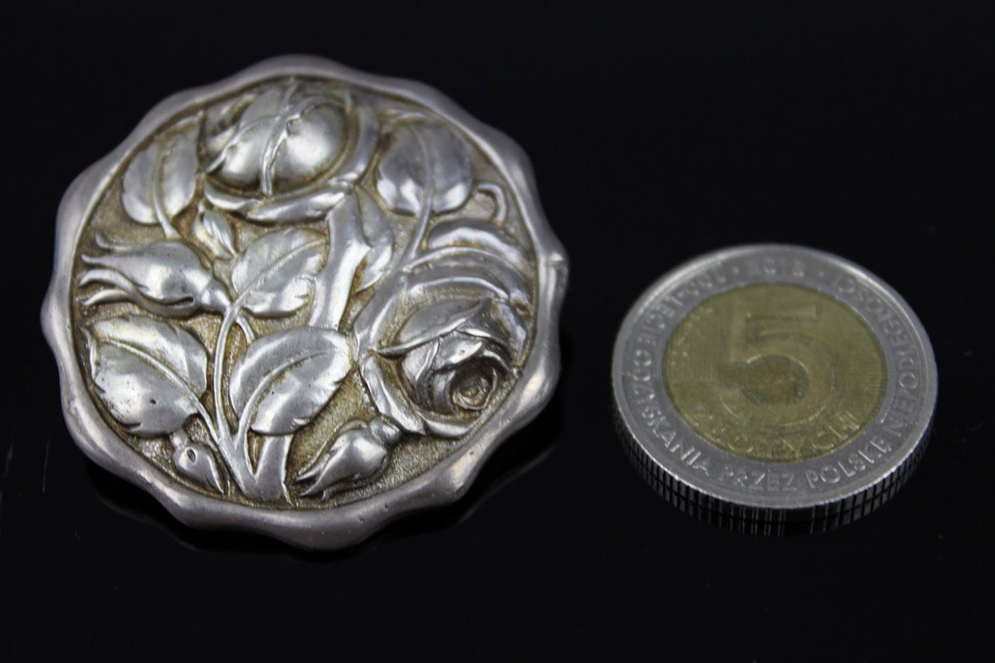 Okazała broszka z początku XX wieku wykonana z zakładzie jubilerskim znanego niemieckiego złotnika Martina Mayer z Mainz. Wyrób wykonany w srebrze próby 800, awers zdobiony bukietem róż. Rewers sygnowany sygnaturą artysty. Szpila stalowa. Całość w oryginalnym stanie zachowania z delikatną wiekową patynką. Wymiary: