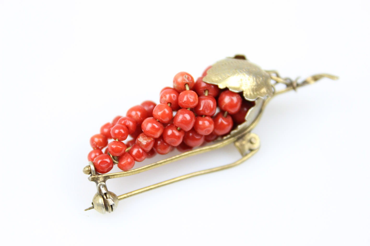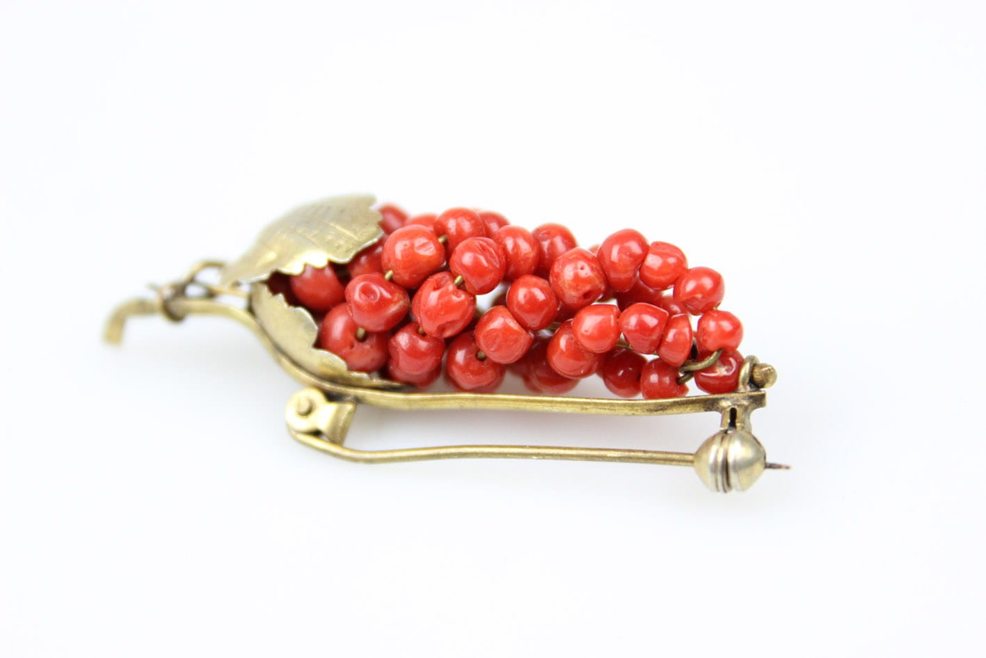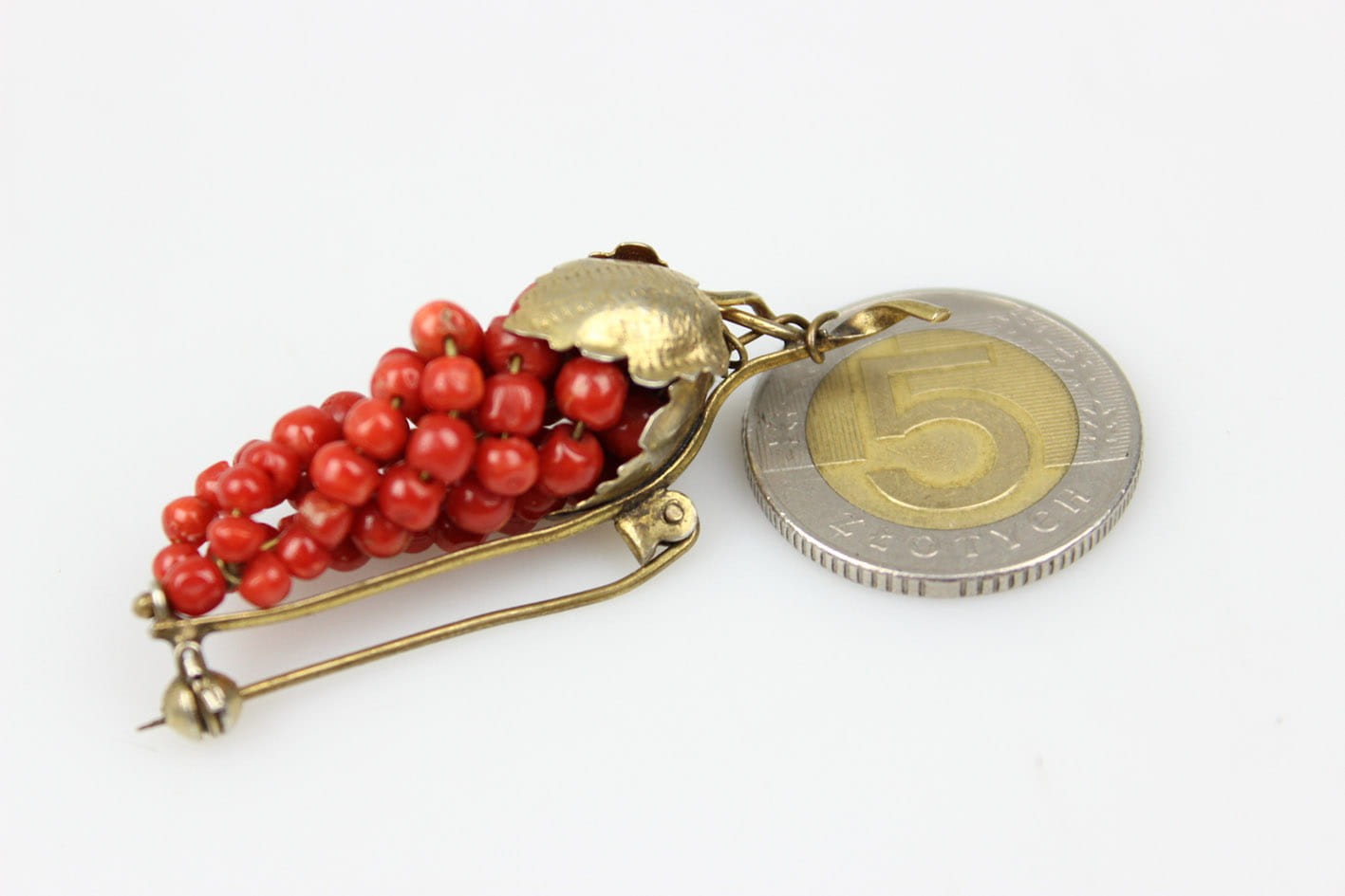 Przeurocza, okazała włoska broszka wykonana w latach 30/40-tych XX wieku. Wyrób w formie kiści winogron. Podstawa i listki wykonane w grawerowanym, złoconym tombaku ozdobione koralem szlachetnym o mocno czerwonej barwie. Stan zachowania bardzo dobry. Wymiary: