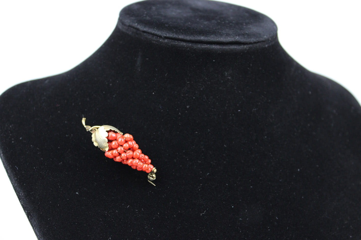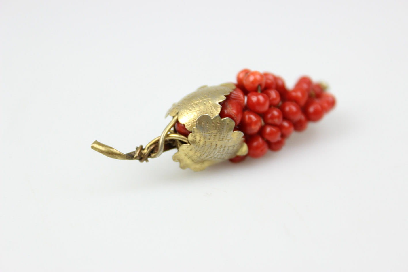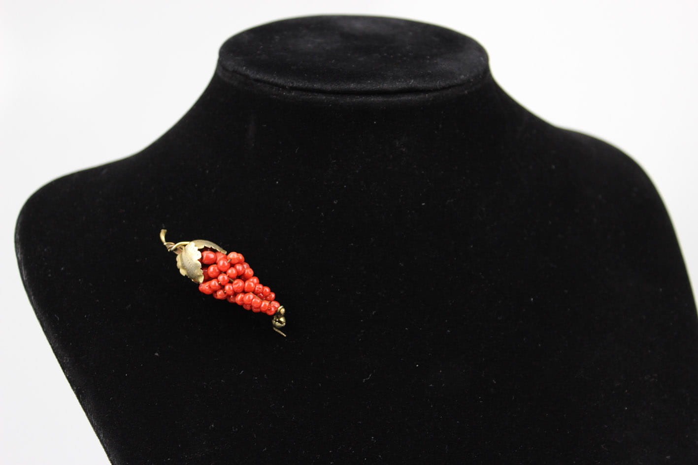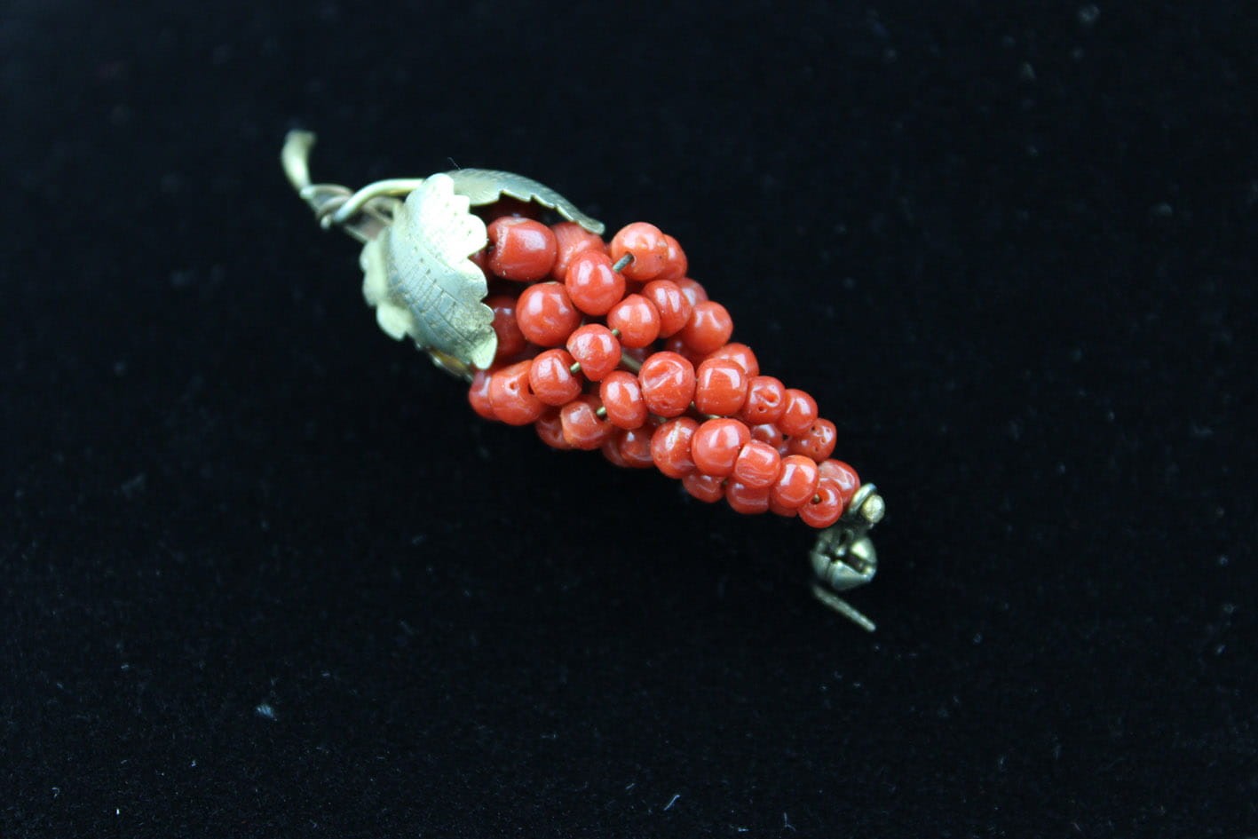 Przeurocza, okazała włoska broszka wykonana w latach 30/40-tych XX wieku. Wyrób w formie kiści winogron. Podstawa i listki wykonane w grawerowanym, złoconym tombaku ozdobione koralem szlachetnym o mocno czerwonej barwie. Stan zachowania bardzo dobry. Wymiary: