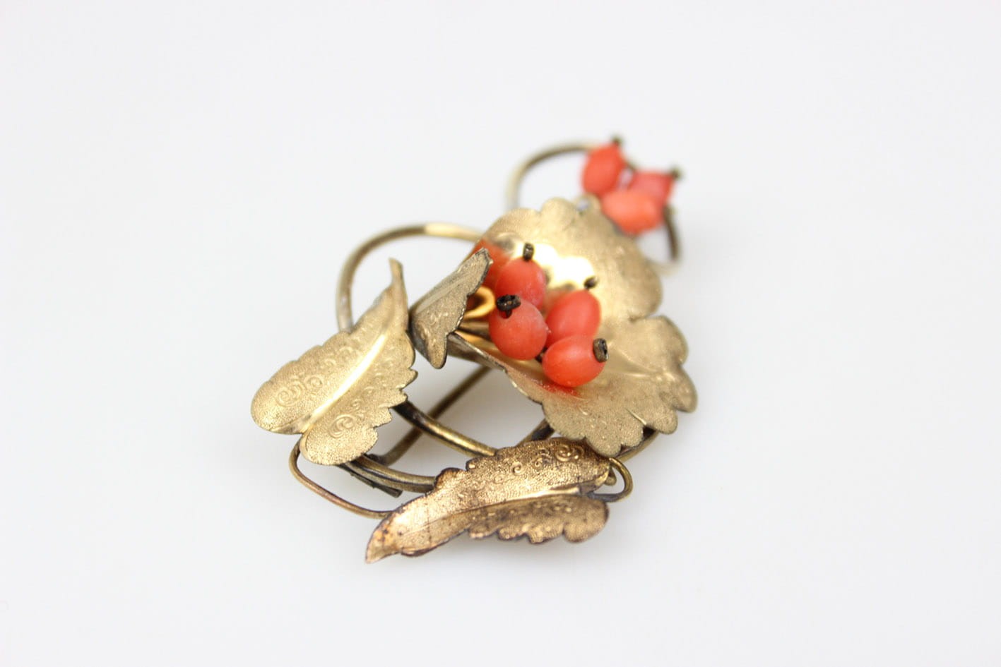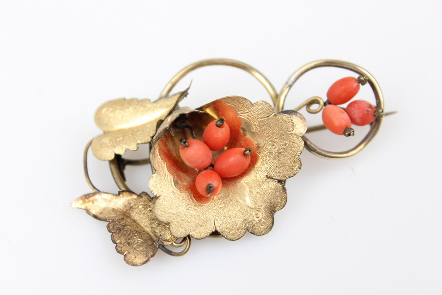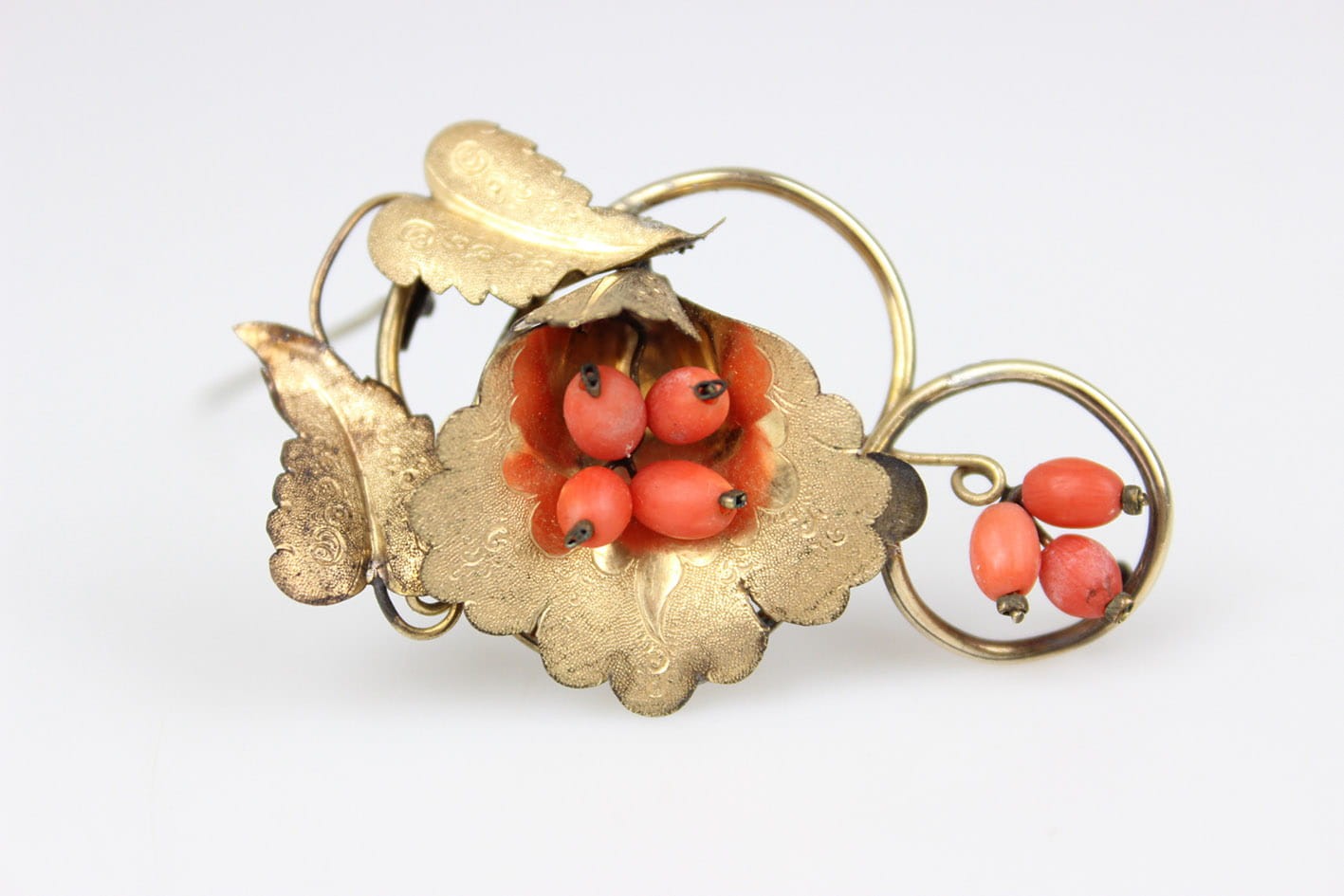 Urocza broszka z końca XIX wieku. Kwiatowa kompozycja zdobiona grawerem i kameryzowana koralem szlachetnym w formie oliwek. Całość wykonana w mosiądzu złoconym w technice double. Rewers lutowany cyną. Zapięcie typu "C" Wymiary: