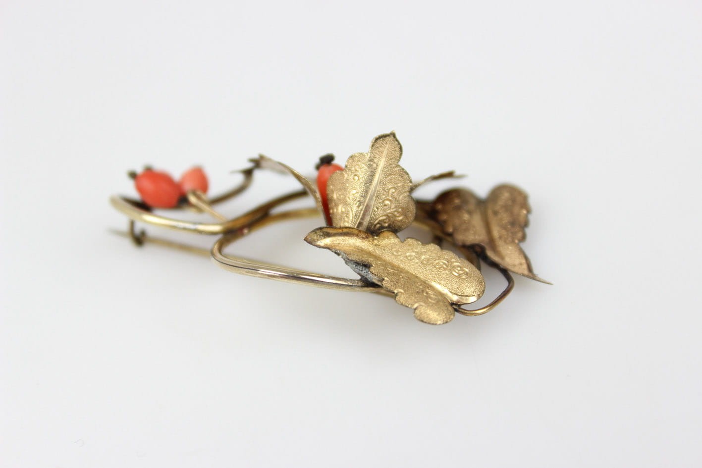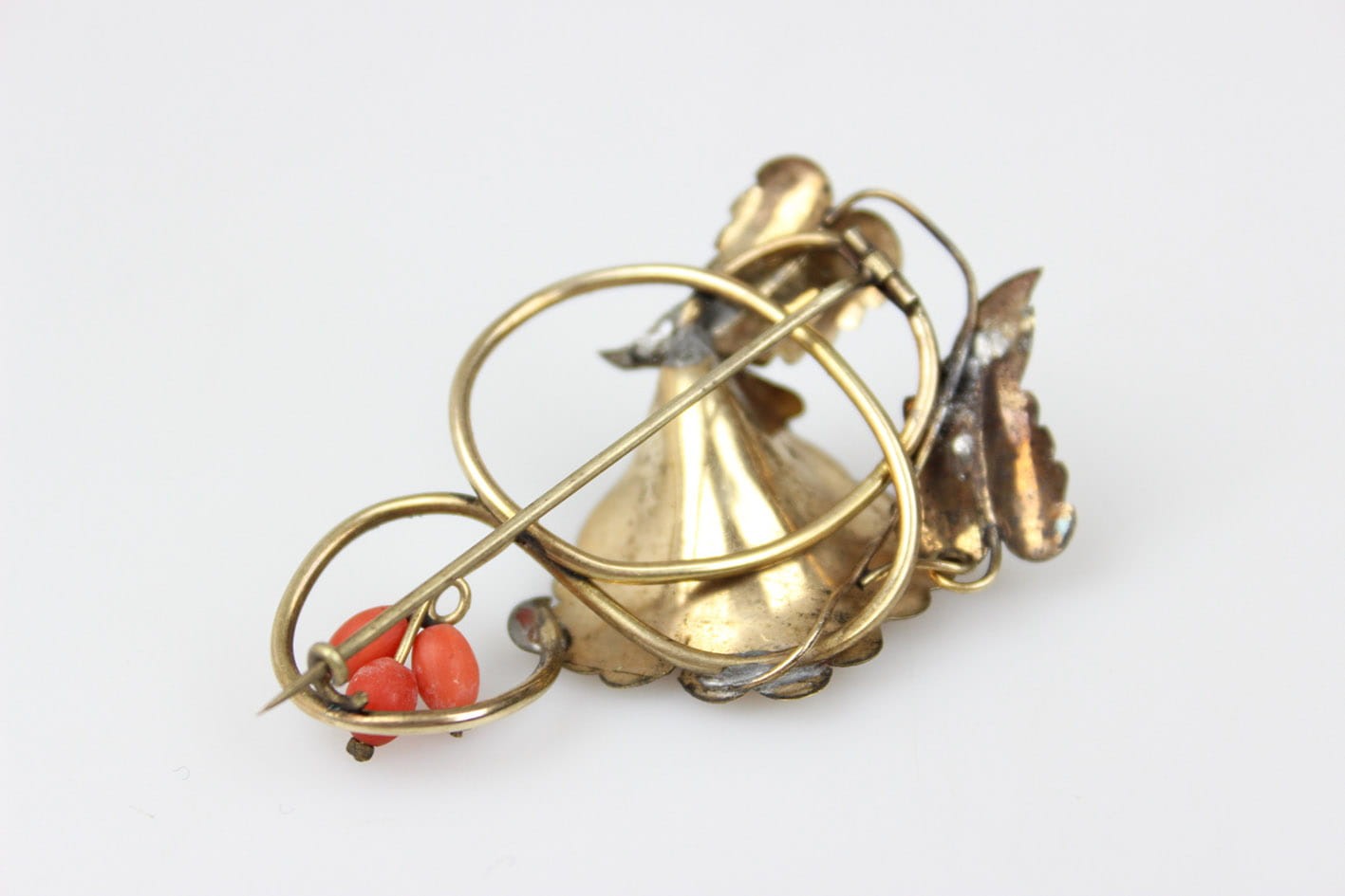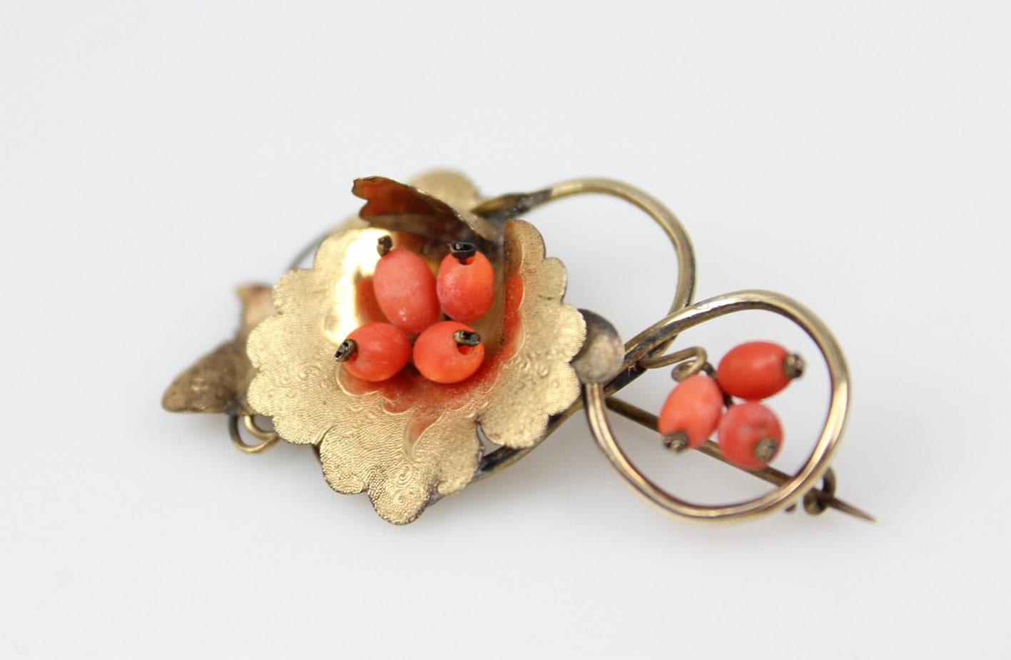 Urocza broszka z końca XIX wieku. Kwiatowa kompozycja zdobiona grawerem i kameryzowana koralem szlachetnym w formie oliwek. Całość wykonana w mosiądzu złoconym w technice double. Rewers lutowany cyną. Zapięcie typu "C" Wymiary: