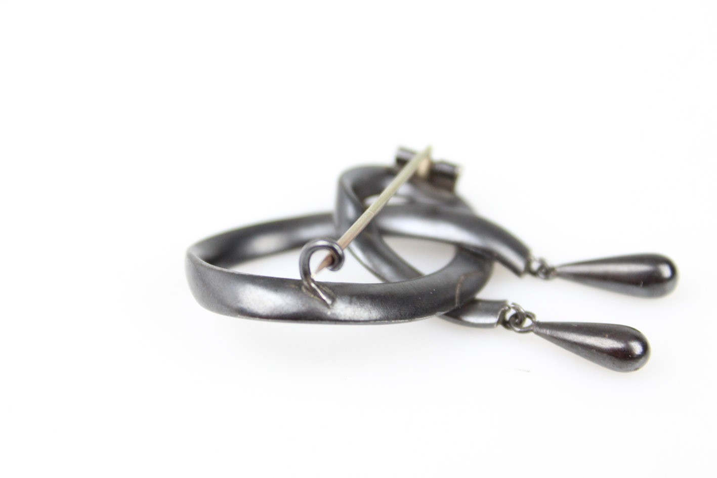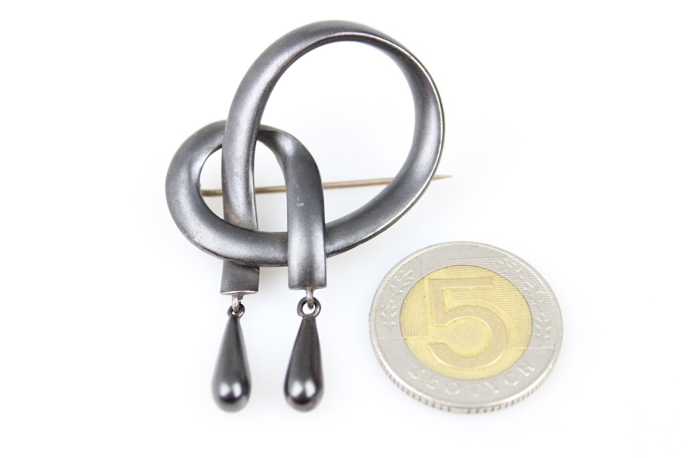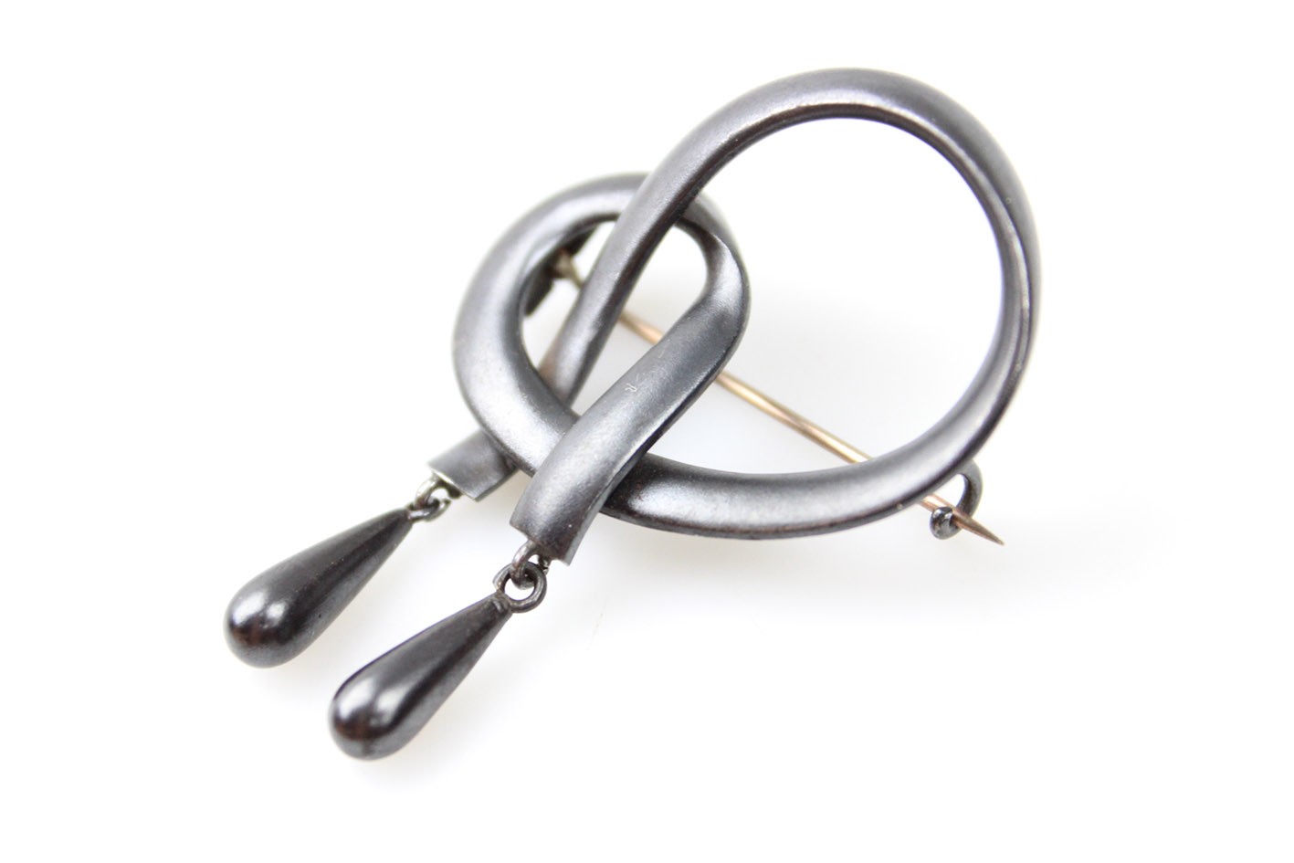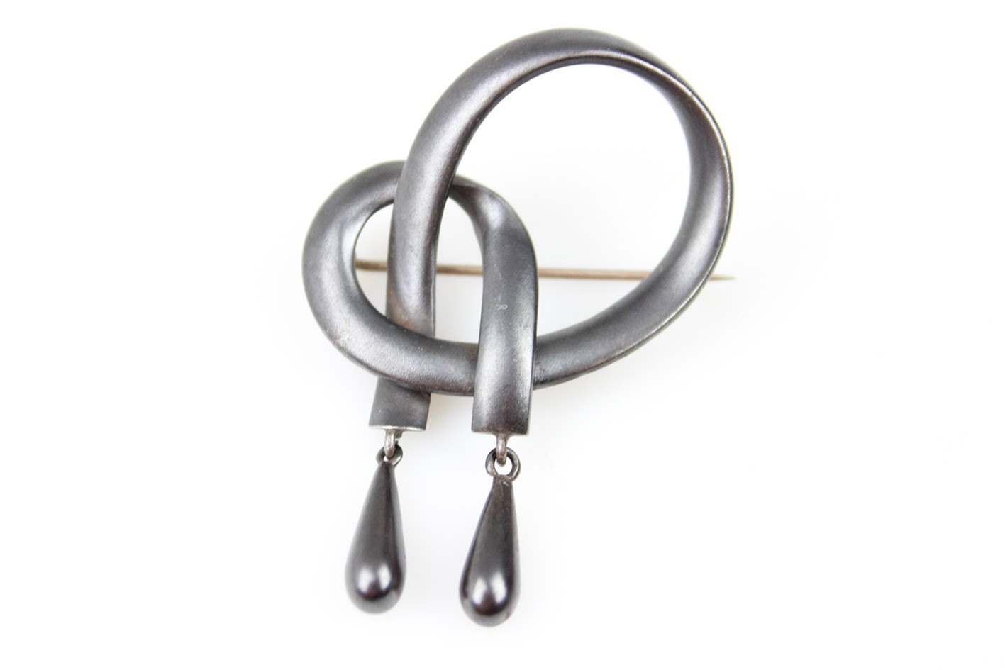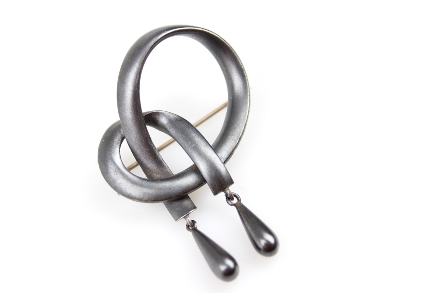 Wyjątkowa brosza powstała w środowisku europejskiej secesji, datowana na lata ok. 1910–1918 w okresie nasilonej produkcji biżuterii z czernionego metalu, związanej zarówno z modą jak i z realiami I wojny światowej. Forma broszy to czysty modernizm secesyjny: abstrakcyjny, rzeźbiarski węzeł, z którego opadają dwie masywne, metalowe łzy. Materiał to ciemny metal znany też pod nazwą gunmetal / oksydowane żelazo, o głębokim grafitowym połysku. Tego rodzaju biżuteria była szczególnie popularna w czasie I wojny światowej — noszona zarówno jako element mody żałobnej i poważnej, jak i jako „tańszy” odpowiednik wyrobów szlachetnych w okresie ograniczeń i reglamentacji metali szlachetnych. Świetnie zachowane, ruchome, zwisające krople nadają broszy dynamiki i charakteru, a masywność formy sprawia, że przedmiot pięknie prezentuje się na tle czerni, wełny, sukna i współczesnych minimalistycznych stylizacji. Wymiary: