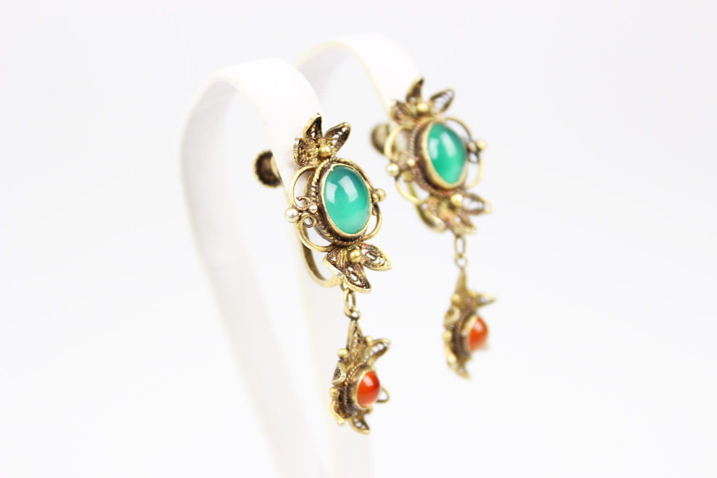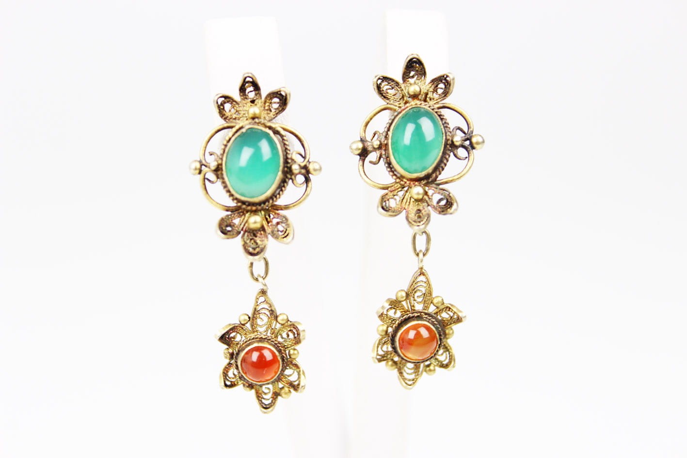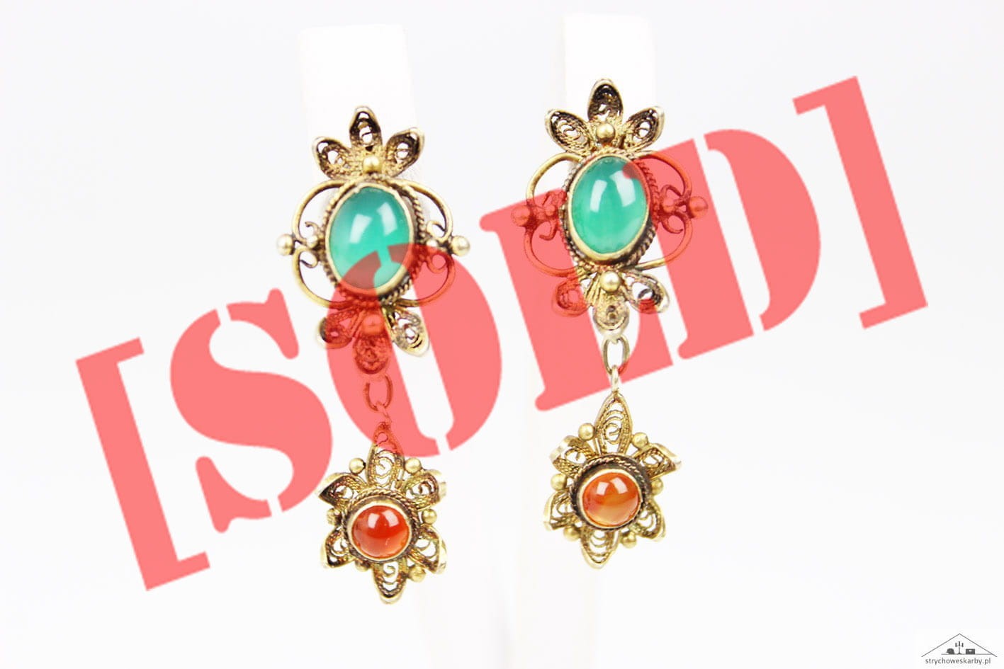Urocze stare chińskie kolczyki z lat 50/60 tych XX wieku. Cześć ozdobna wykonana techniką filigranu i zdobiona chryzoprazem oraz karneolem w szlifie kaboszonowym. Zapięcie " na śrubkę". Całość w bardzo dobrym stanie zachowania. Wymiary: