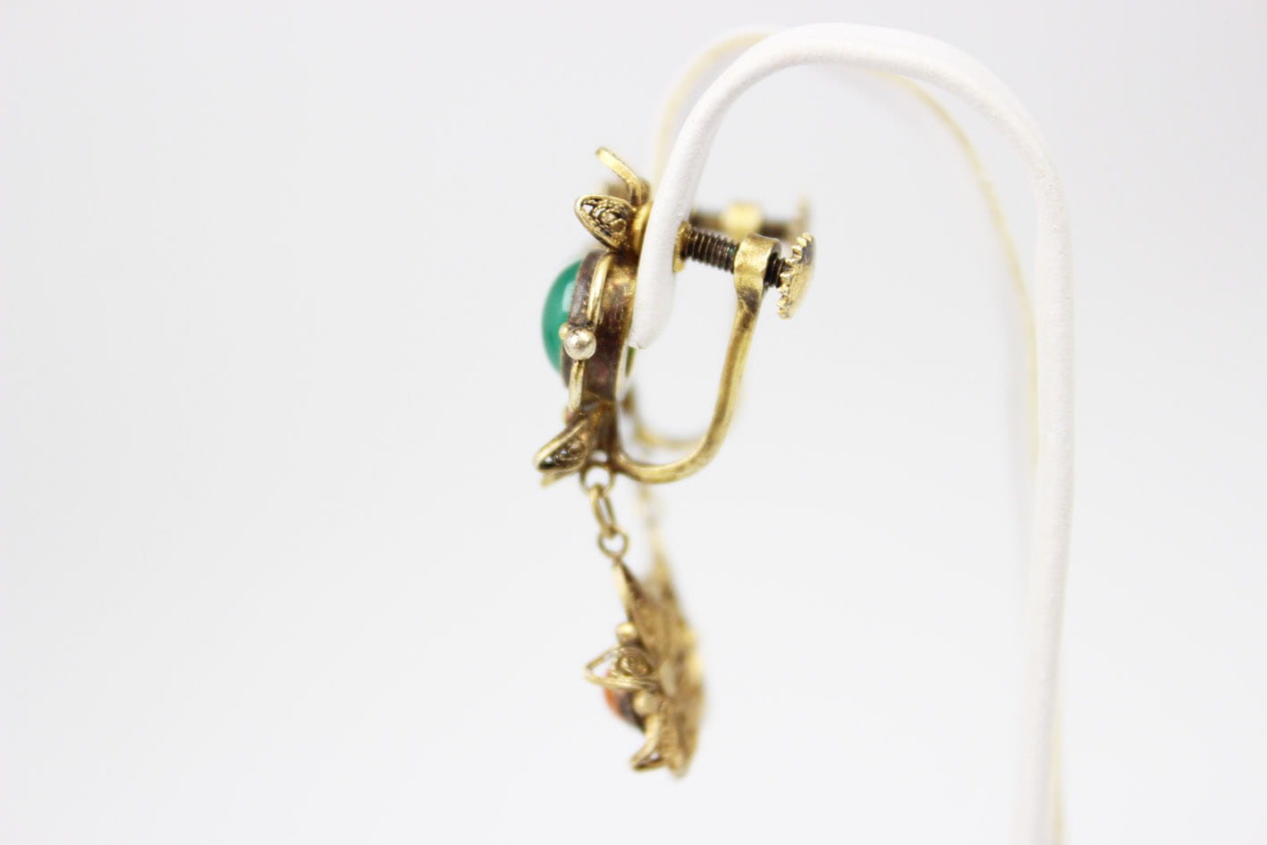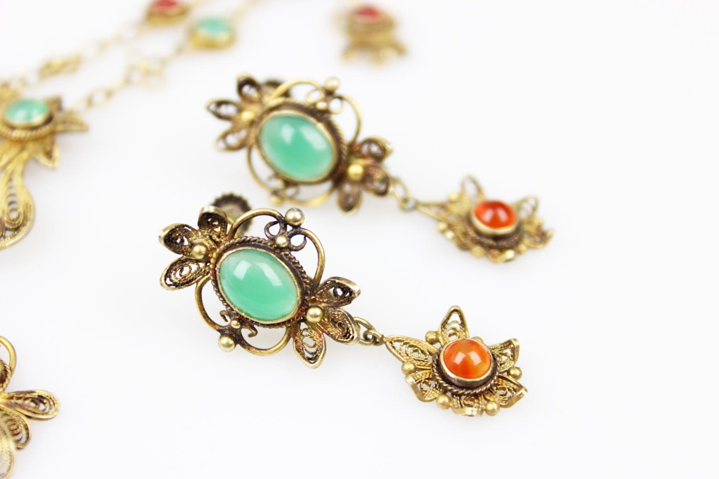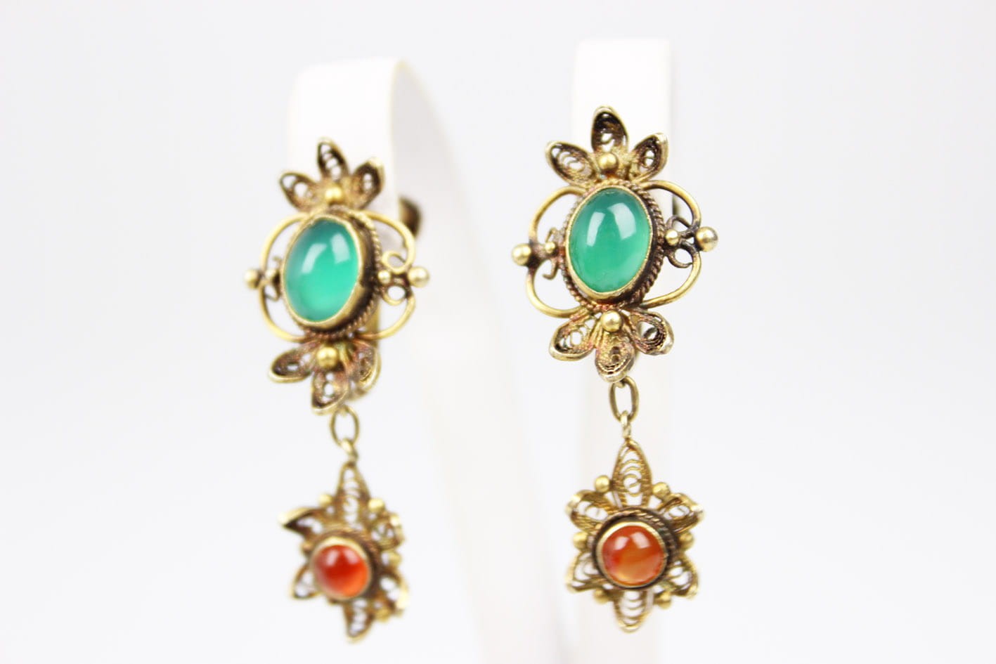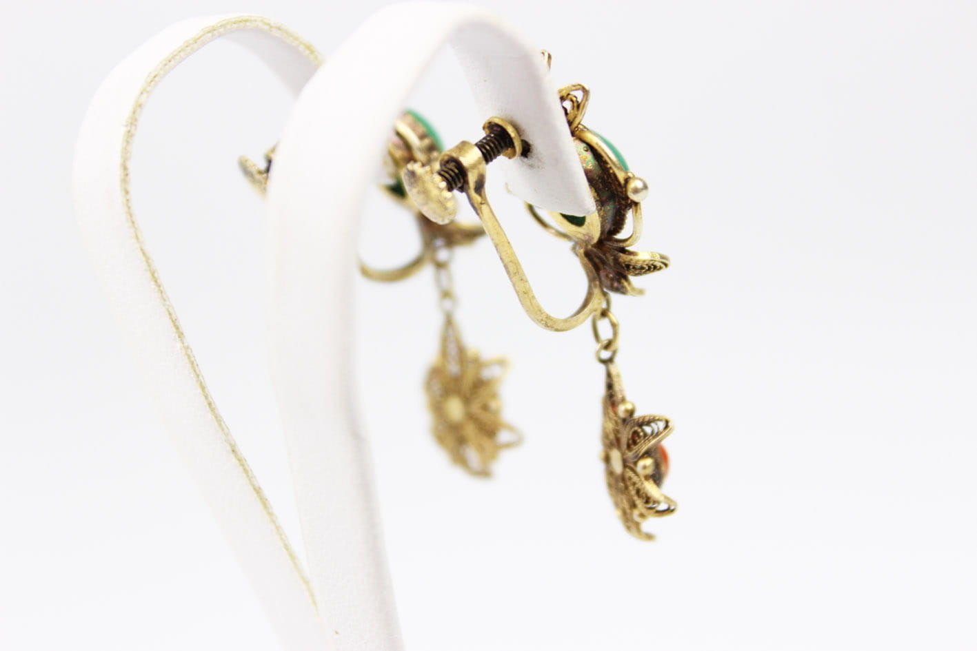 Urocze stare chińskie kolczyki z lat 50/60 tych XX wieku. Cześć ozdobna wykonana techniką filigranu i zdobiona chryzoprazem oraz karneolem w szlifie kaboszonowym. Zapięcie " na śrubkę". Całość w bardzo dobrym stanie zachowania. Wymiary: