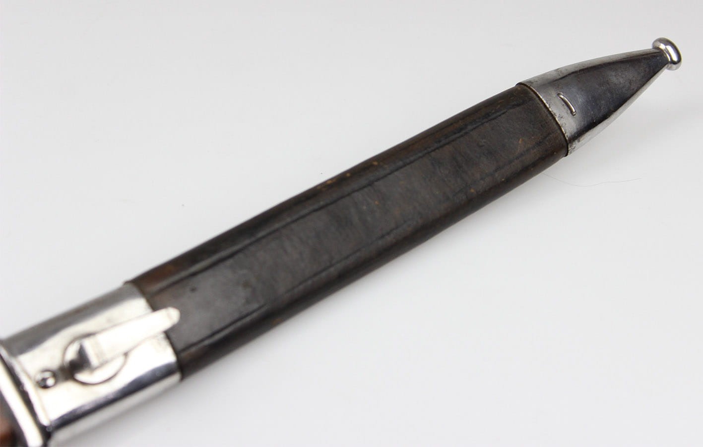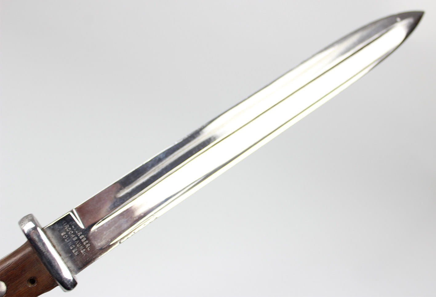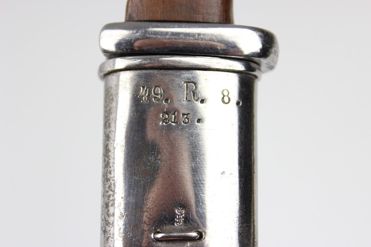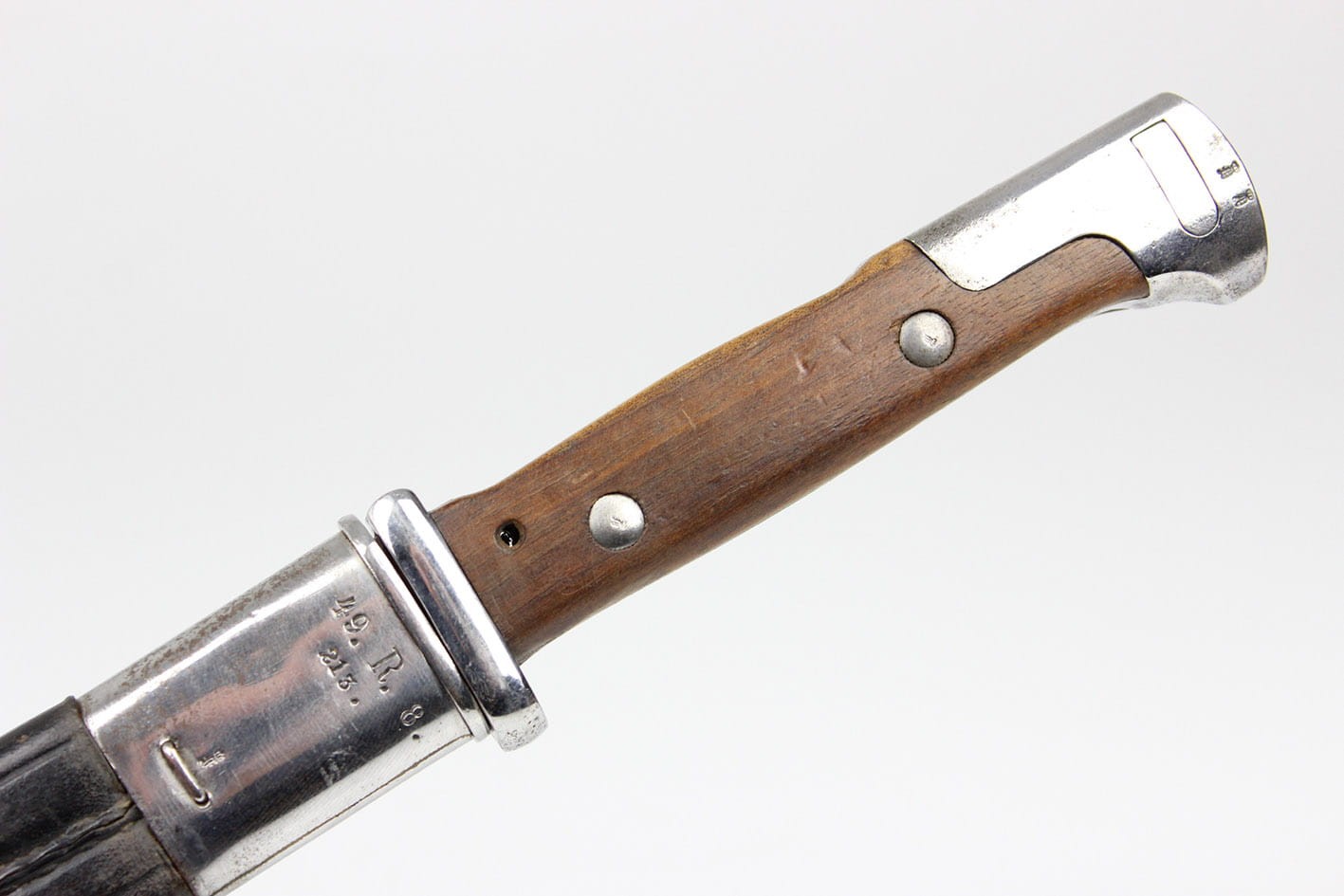 Oryginalny bojowy bagnet do mausera wzór S 84/98 altes art ze skórzaną pochwą stanowiący przeróbkę z bagnetu M71/84. Bagnet wprowadzony do użycia w latach 1908-1909, przeznaczony początkowo dla formacji rowerowych, powietrznych i kompanii karabinów maszynowych. Głowica rękojeści z oryginalnymi drewnianymi okładkami. Grzbiet profilowany, zamek sprawny. Na grzbiecie rękojeści oraz na zamkiem widoczne punce odbioru wojskowego. Głownia z płaskim obustronnym długim zbroczem. Na grzbiecie głowni litera W i datą 1889 oraz pruskim znakiem odbioru. Na progu tylnego płazu głowni nazwa wytwórni WEYERSBERG KIRSCHBAUM & Co SOLINGEN. Na przednim płazie głowni pięknie widoczna punca zakładów naprawczych Kgl Gewehrfabrik Danzig w Gdańsku: DANZIG pod koroną. Głownia jak i cały bagnet w pięknym stanie zachowania. z delikatnym szlifem bojowym. Pochwa oryginalna, skórzana ze stalowymi okuciami. Górne okucie sygnowane puncami 49 Pułku Piechoty ( 6 Pomorski ) stacjonującego w Gnieźnie ( Gnesen) . Szew kompletny, dławik trzyma mocno.