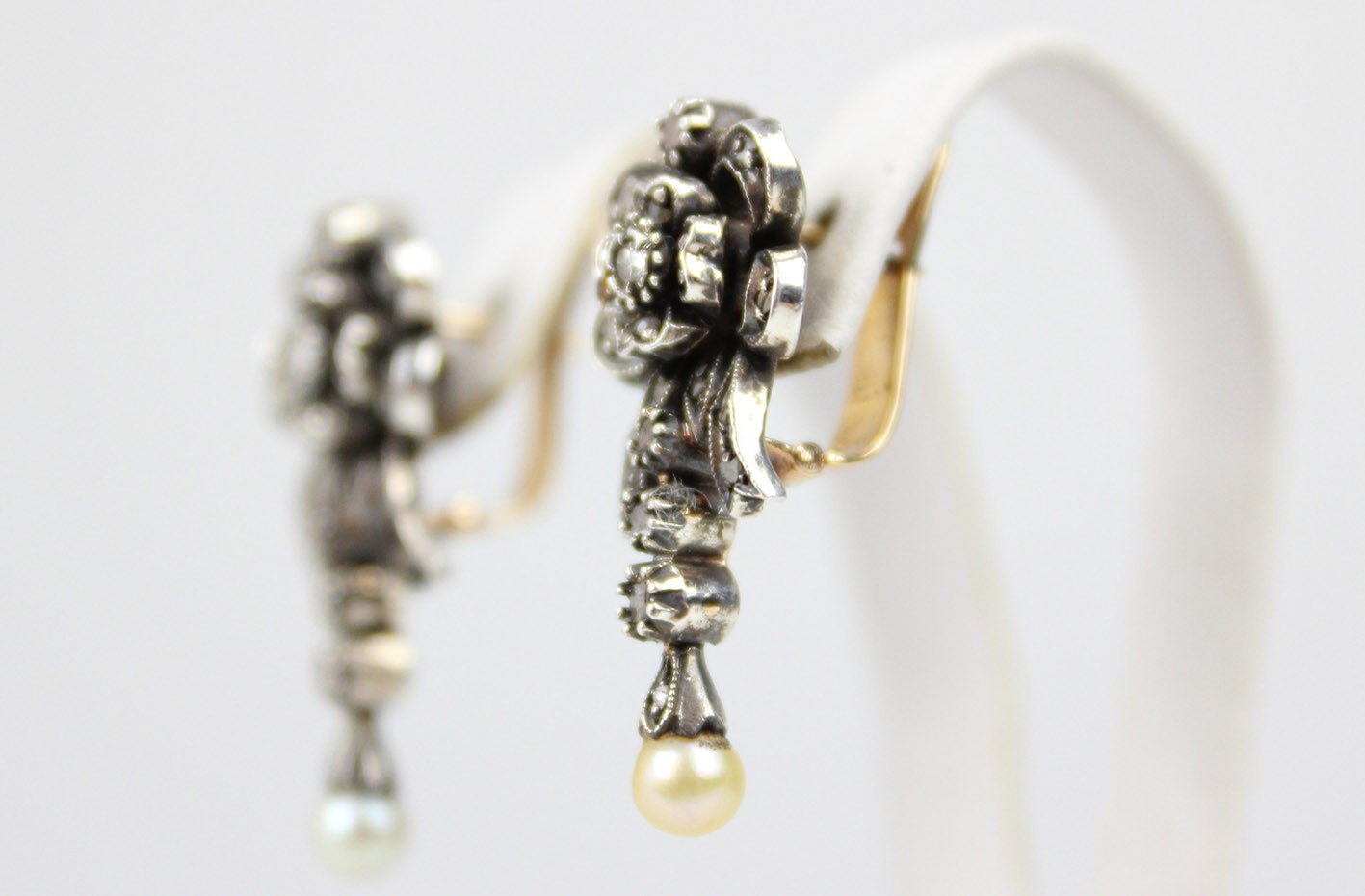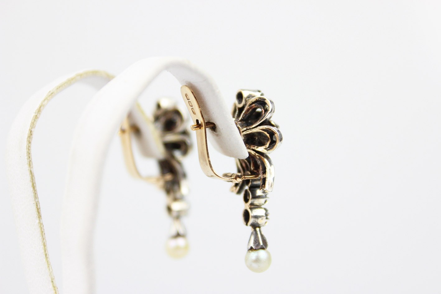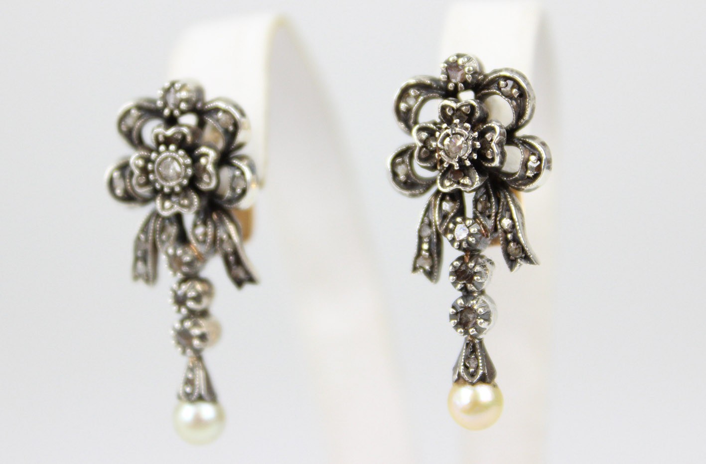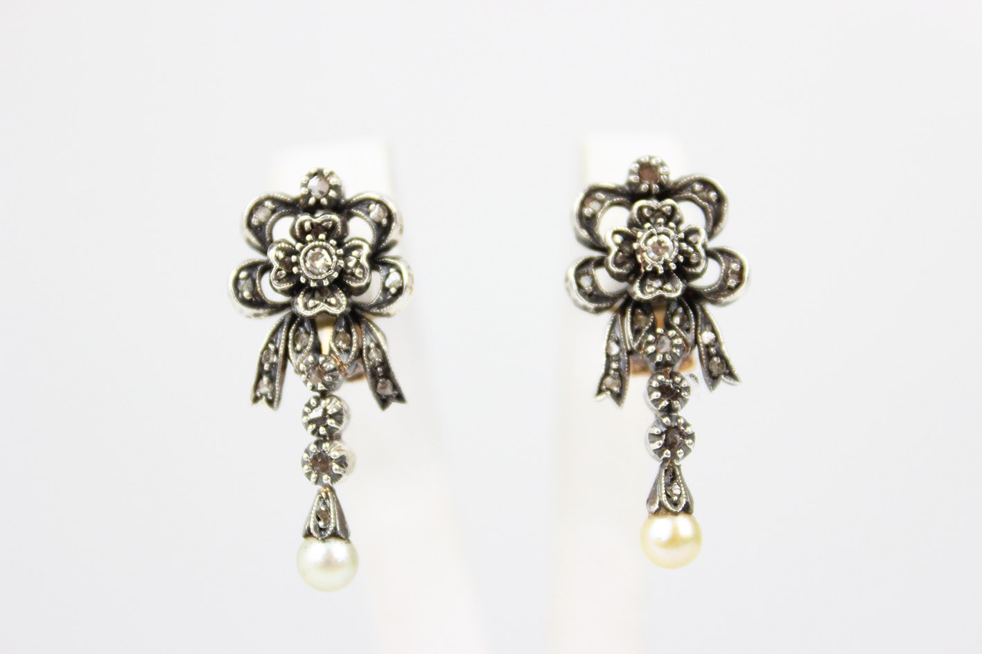 Para kolczyków wykonana w złocie próby 750 z elementami srebra 925. Forma utrzymana w stylistyce historyzującej, inspirowanej biżuterią przełomu XIX i XX wieku, jednak będąca wyrobem zdecydowanie bliższym współczesności. Kompozycja oparta na dekoracyjnym motywie kwiatowym o bogato rzeźbionej, przestrzennej formie z wyraźnie zaakcentowaną plastyką i detalem. Centralną część każdego kolczyka zdobią diamenty rozmieszczone w układzie rozetowym. Całość uzupełnia wiszący element w postaci jasnej, kulistej perły słonowodnej, nadającej kompozycji lekkości i eleganckiego charakteru. Kontrast pomiędzy chłodnym srebrem, ciepłym tonem złota oraz połyskiem kamieni i perły tworzy harmonijną, dekoracyjną całość. W kolczykach znajduje się czterdzieści diamentów formie okrągłej w szlifie fasetowym, rozetowym oraz 8/8 . Łączna wyliczona masa diamentów wynosi około 0,20 ct. Kolczyki wyposażone są w wygodne i bezpieczne zapięcia wykonane ze złota próby 750. Stan zachowania bardzo dobry. W komplecie certyfikat rzeczoznawcy jubilerskiego. Wymiary: