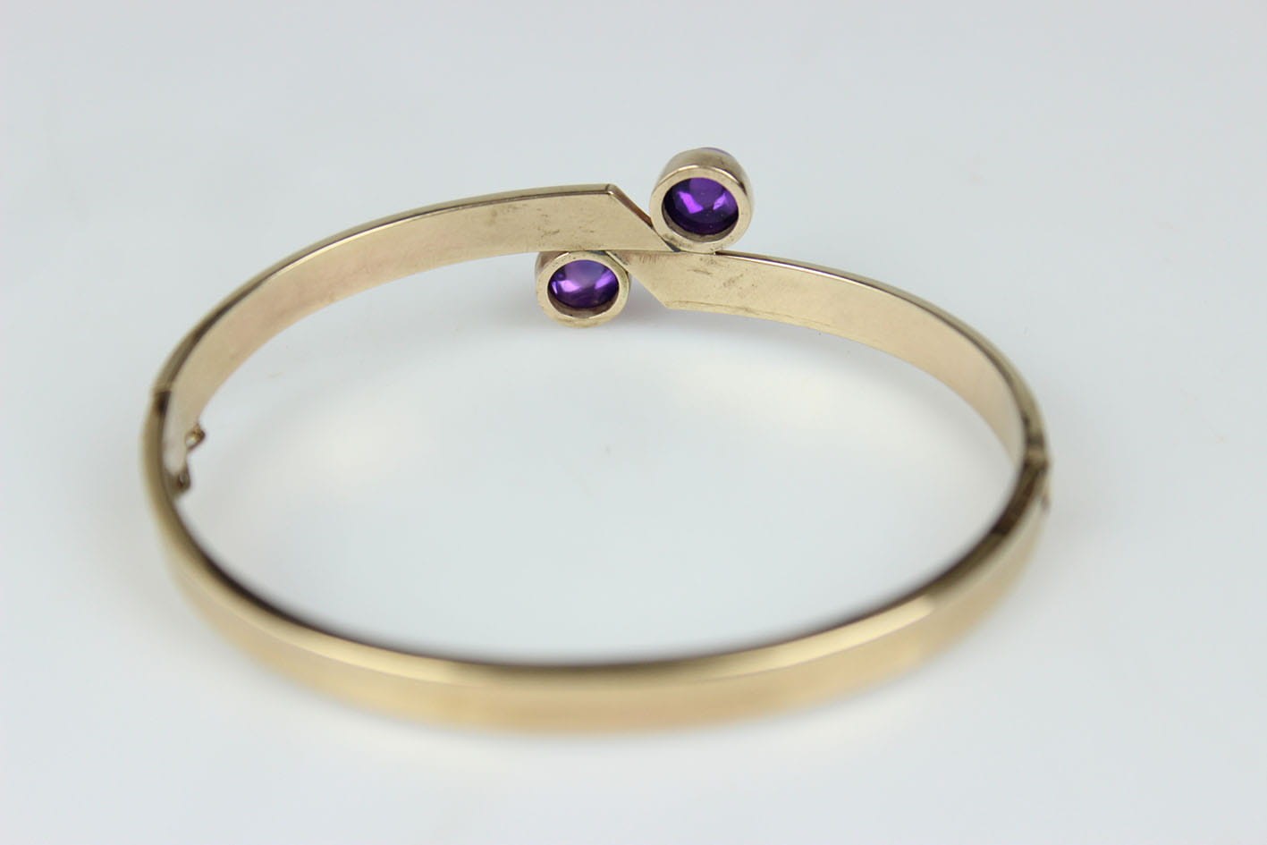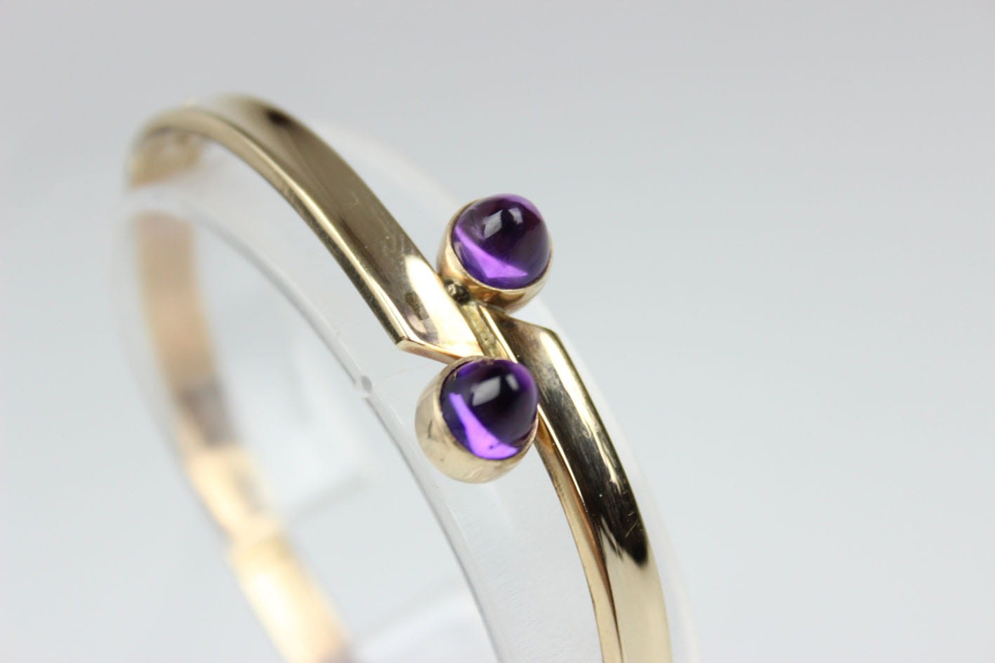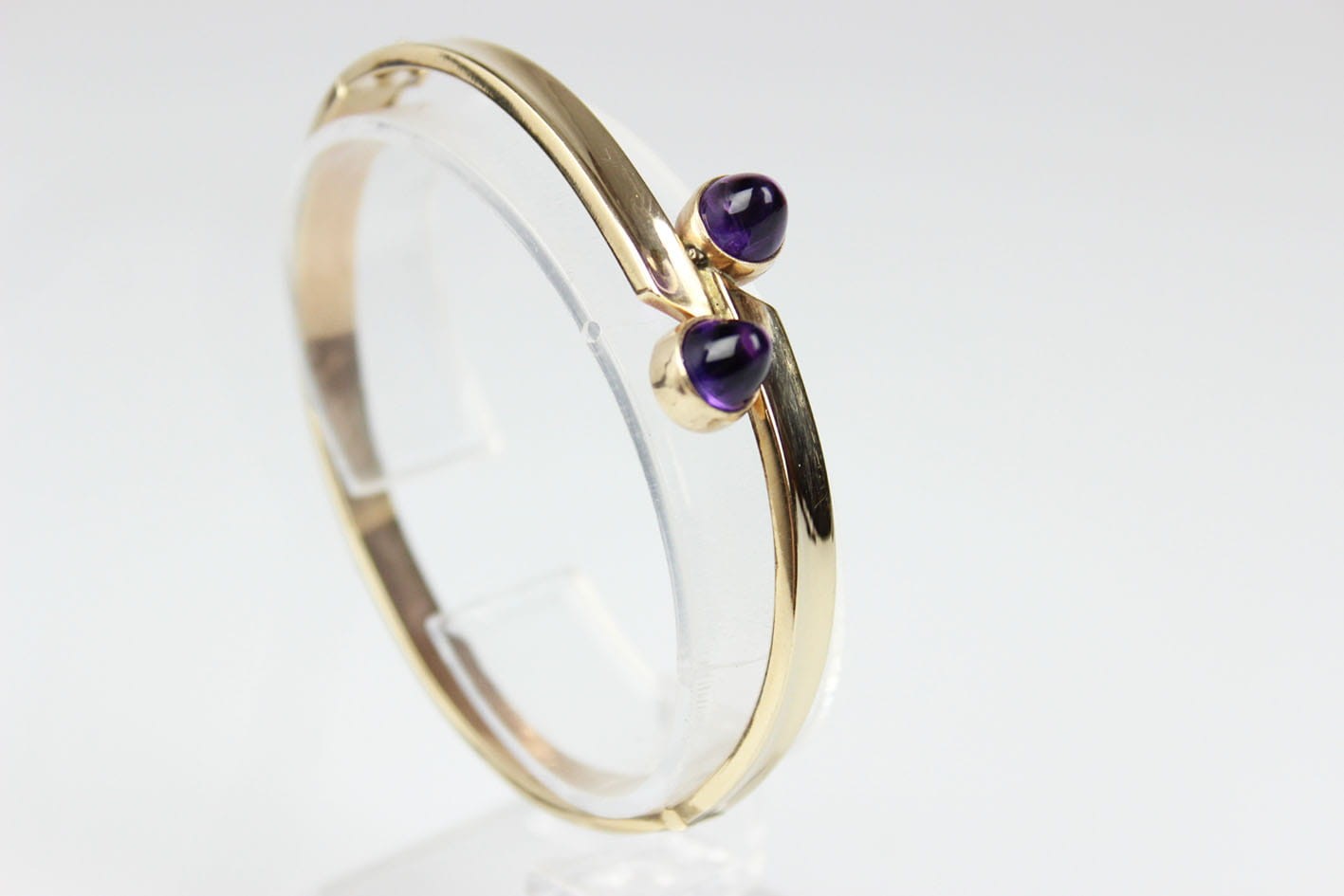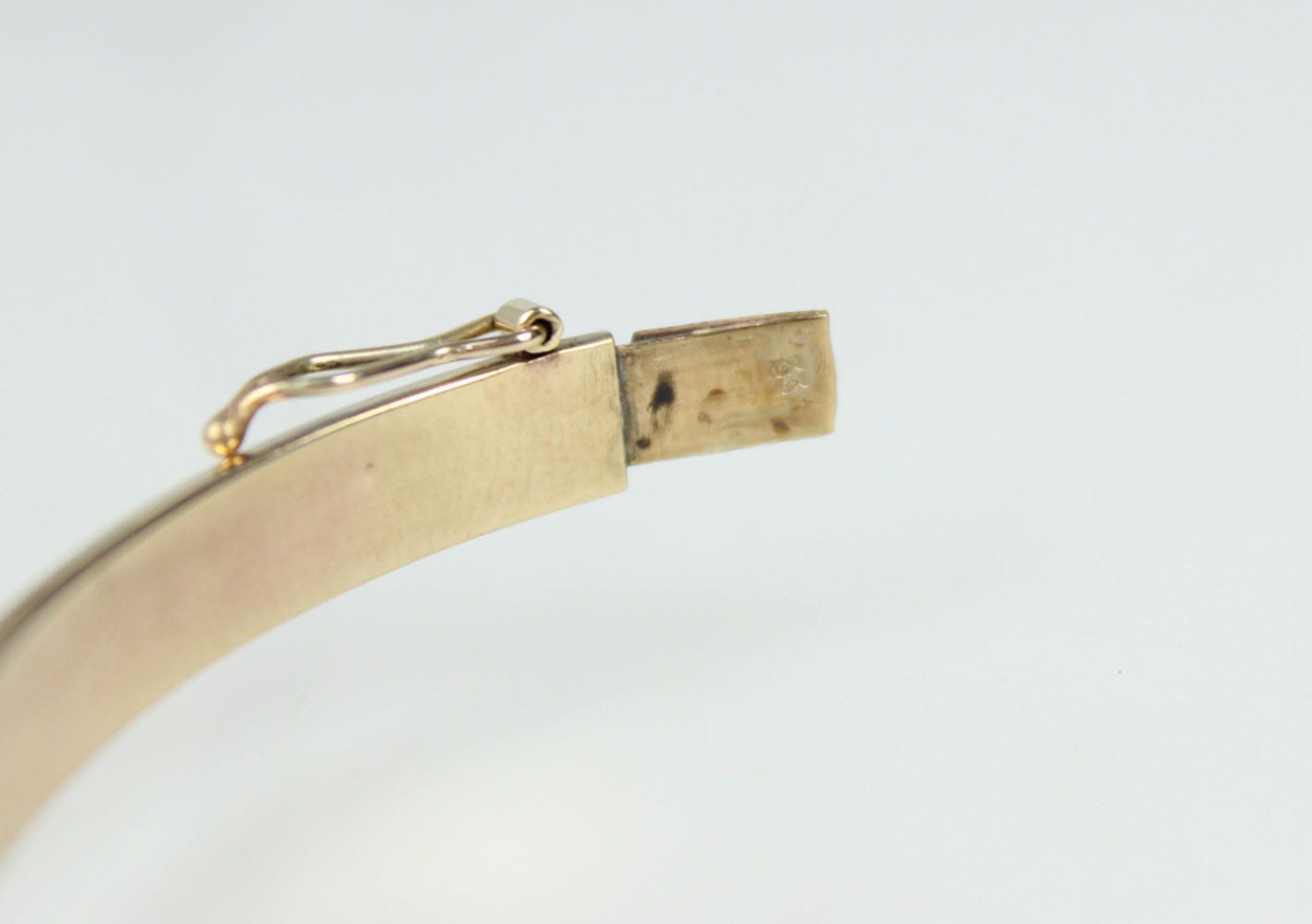 Elegancka, sztywna bransoletka pochodząca z lat 60/70 tych XX wieku. Konstrukcja eliptyczna, dwuczęściowa zamykana zapięciem szufladkowym z dodatkowym zabezpieczeniem w postaci ósemki. Podstawa w ośmiokaratowym złocie, sygnowana na szufladzie puncą 333 oraz inicjałami artysty. Bransoletka w bardzo dobrym stanie zachowania. Wymiary: