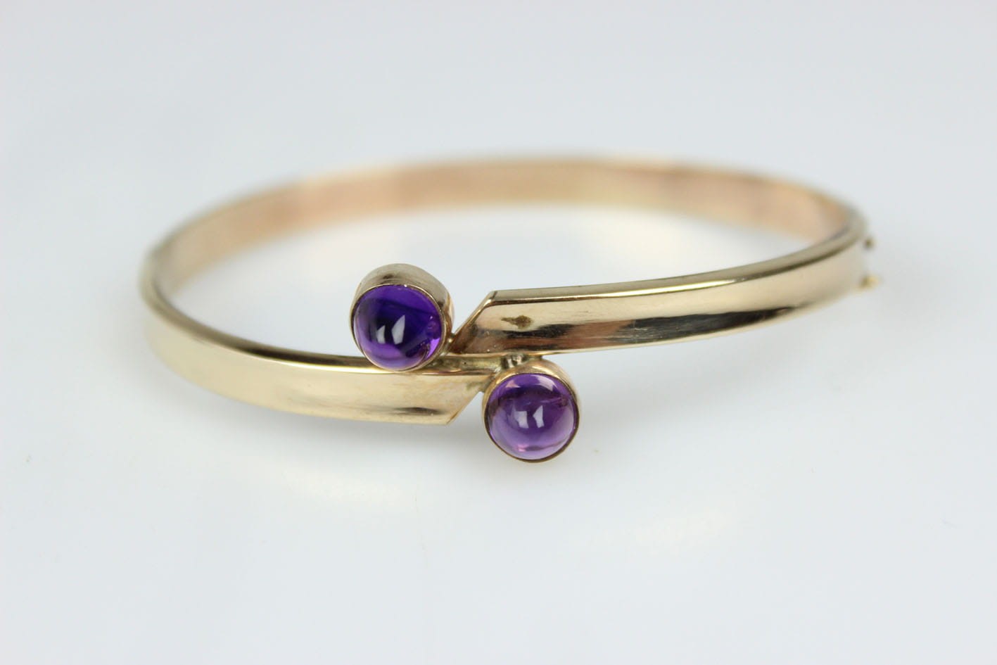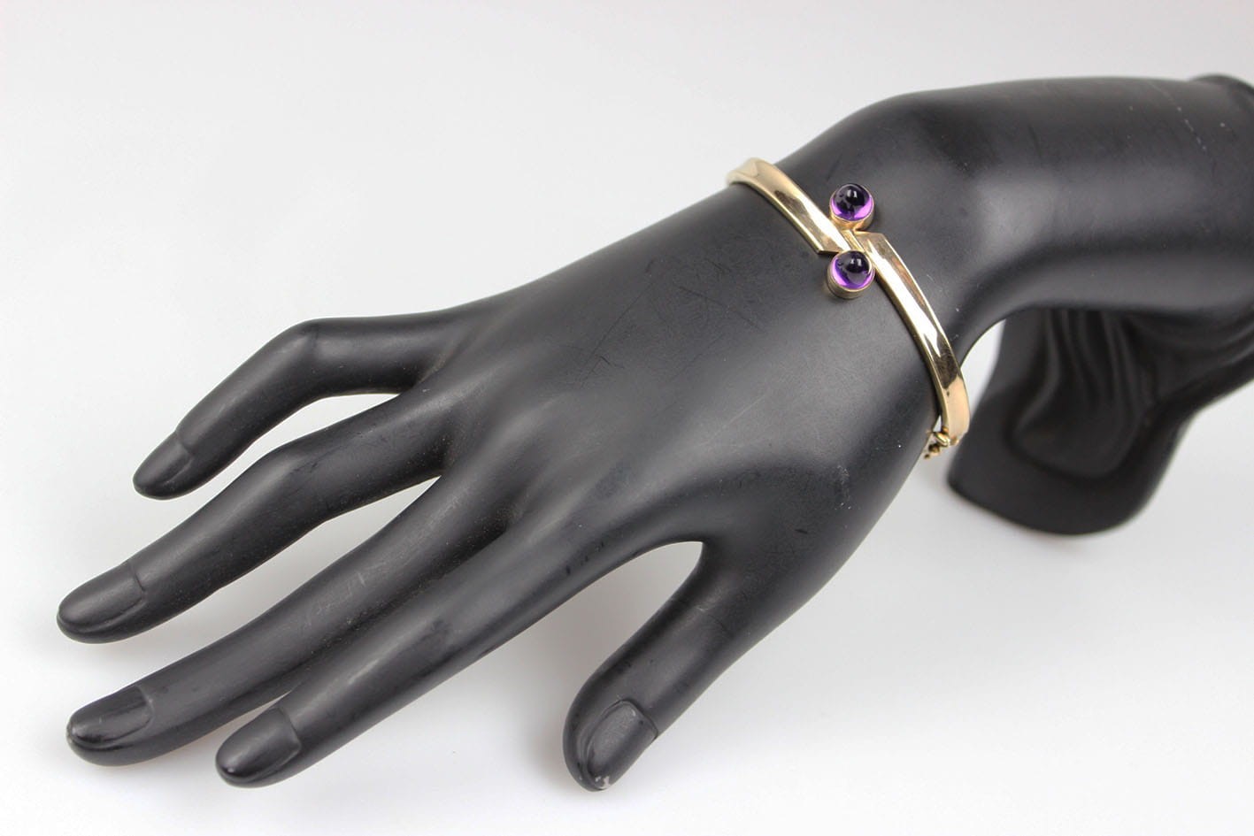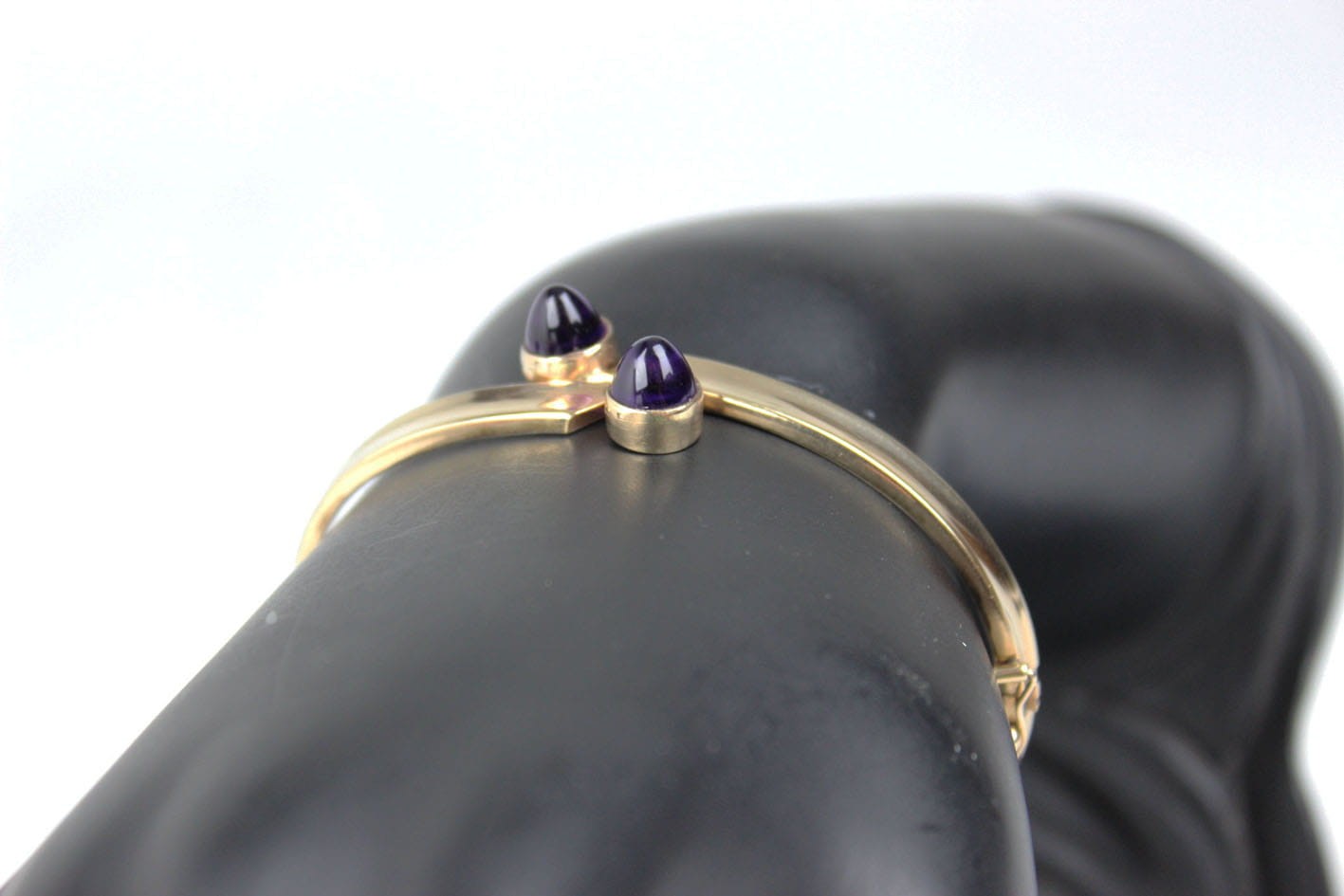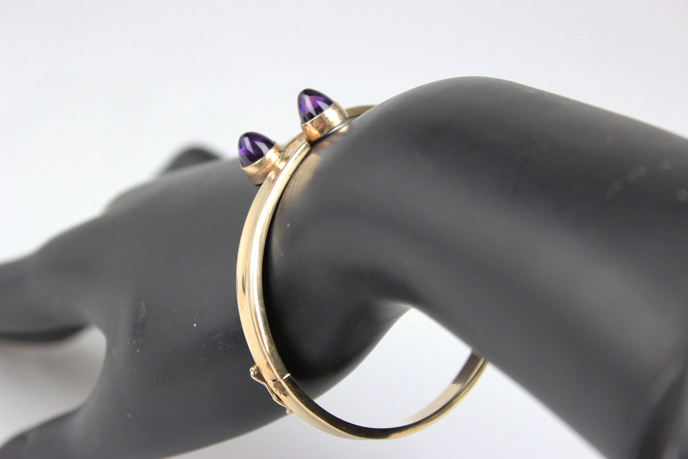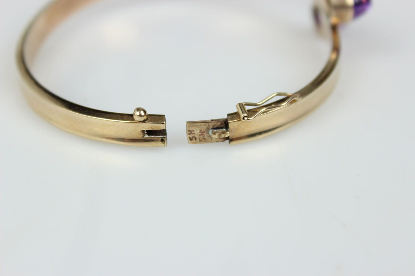 Elegancka, sztywna bransoletka pochodząca z lat 60/70 tych XX wieku. Konstrukcja eliptyczna, dwuczęściowa zamykana zapięciem szufladkowym z dodatkowym zabezpieczeniem w postaci ósemki. Podstawa w ośmiokaratowym złocie, sygnowana na szufladzie puncą 333 oraz inicjałami artysty. Bransoletka w bardzo dobrym stanie zachowania. Wymiary: