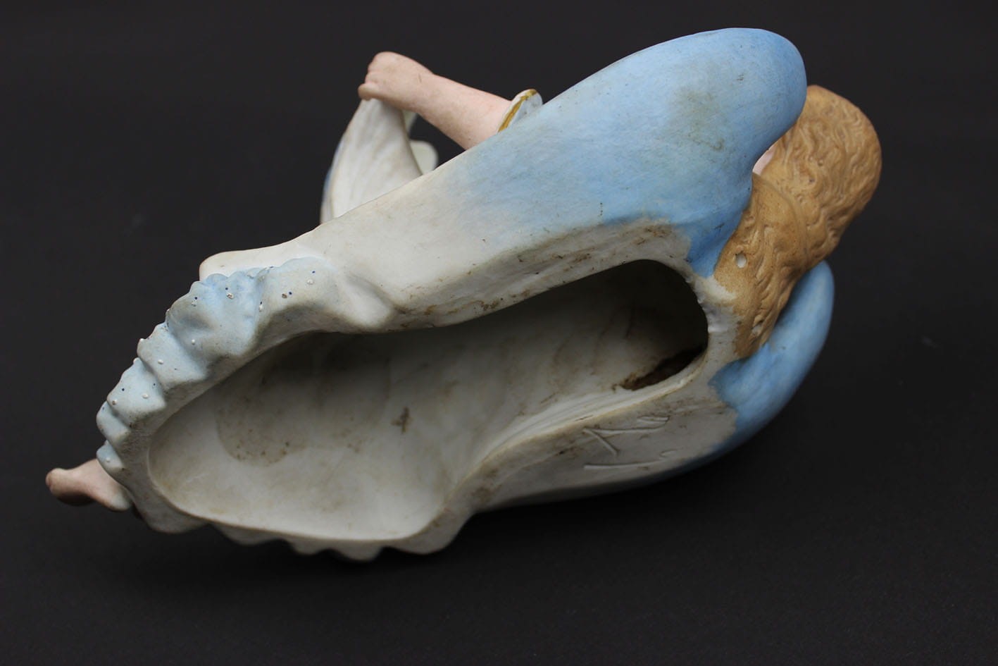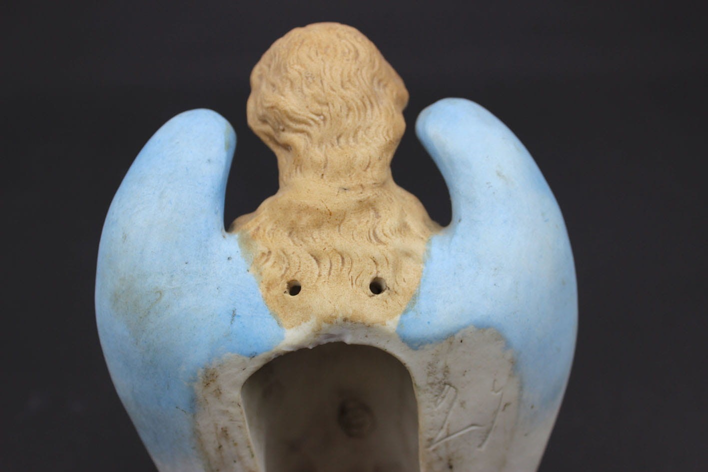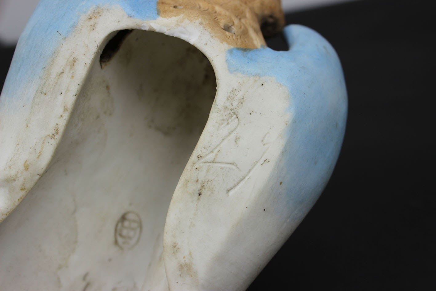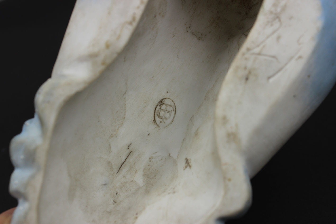 Niezwykle okazała i masywna kropielnica wykonana na Śląsku pod koniec XIX wieku. Wyrób biskwitowy sygnowany puncą wytwórcy oraz numerami na tyle podstawy. Całość w bardzo dobrym stanie zachowania, bez pęknięć lub ubytków. Całość w autentycznej patynce i kurzu. Nie myta i nie czyszczona. Wymiary: